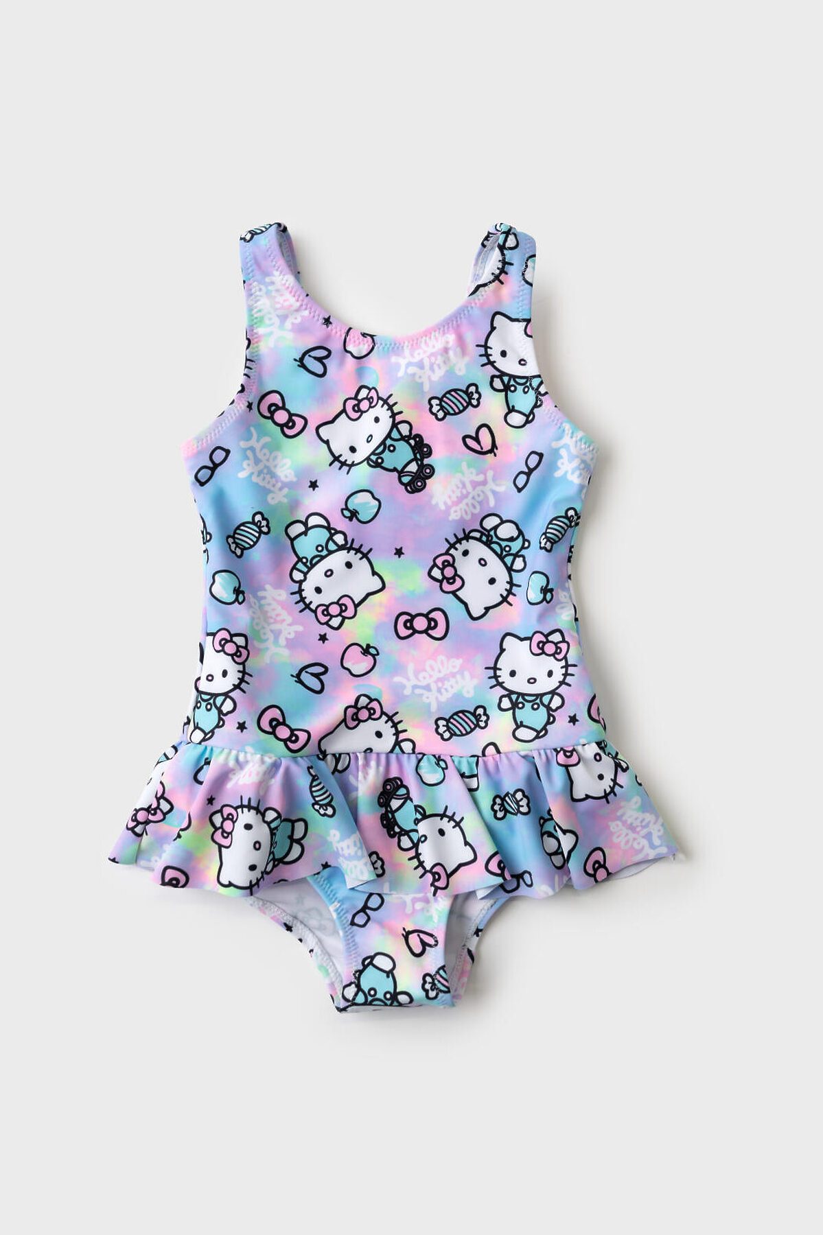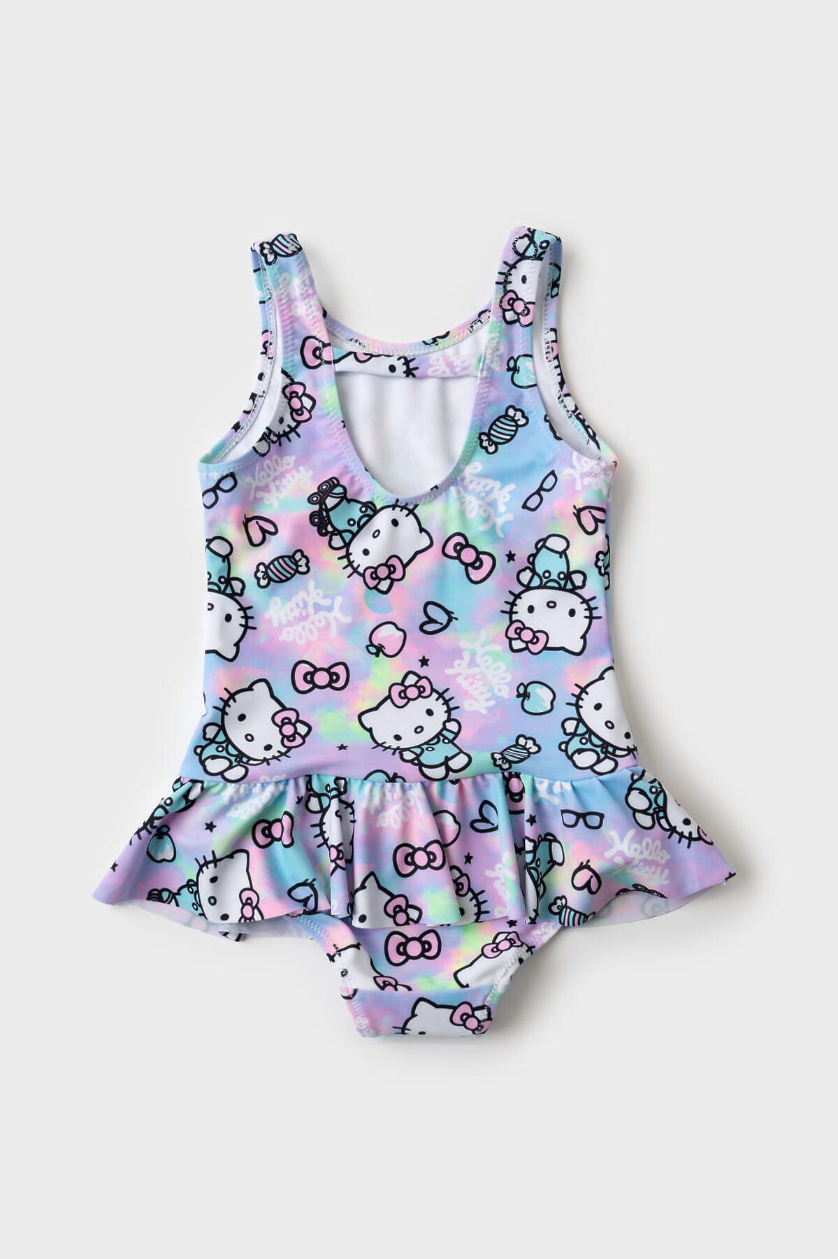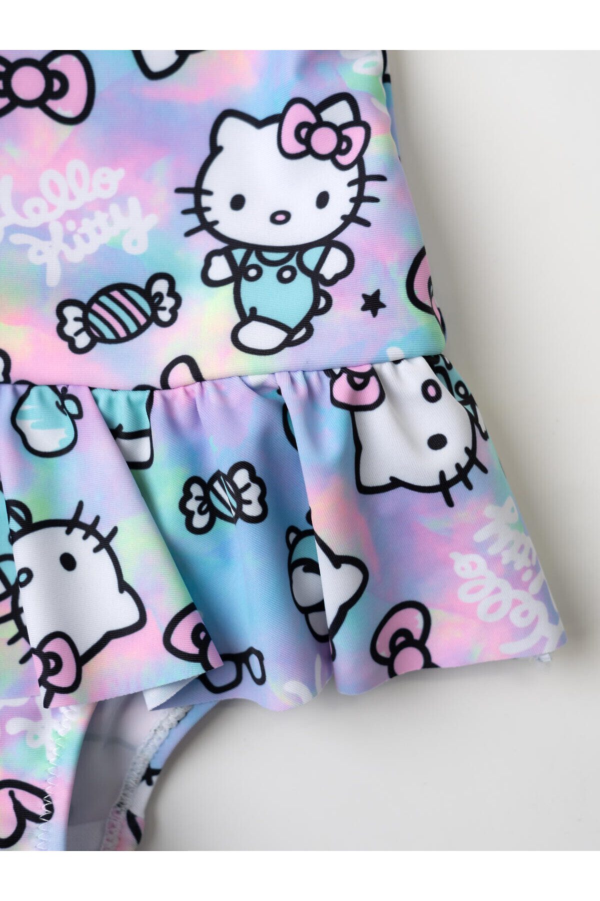 Cлитный детский купальник с ярким дизайном Hello Kitty для девочки. Купальник выполнен в пастельных оттенках с принтом, где изображены Hello Kitty, конфетки, бантики и надписи. По линии талии — декоративная юбочка, которая делает образ ещё более нежным. У купальника открытая спинка с эластичной полоской. Внутри — подкладка. Все края обработаны эластичной тесьмой, чтобы изделие хорошо сидело на теле и не натирало. Благодаря UF-защите, ткань сохраняет первоначальный вид даже при длительном пребывании на солнце. Подходит для плавания и активного отдыха.