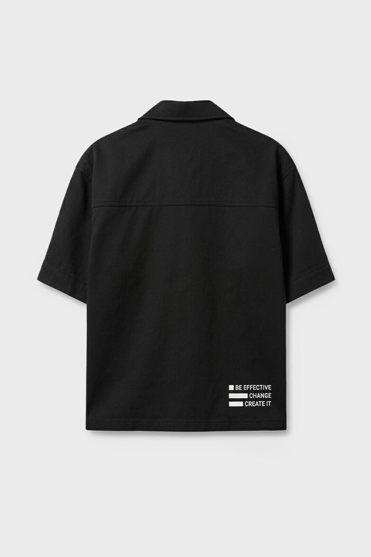 Рубашка оверсайз для мальчика подростка. Модель свободного кроя с короткими рукавами, выполненная из хлопковой ткани. Спереди два накладных кармана, воротник классической формы. Застежка — на кнопках. На спинке — стильный принт.