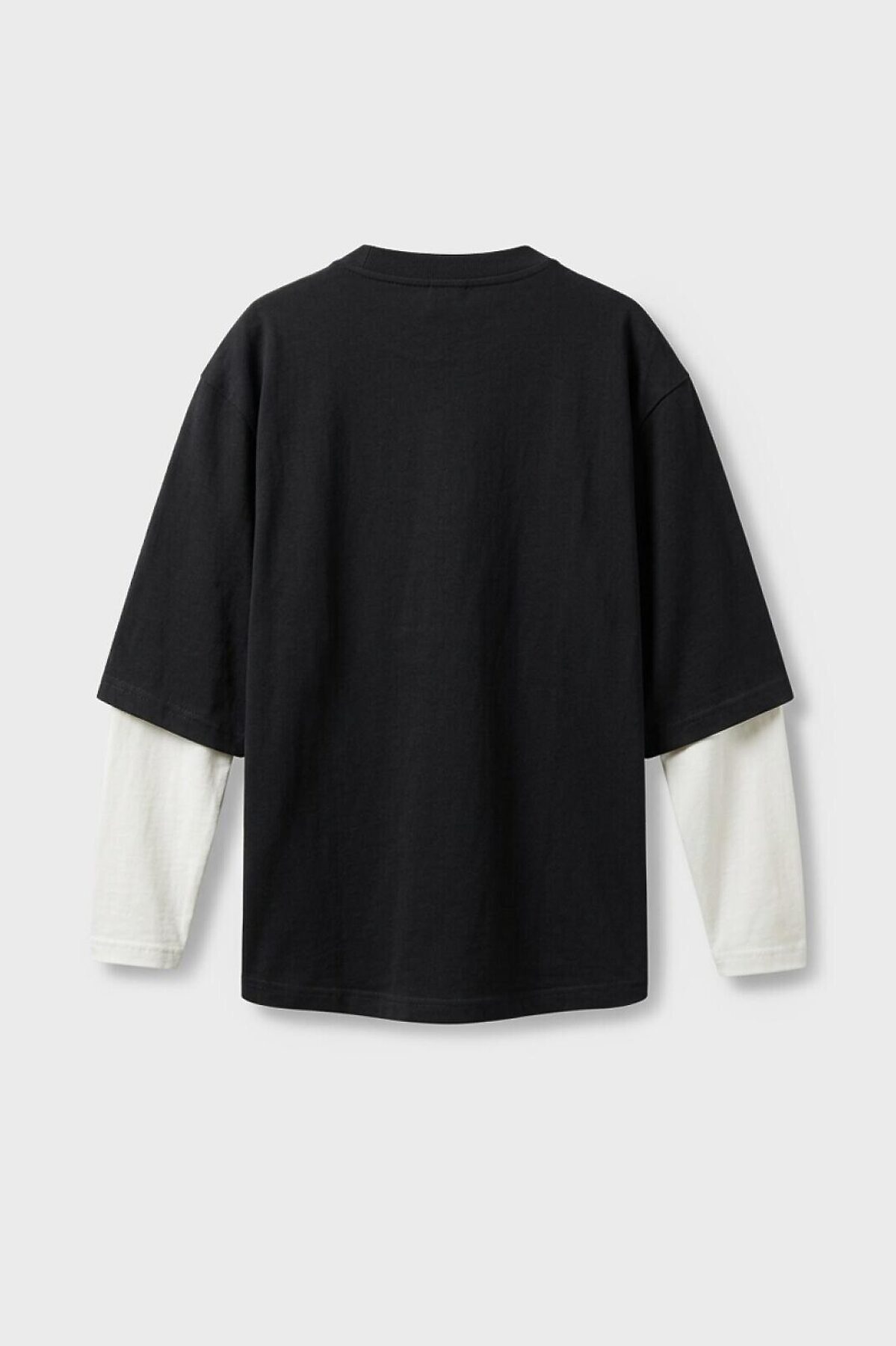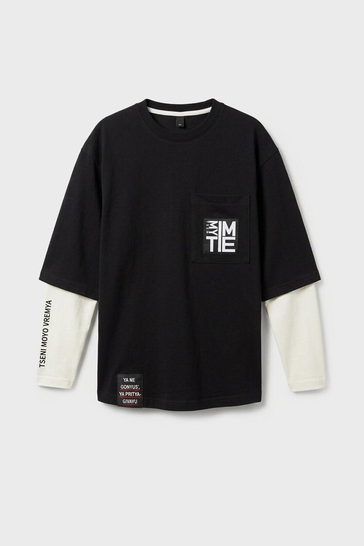 Лонгслив оверсайз для мальчика подростка. Модель свободного кроя с длинными рукавами выполнена из мягкого трикотажа с высоким содержанием хлопка. Изделие выполнено в чёрном цвете с контрастными белыми вставками на рукавах, создающими эффект двухслойности. На груди карман с графичным логотипом, а на правой рукаве — надпись. В нижней части изделия — объёмный шеврон с цитатой. Ворот оформлен эластичным рибом.