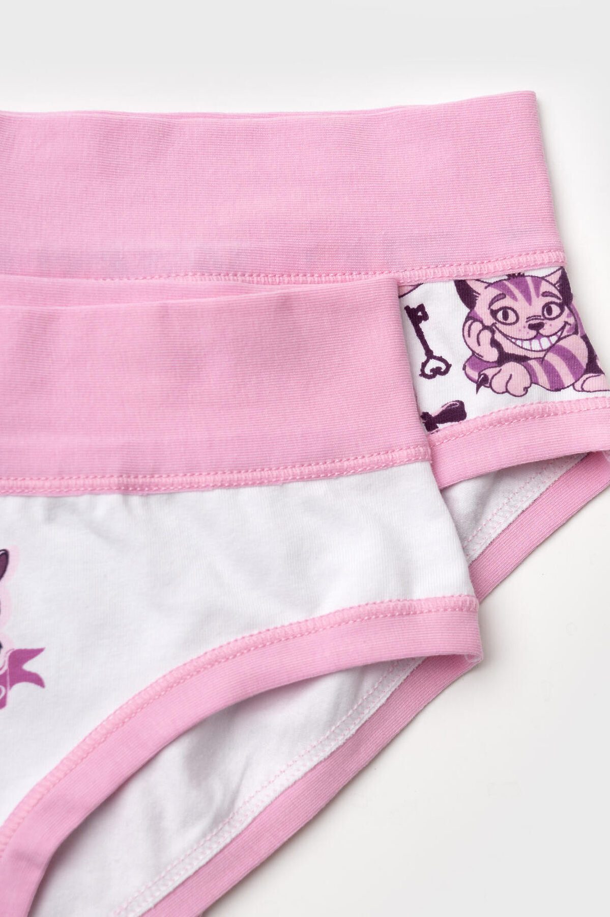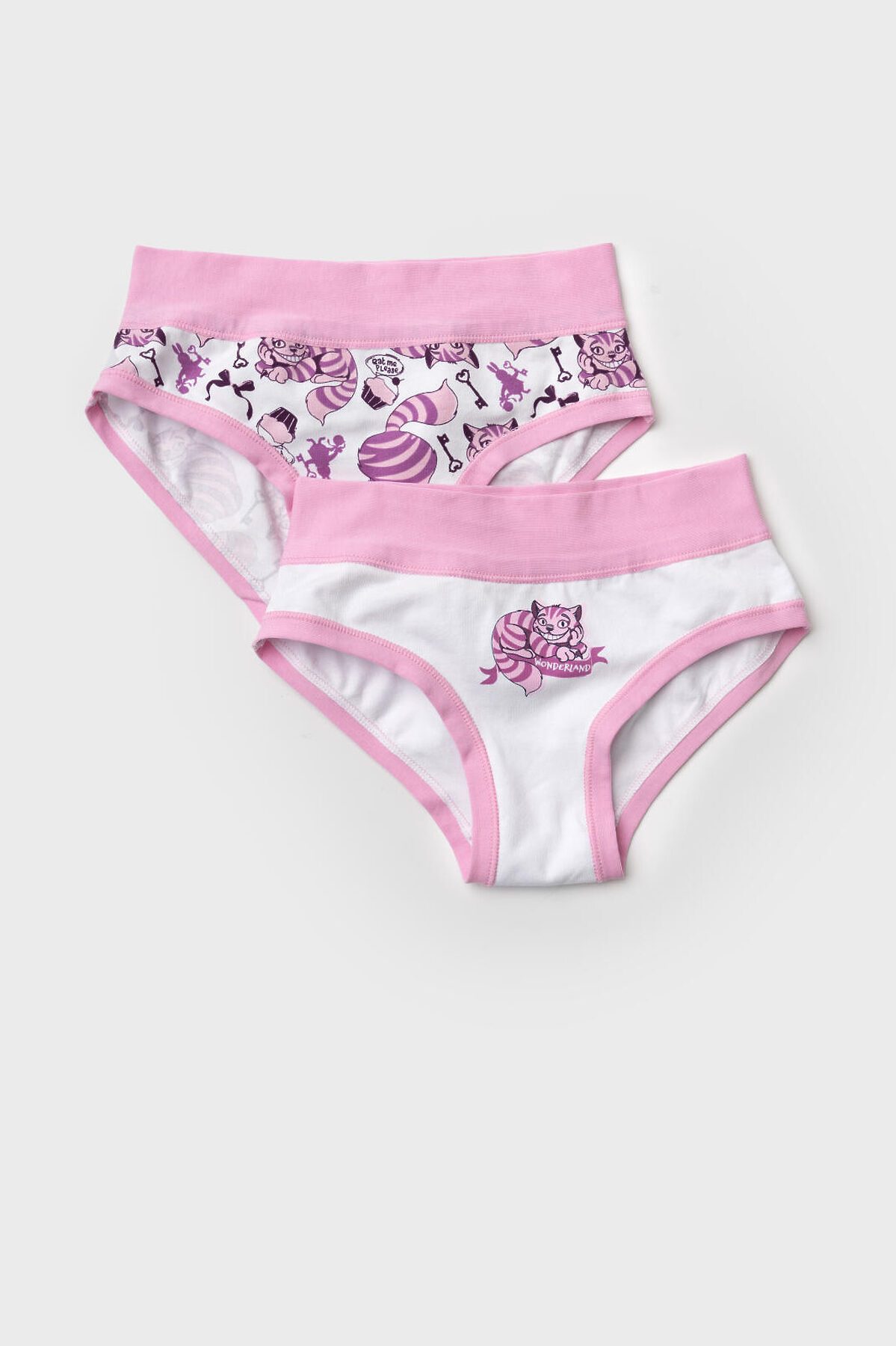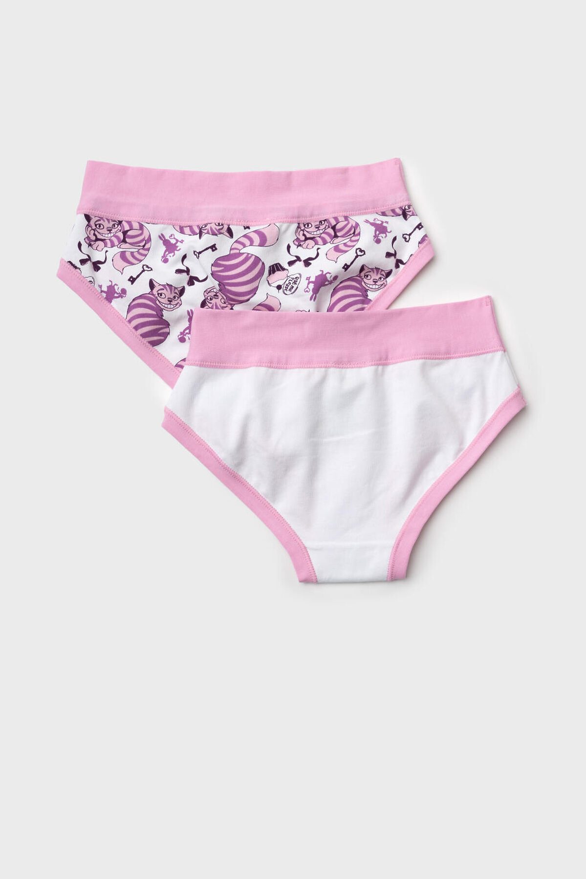 Набор из двух трусов-брифов для девочки подростка. Дизайн с любимым мультяшным героем - котом Чеширом. Изделия выполнены из мягкого эластичного трикотажа, с широкой розовой резинкой по поясу и окантовкой по вырезам для ног. Внутри предусмотрена ластовица.
