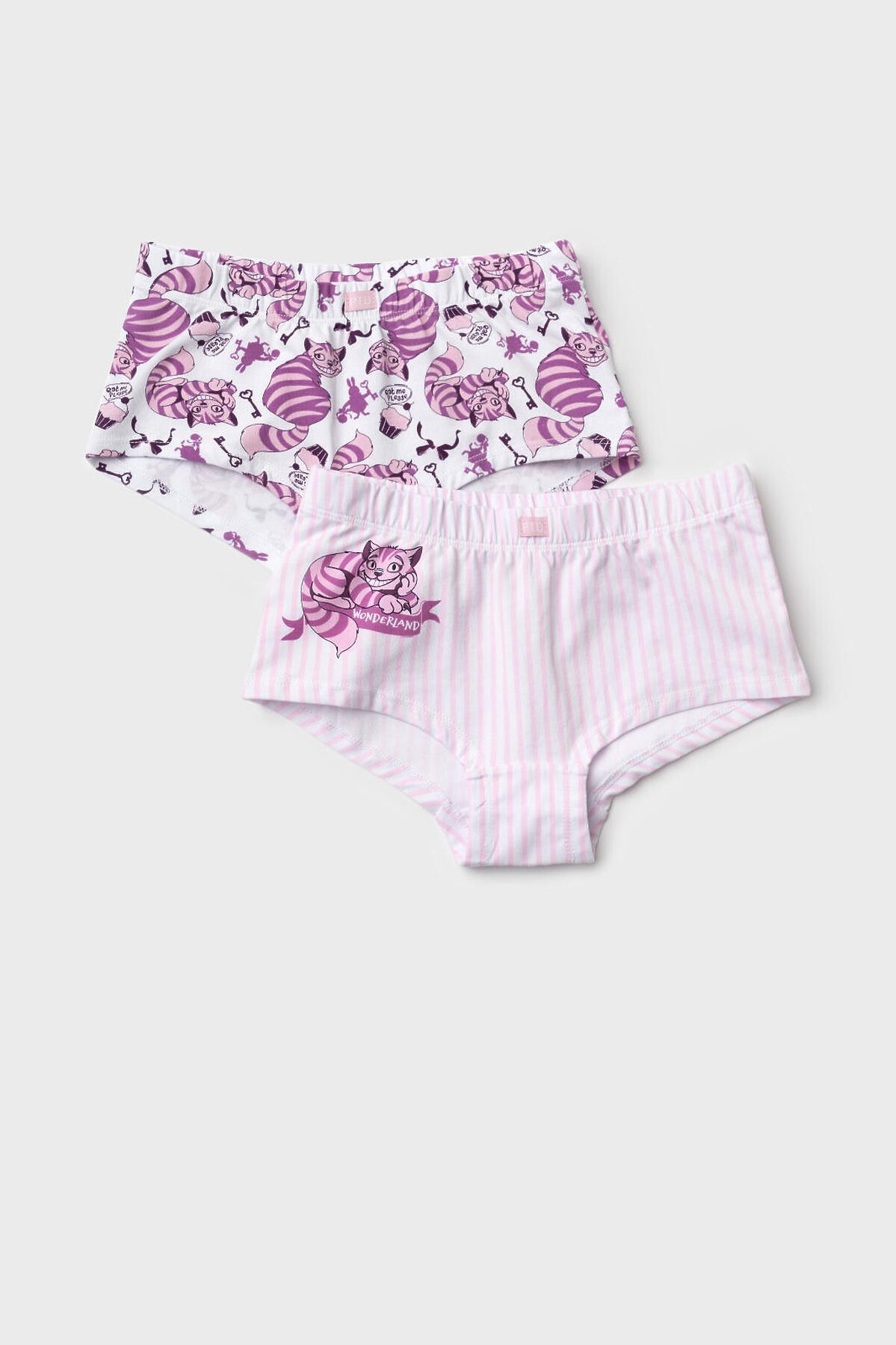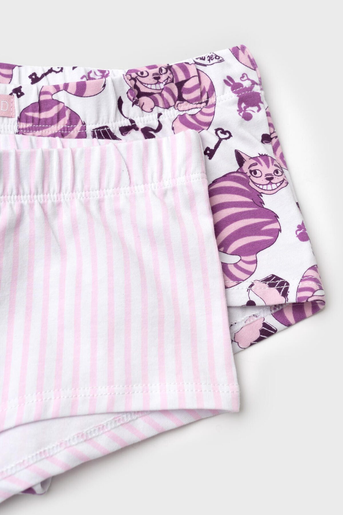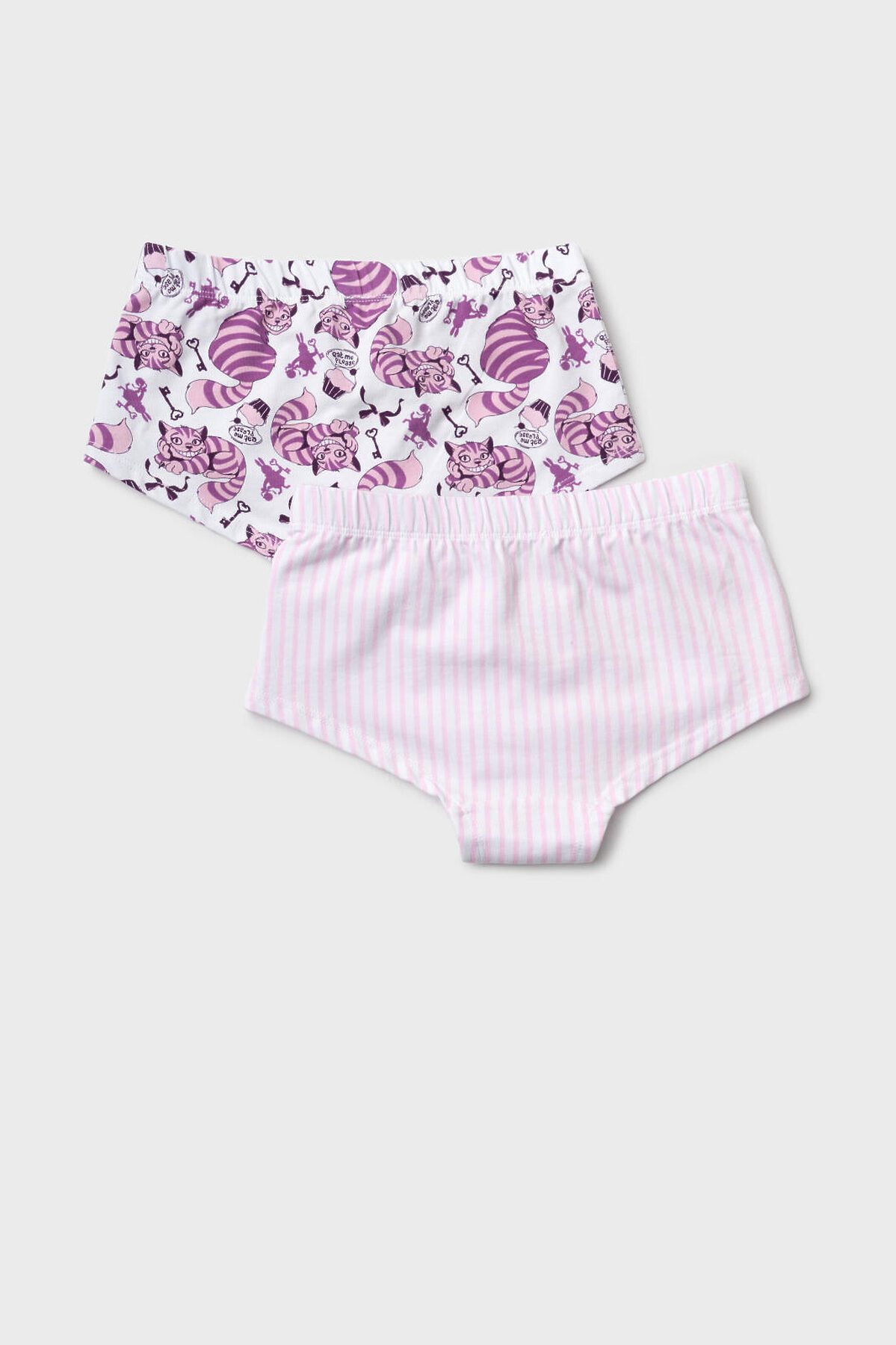 Набор из двух трусов-шорт для девочки подростка. Дизайн с любимым мультяшным героем - котом Чеширом. Изделия выполнены из мягкого эластичного трикотажа, с широкой резинкой по поясу и окантовкой по вырезам для ног. Внутри предусмотрена ластовица.