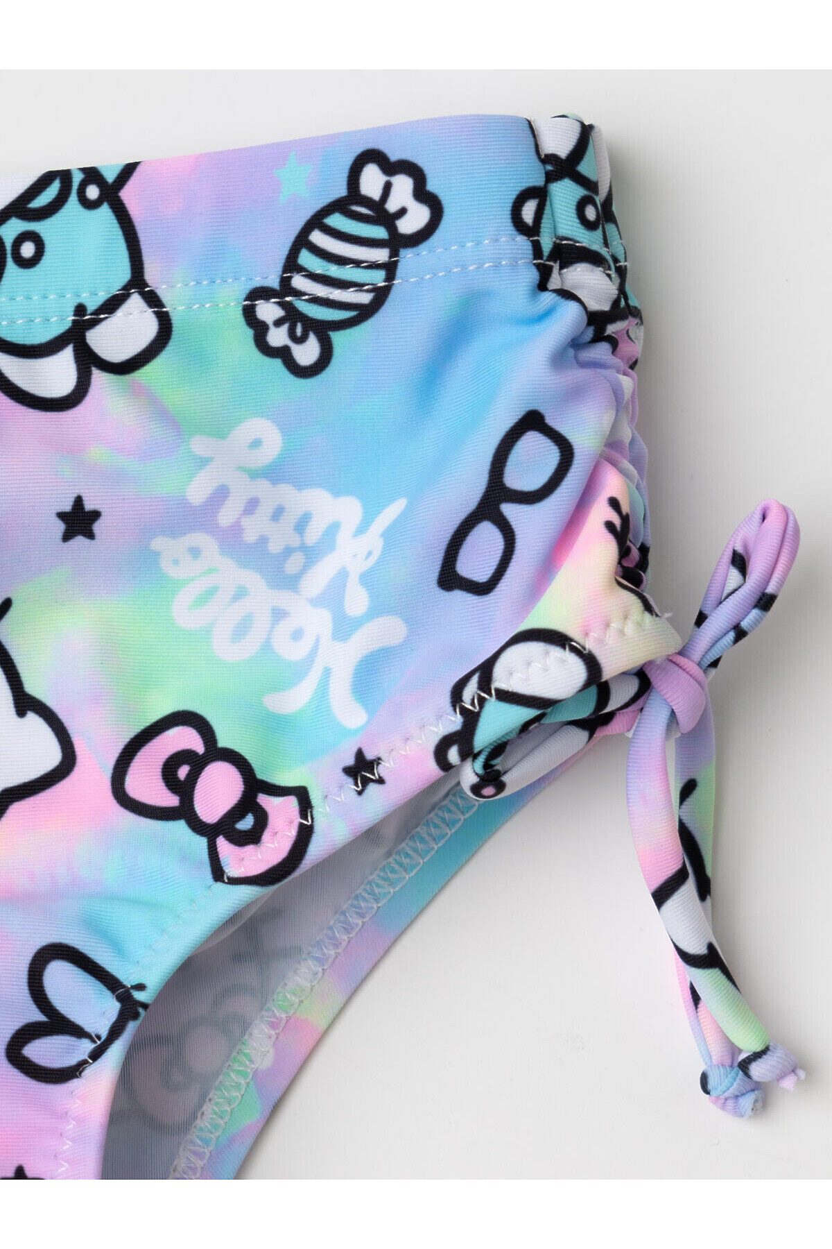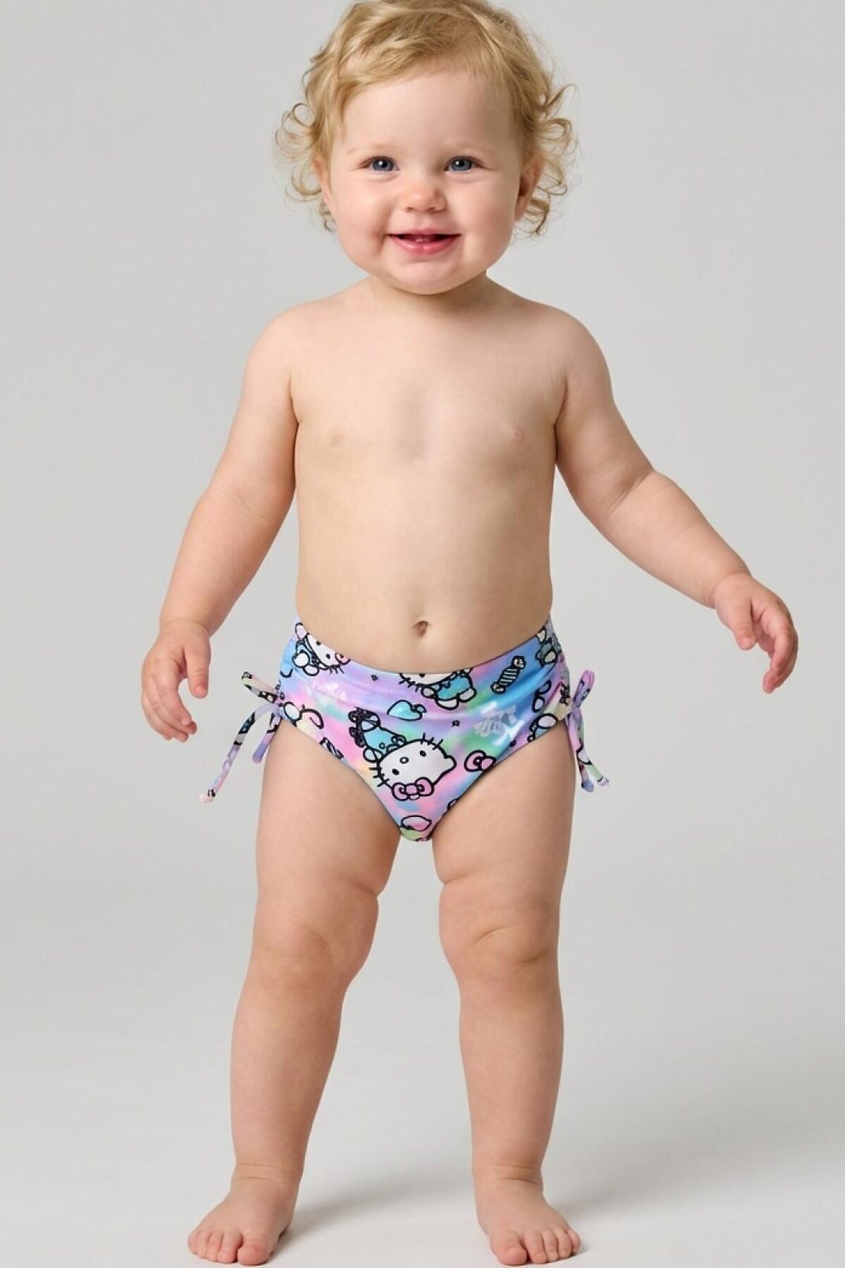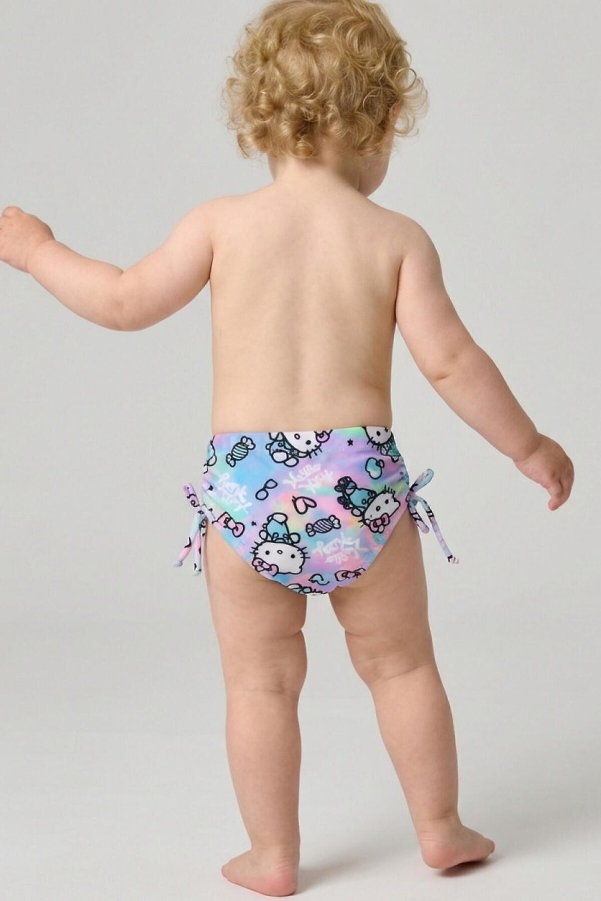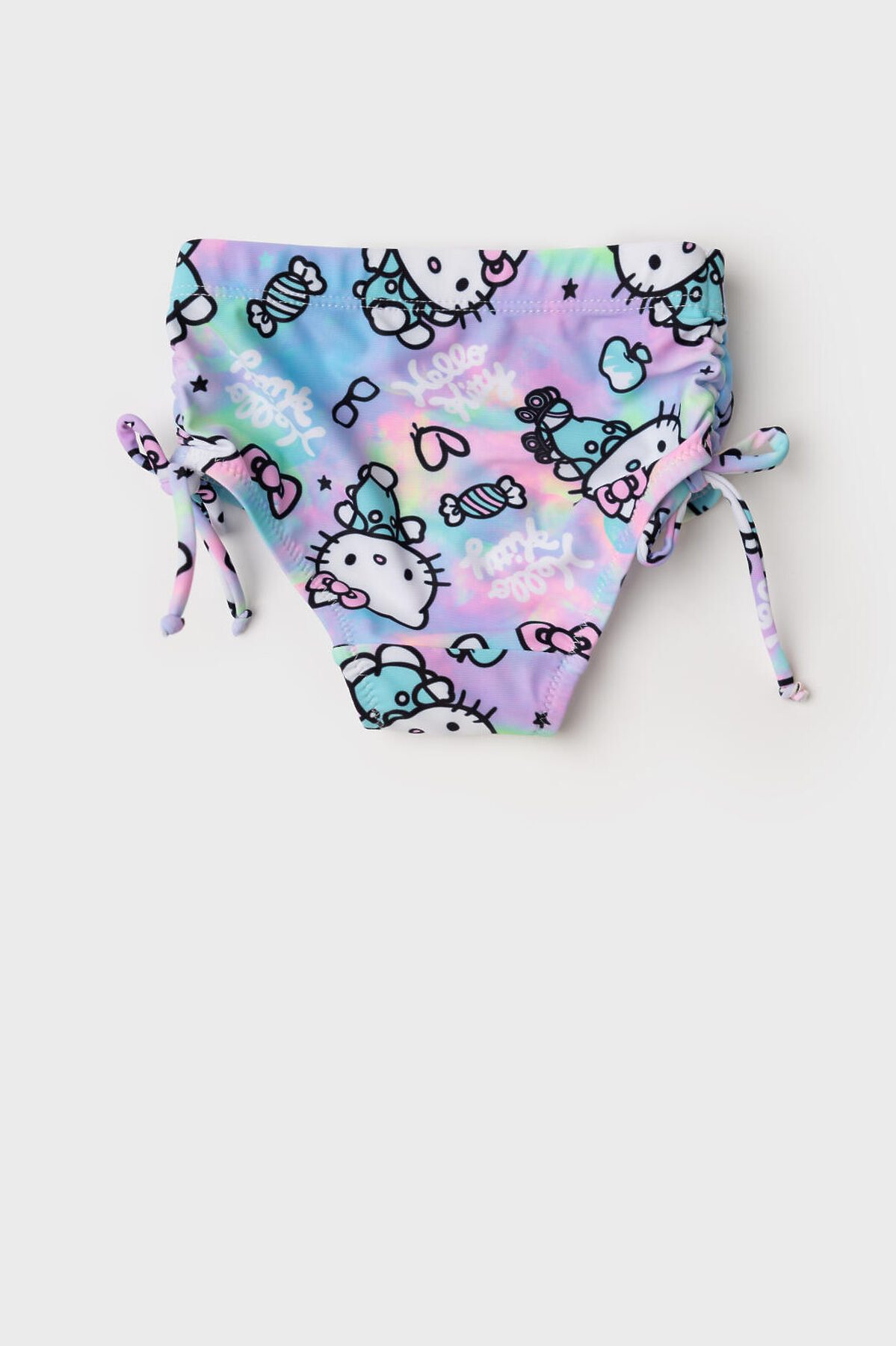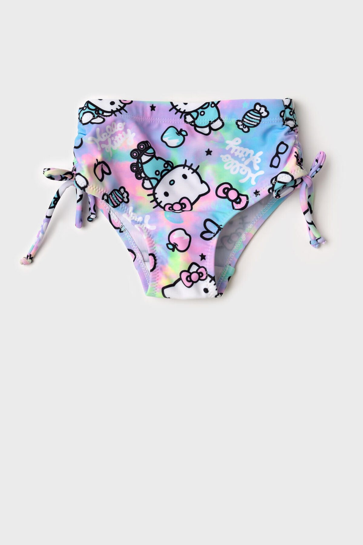 Детские плавки для девочки. Модель выполнена из эластичного трикотажа с принтом Hello Kitty. Украшены боковыми завязками-бантиками. По талии и вырезу ножек вшиты мягкие резинки, чтобы изделие хорошо сидело. Внутри — светлая подкладка. Благодаря UF-защите, ткань сохраняет первоначальный вид даже при длительном пребывании на солнце. Идеально подходят для пляжа или бассейна.