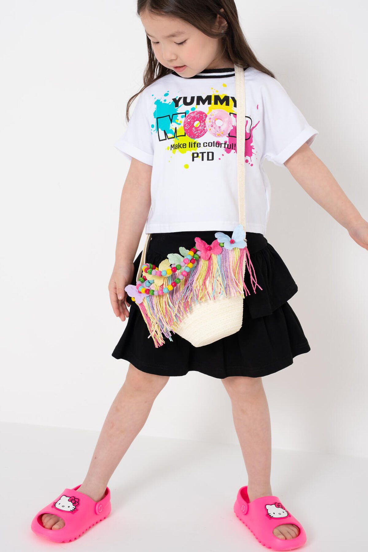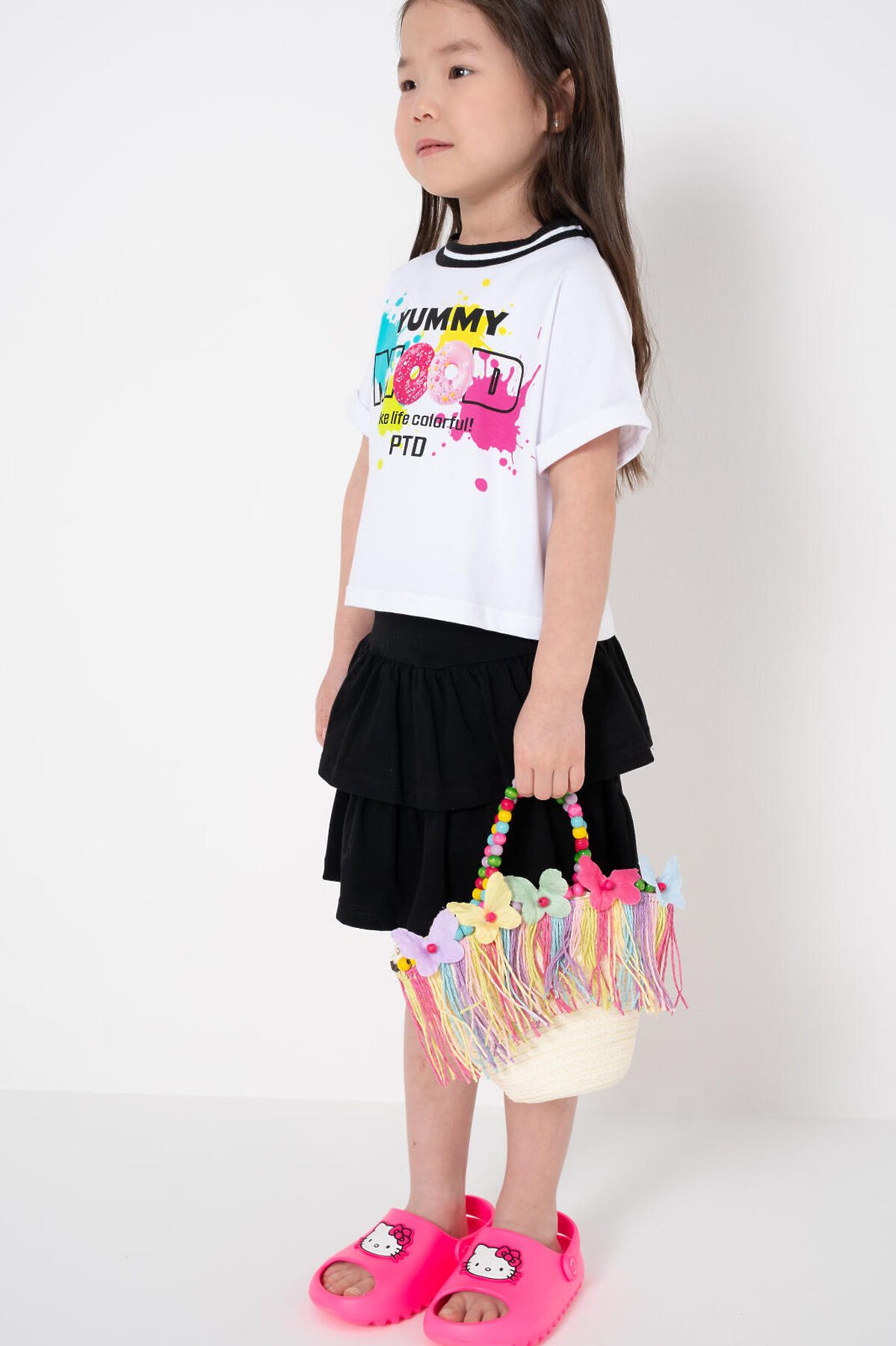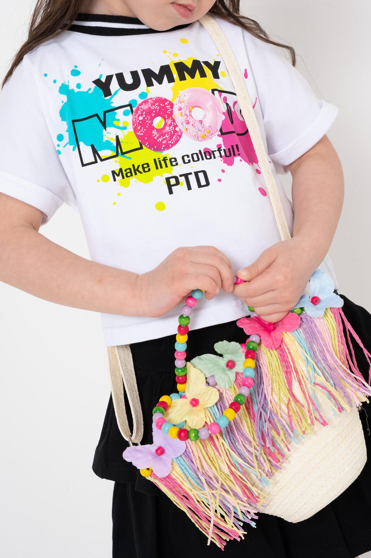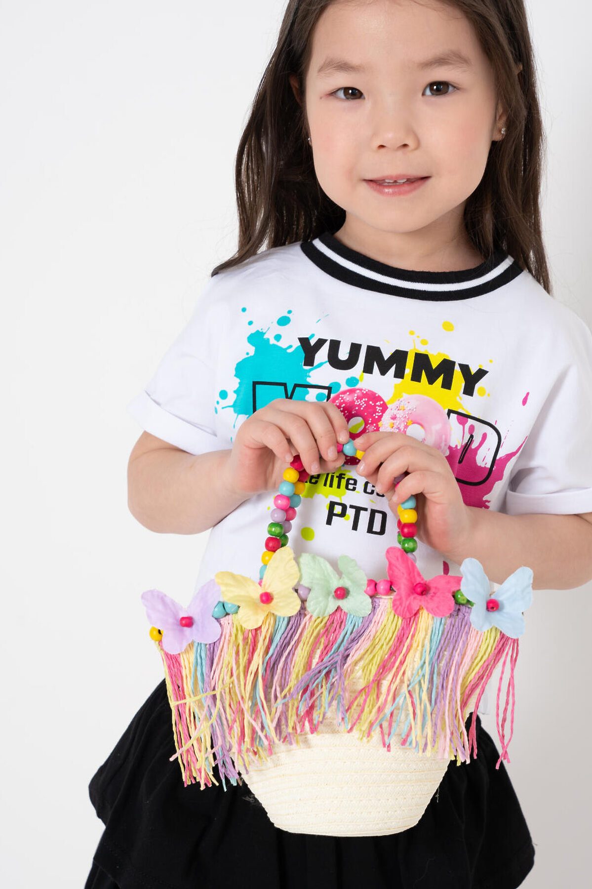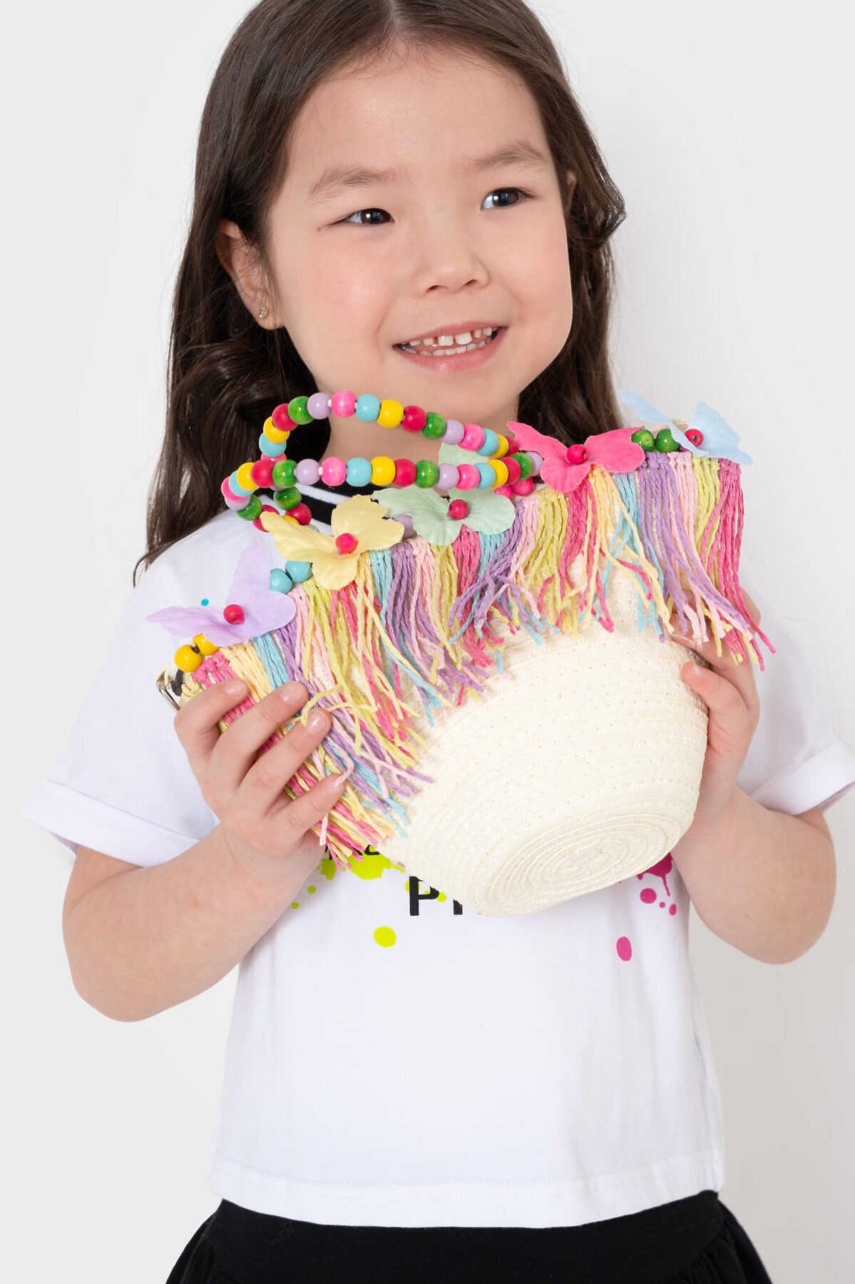 Оригинальная пляжная сумка кросс-боди для девочки. Сумочка-корзинка из искусственной рафии декорирована объемными бабочками и бахромой, короткие ручки - деревянные бусы. Плечевой ремень регулируется. Сумка имеет одно отеделение, которое закрывается на кнопку. Параметры сумки: высота - 18 см, ширина - 25 см, глубина - 8 см