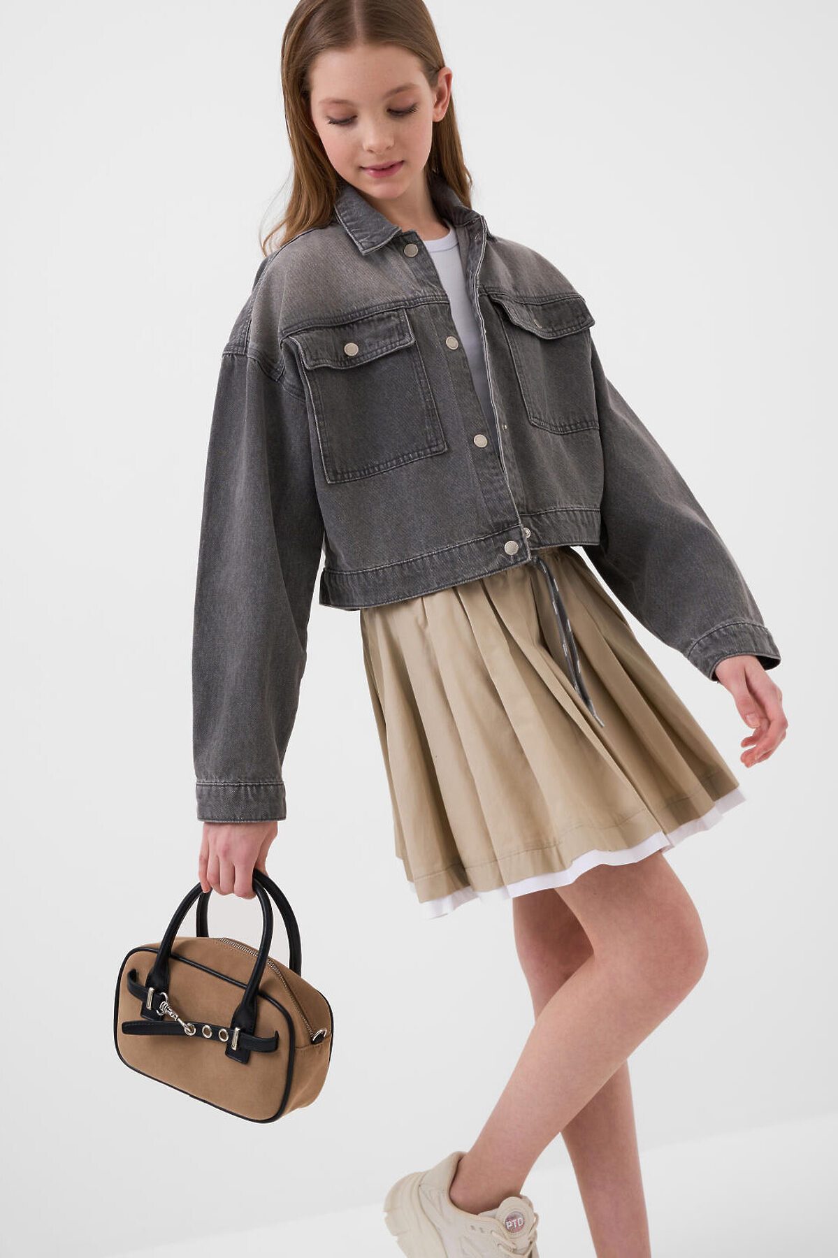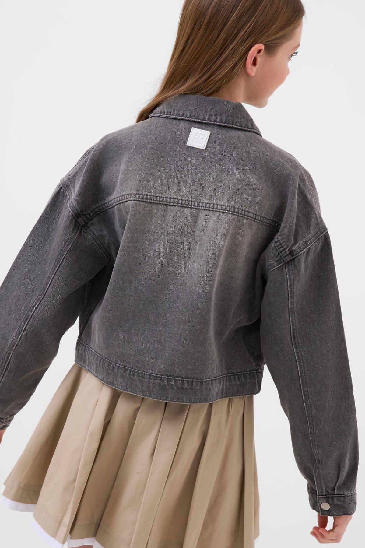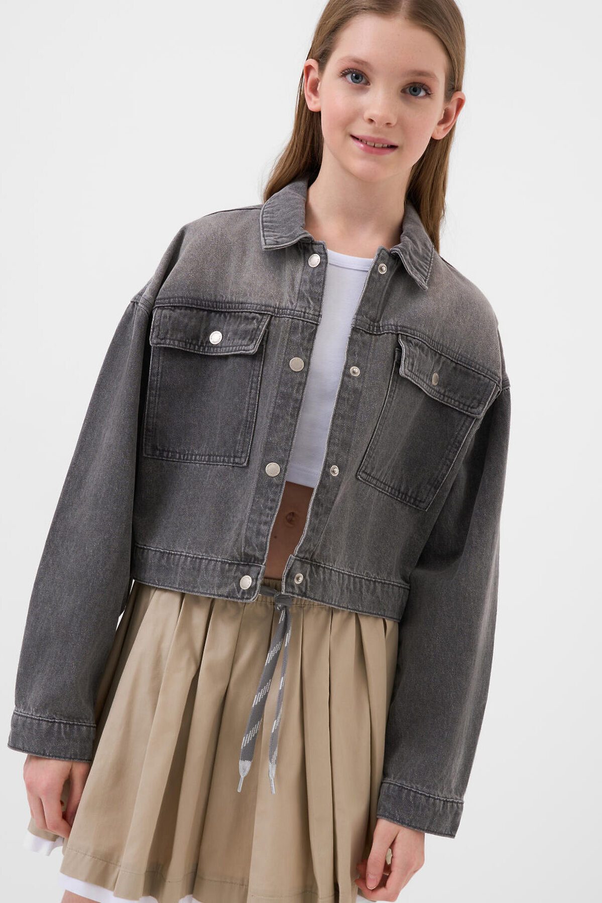 Джинсовая куртка для девочки подростка. Модель выполнена из плотного варёного денима серого цвета. Куртка свободного кроя, длина — чуть выше талии. Спереди расположены два накладных кармана на кнопках. Застежка по центру — на металлических кнопках. Рукава с манжетами на кнопках. Спинка украшена декоративной нашивкой. Низ куртки оформлен необработанным срезом с бахромой.
