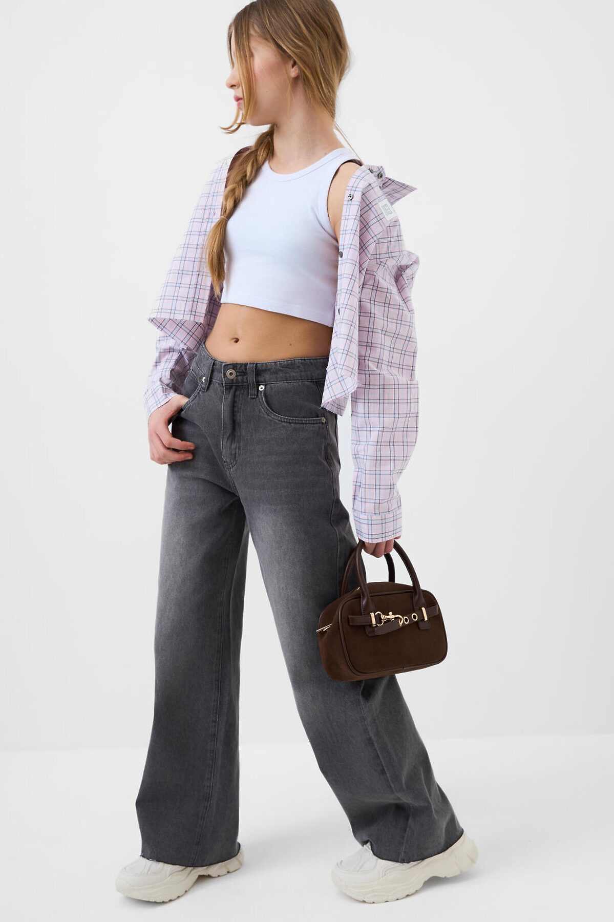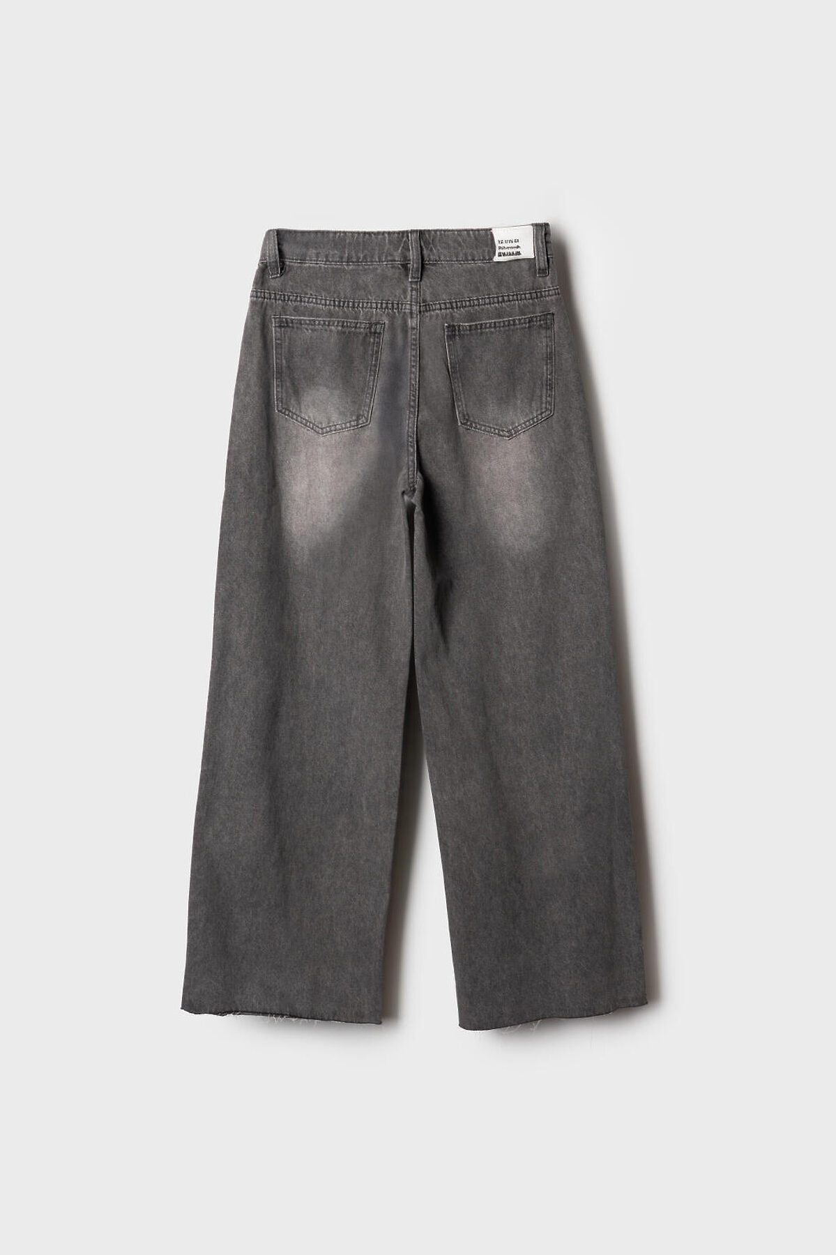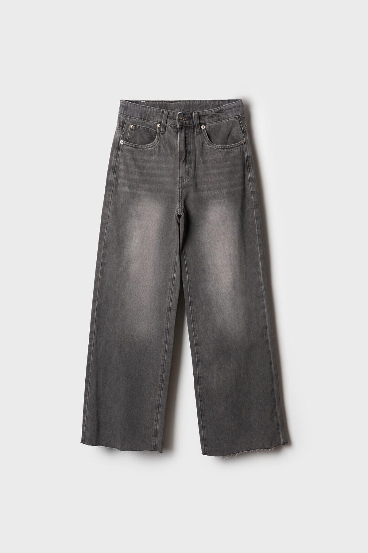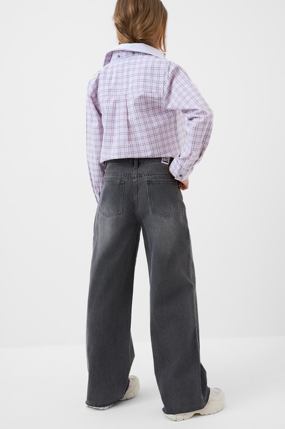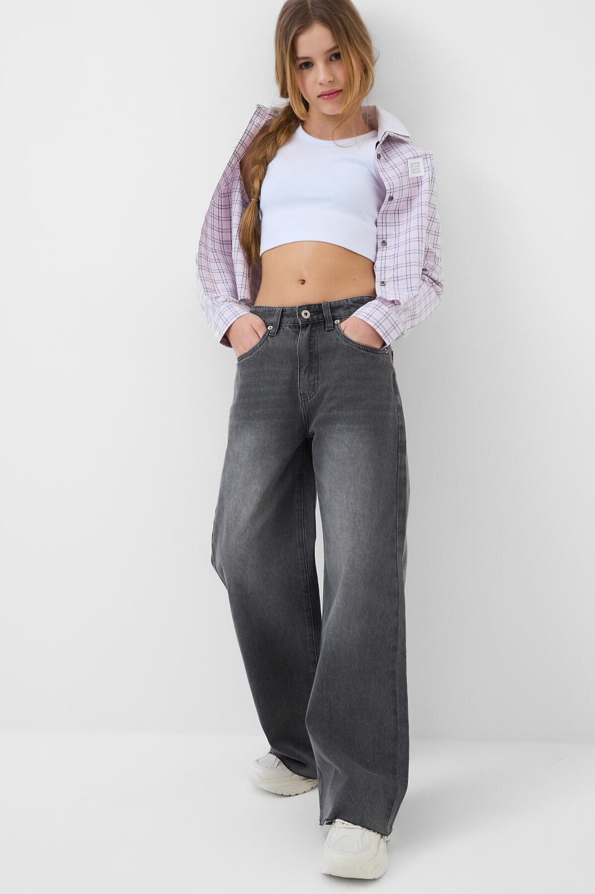 Джинсы широкие для девочки подростка. Спереди классическая застежка на молнию и болт. Модель wide leg свободного прямого кроя с высокой посадкой и длинными широкими штанинами. Есть пять карманов: два спереди, два сзади и один маленький внутренний. На заднем кармане — декоративная этикетка. Пояс с шлевками и регулировочной резинкой внутри. Низ брюк необработан, с модным бахромчатым краем. Отлично подойдут для повседневного гардероба в весенне-летний сезон.