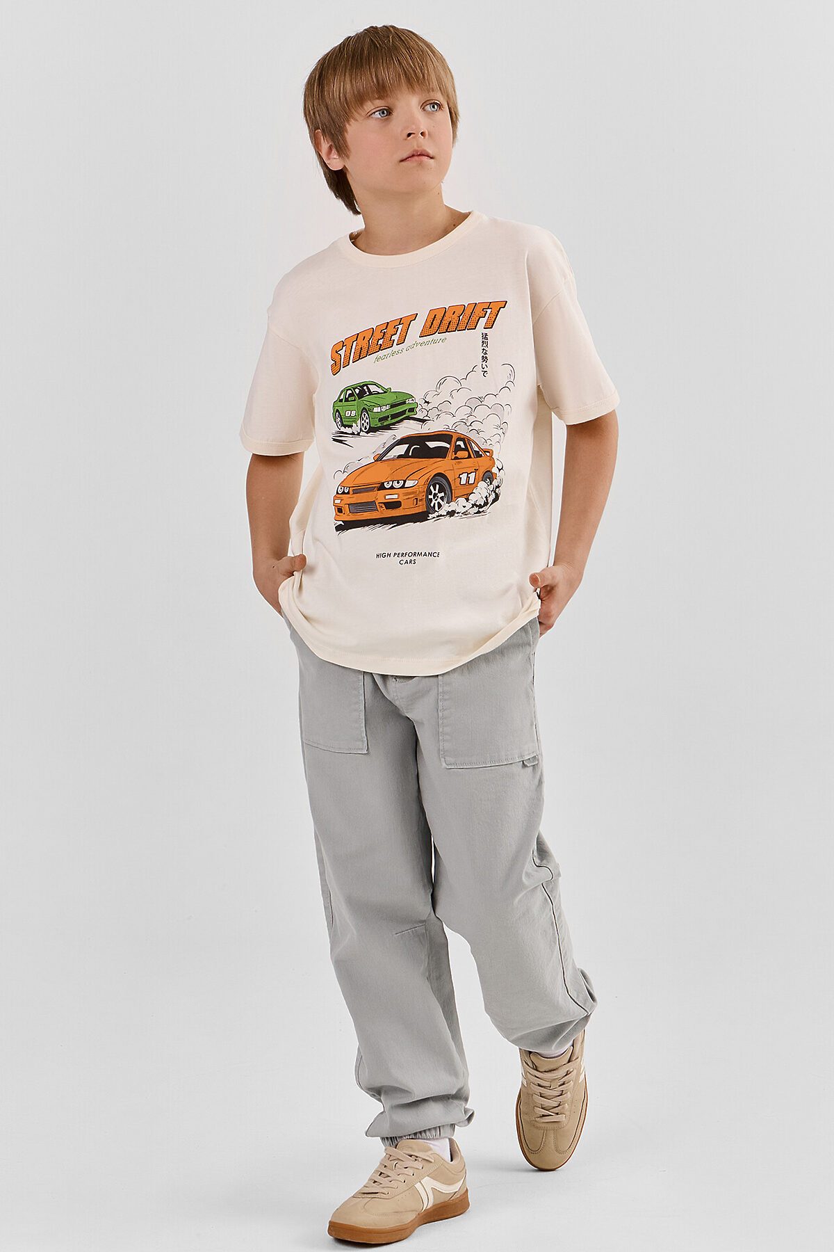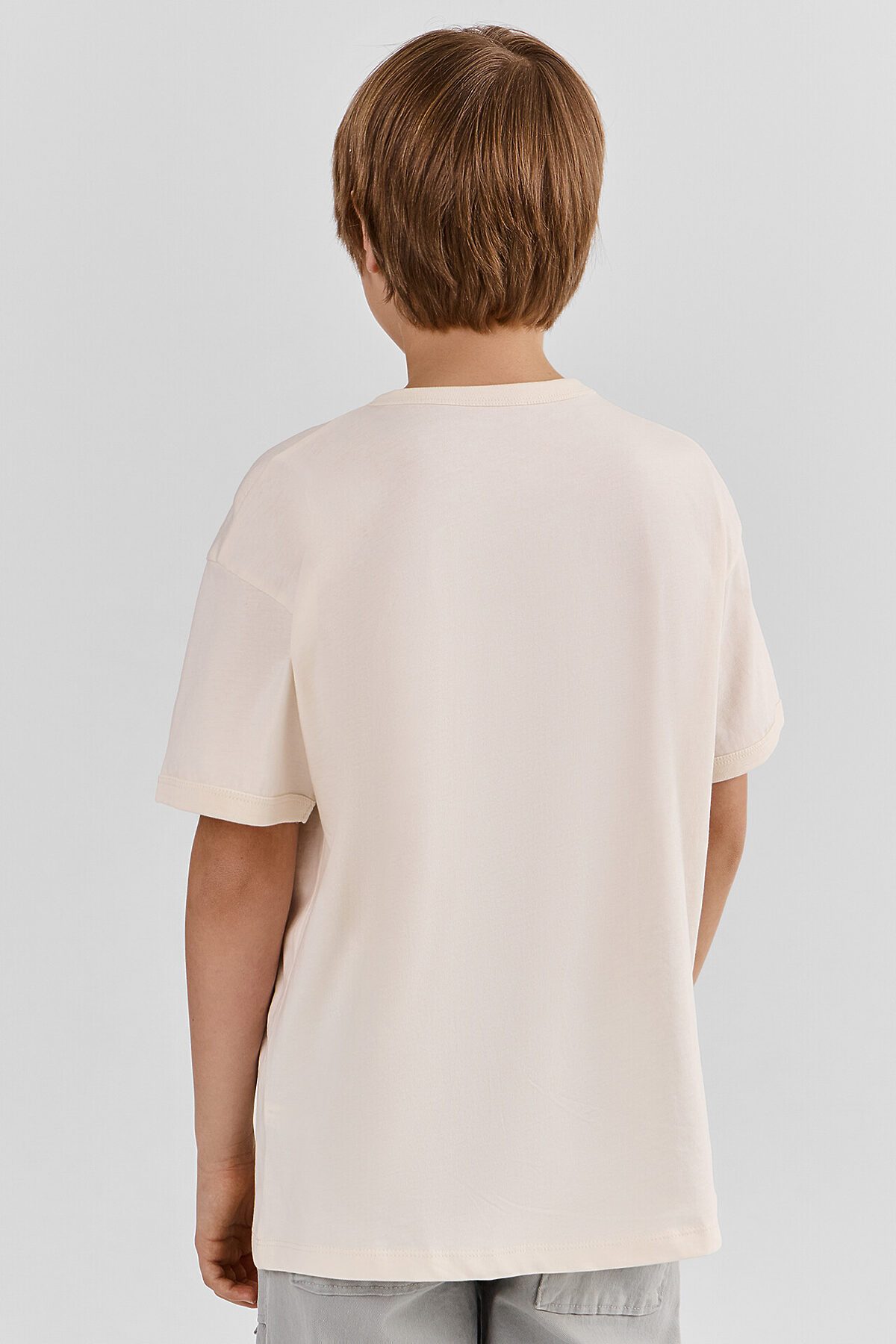 Джемпер для мальчиков свободного силуэта. Рукава втачные короткие. Горловина круглой формы. Горловина и низы рукава окантованы рибаной. Низ футболки обработан швом вподгибку на 2-ух игольной плоскошовной машине.