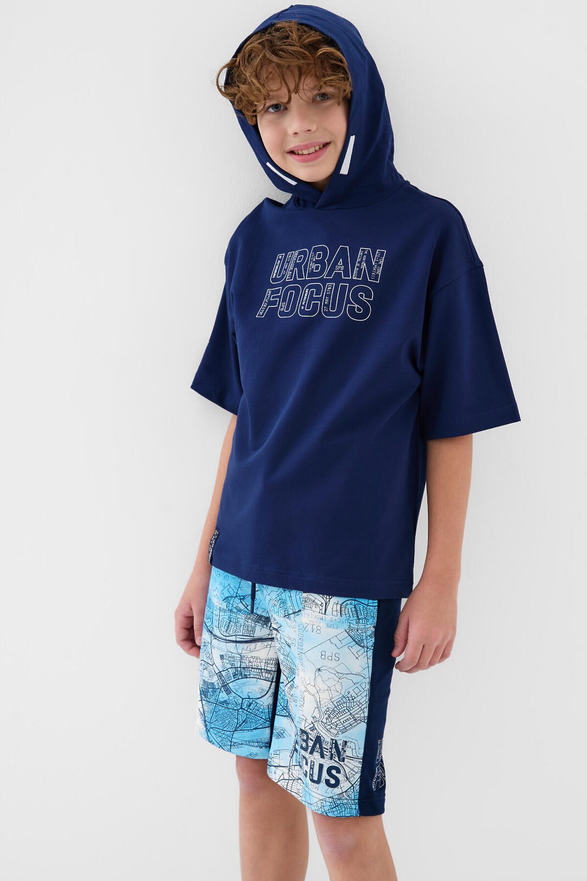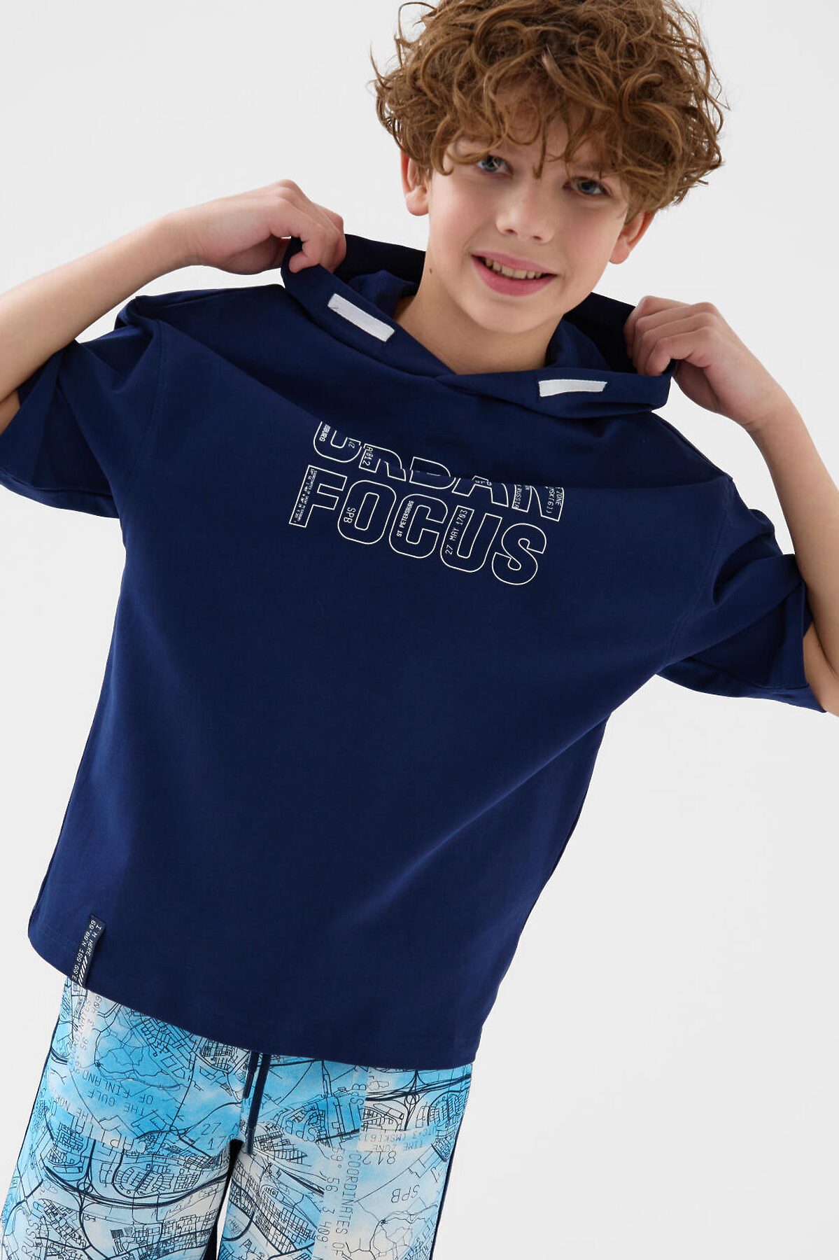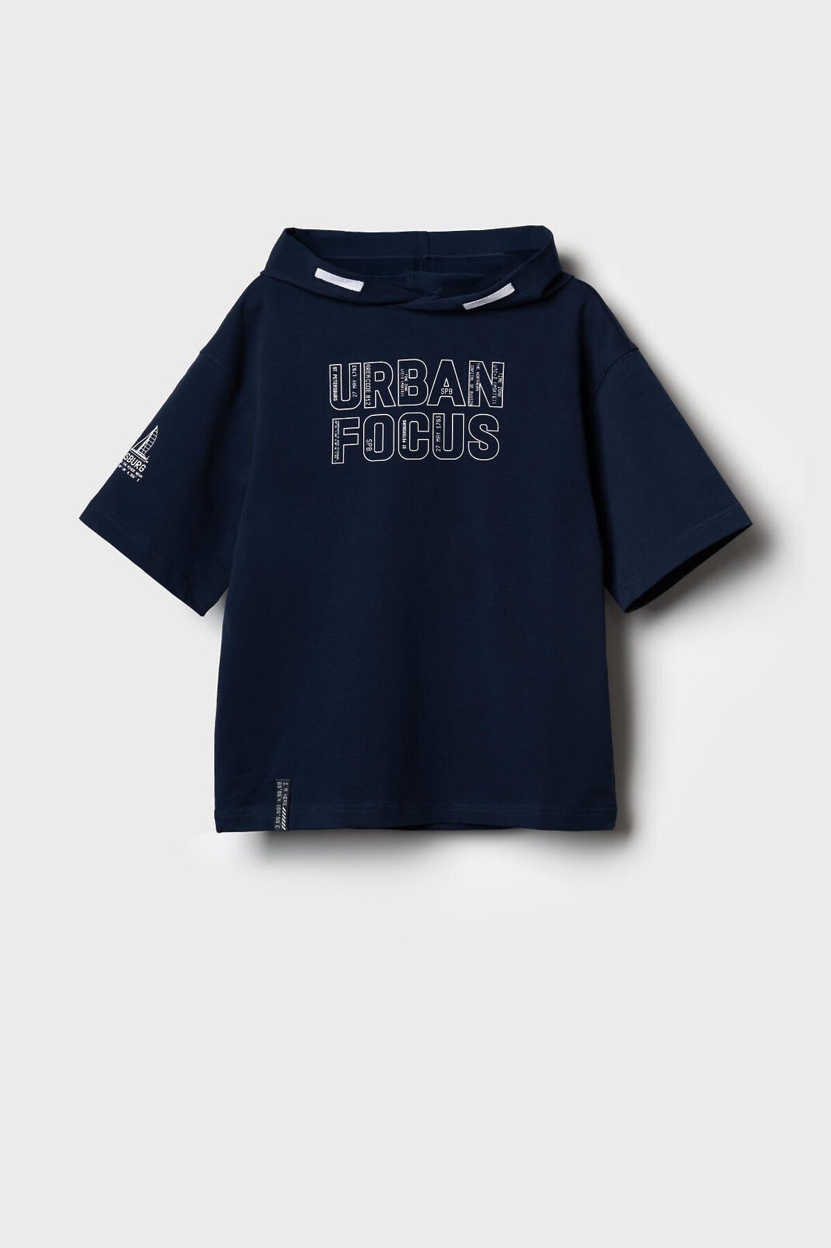 Футболка оверсайз с капюшоном для мальчика подростка. Модель выполнена из эластичного хлопкового трикотажа футер. Спереди расположен крупный принт. По спинке и низу - декоративные нашивки.