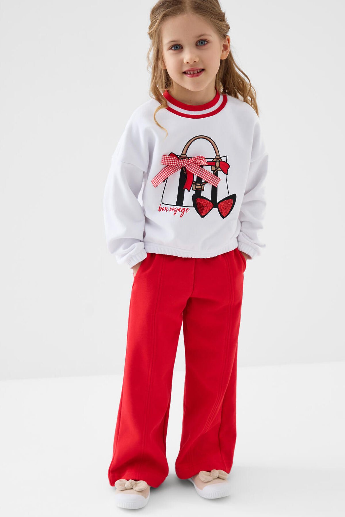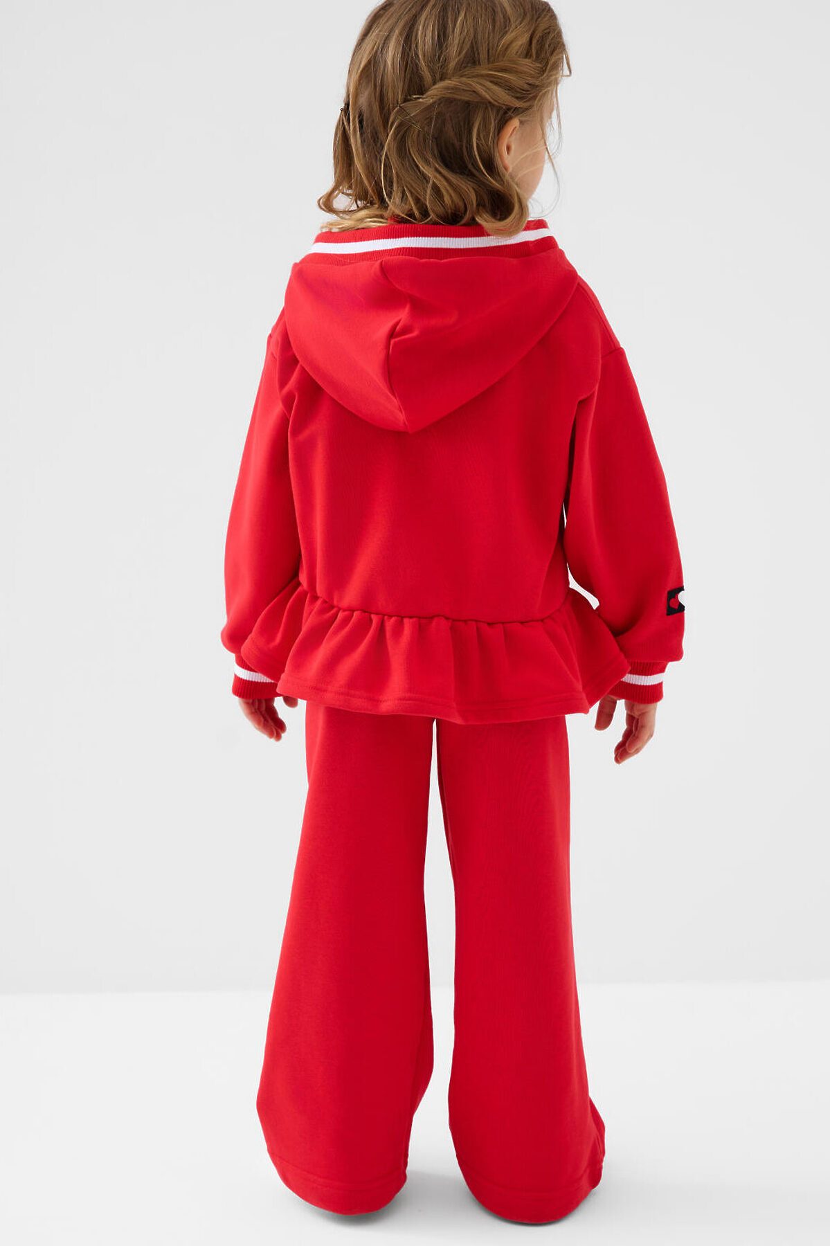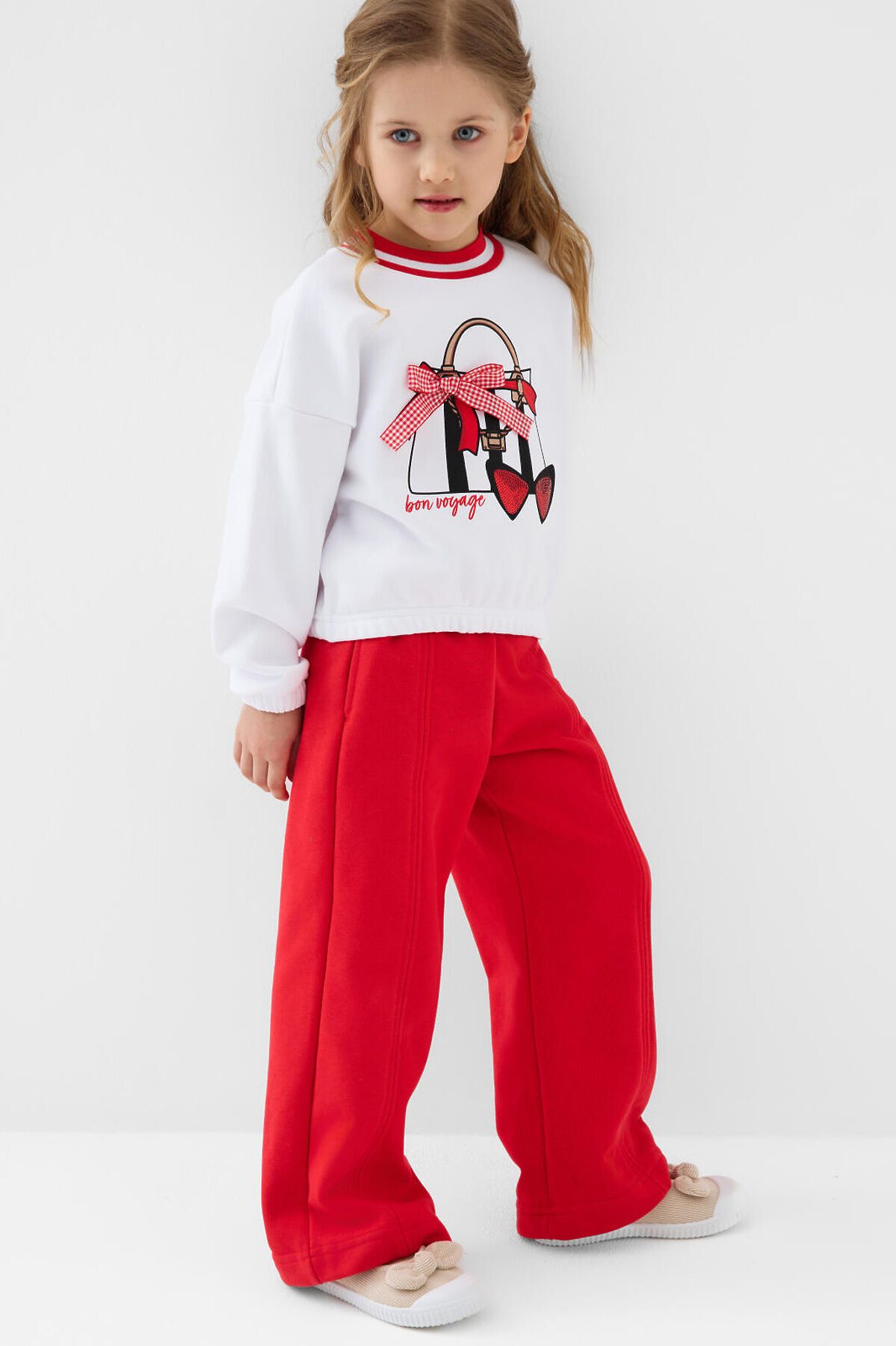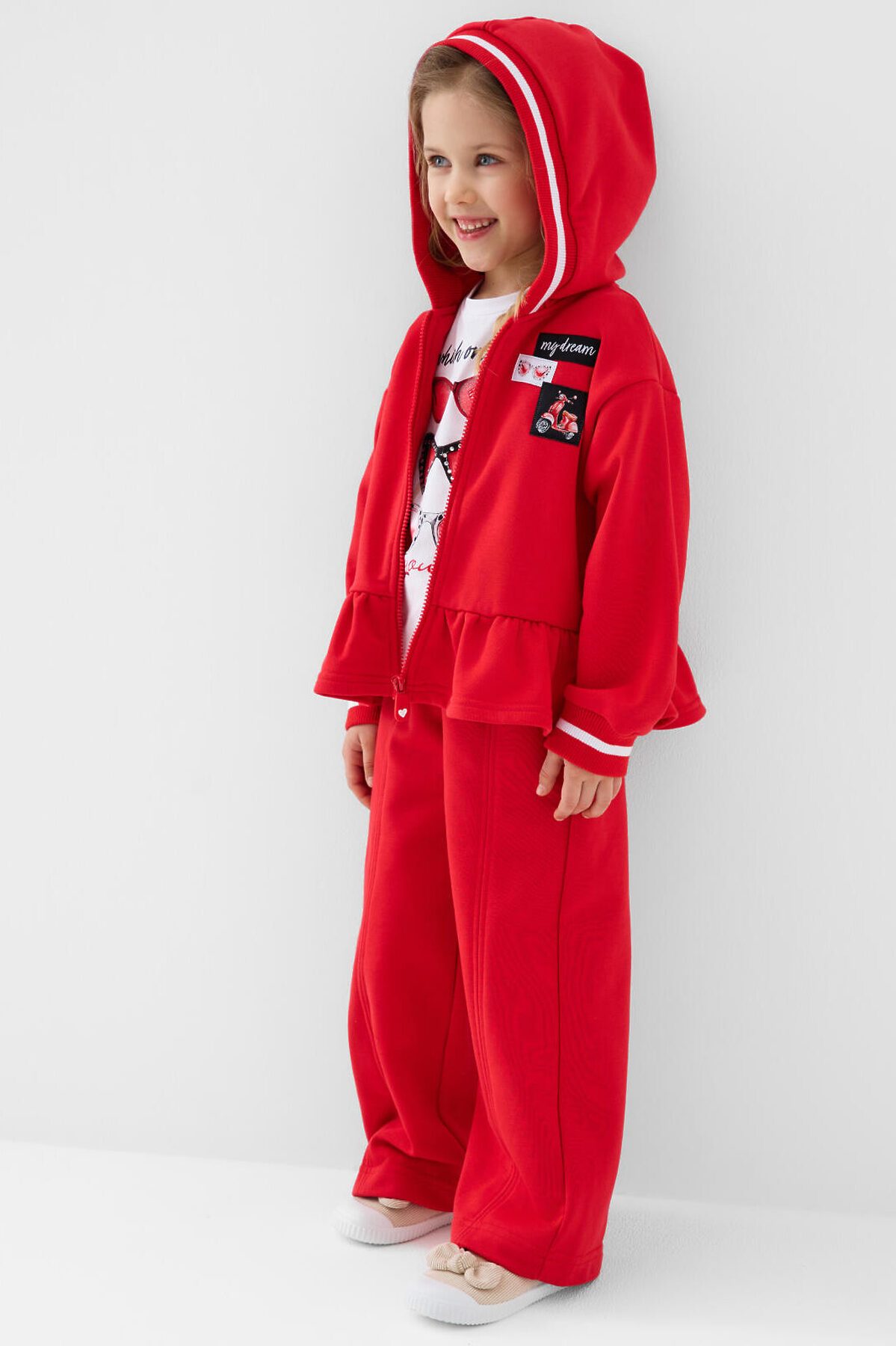 Спортивные широкие детские брюки для девочки. Выполнены из мягкого хлопкового трикотажа футер без начеса. Пояс на резинке, для регулировки талии предусмотрен шнур. По бокам расположены карманы.