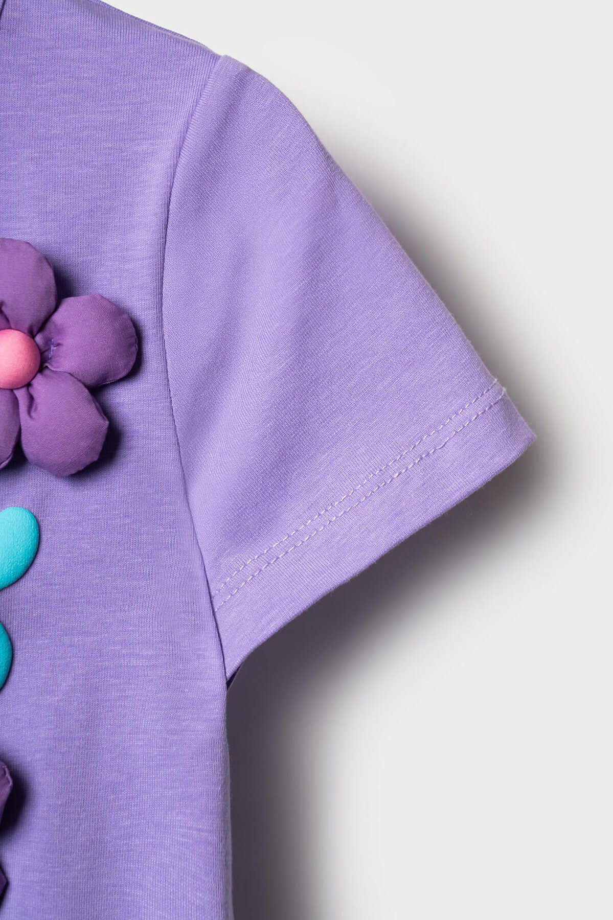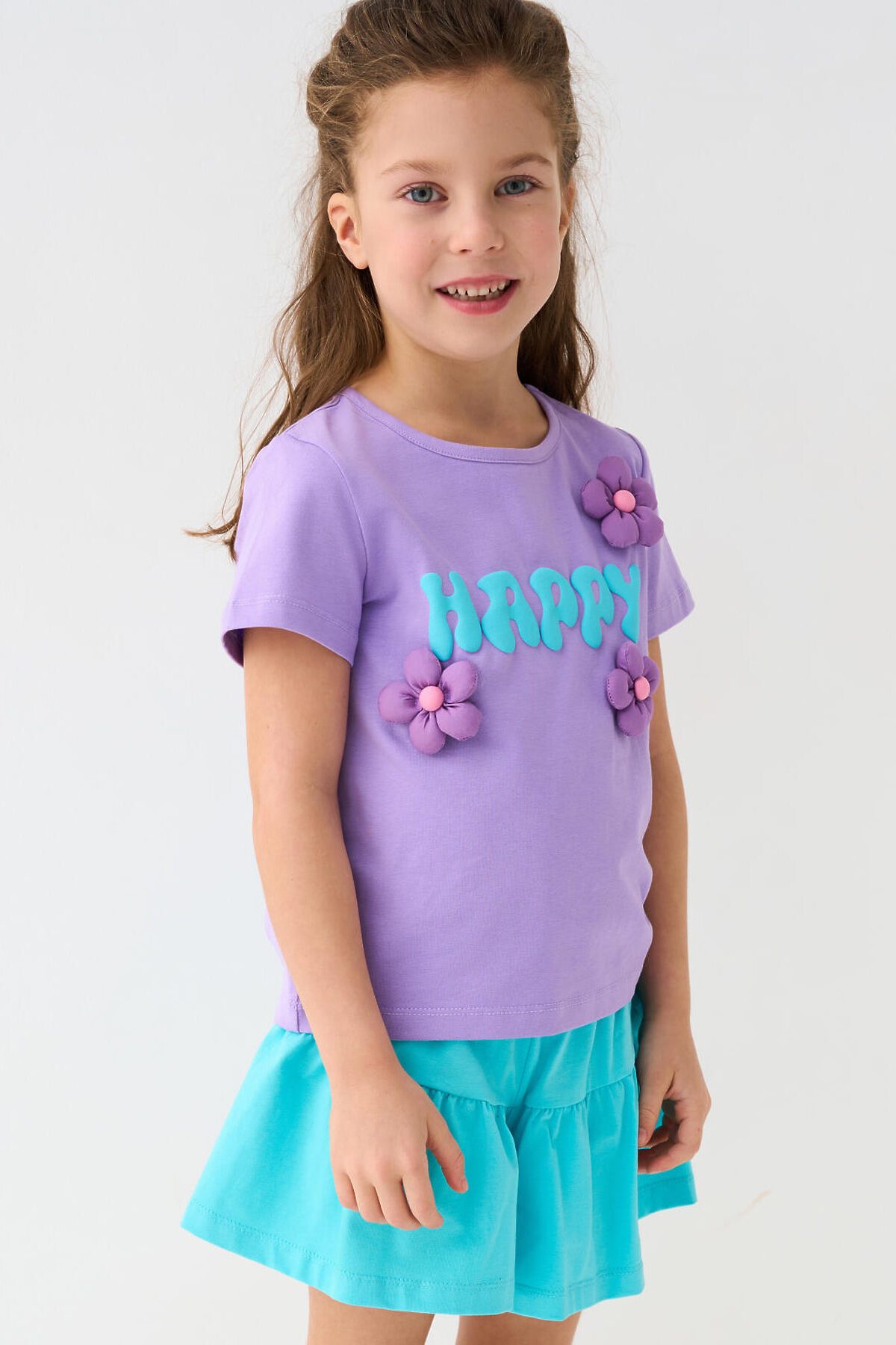 Детский костюм для девочки. Состоит из футболки с коротким рукавом и шорт. Выполнен из хлопкового трикотажа. Футболка прямого кроя, с красочным принтом и объемными цветами. Шорты свободные, хорошо сидят на талии благодаря эластичному поясу.