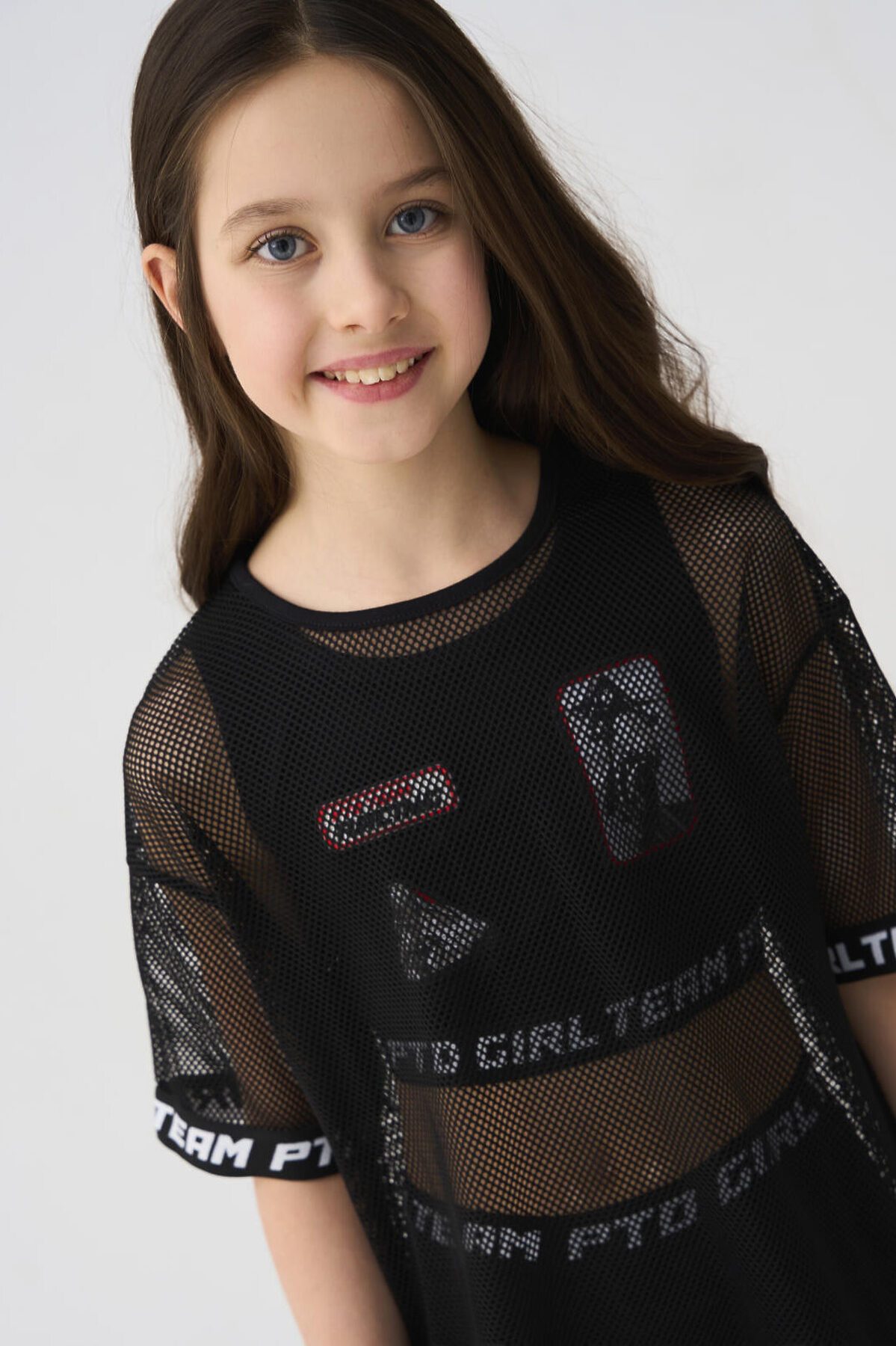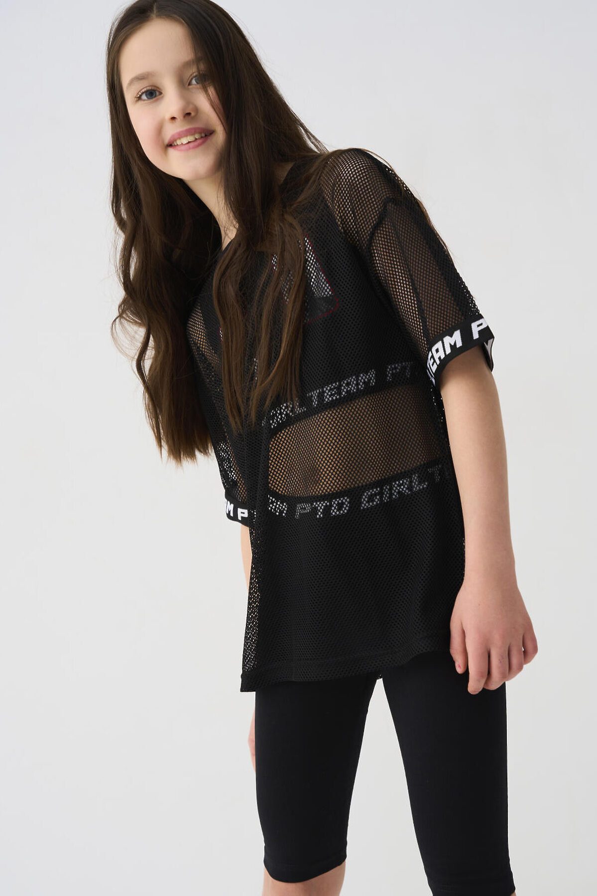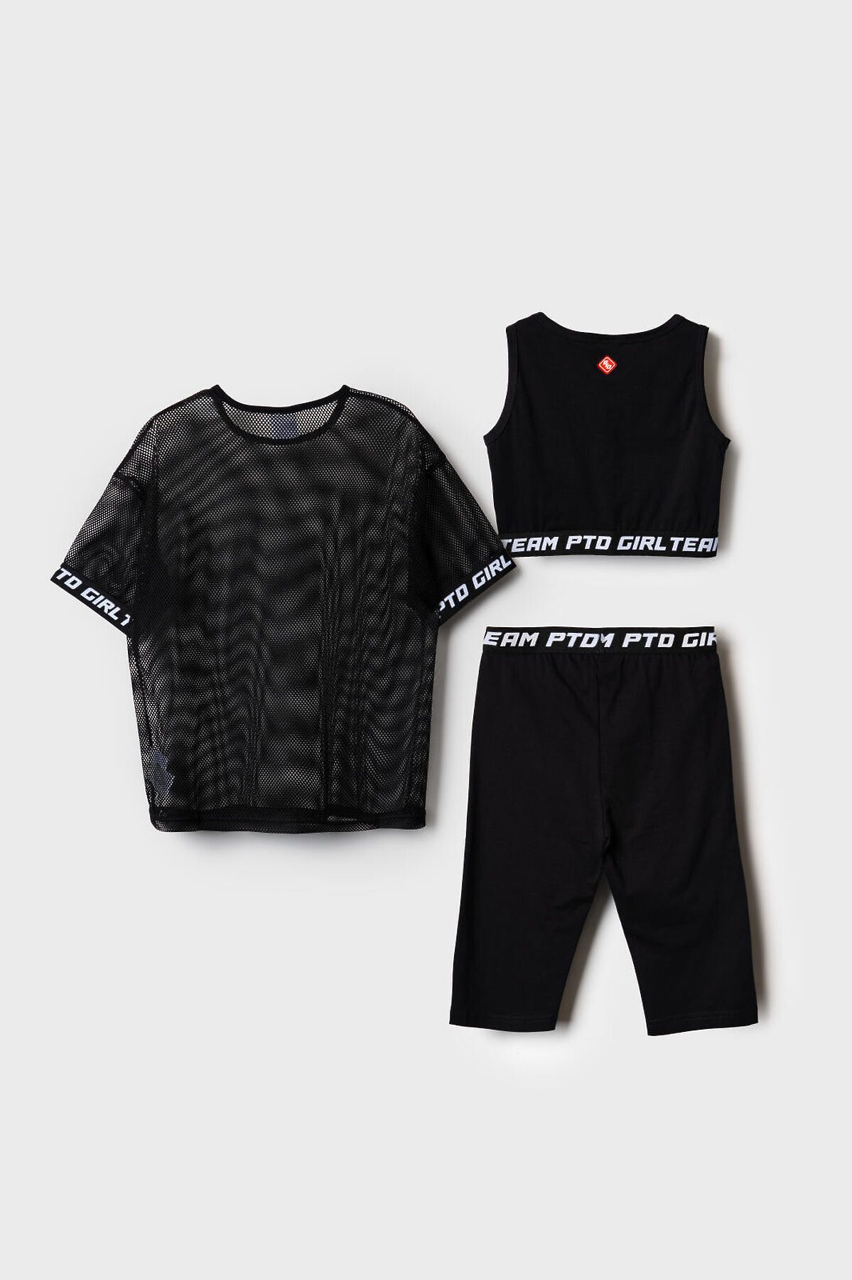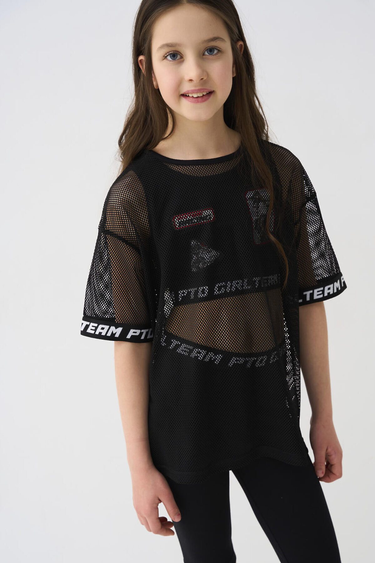 Комплект для девочки подростка. Состоит из оверсайз футболки с коротким рукавом, топа и укороченных легинсов. Футболка выполнена из сетчатого материала с контрастными вставками на рукавах. Топ из хлопкового трикотажа с оригинальными нашивками. Легинсы выполнены из хлопкового трикотажа с эластичным поясом.