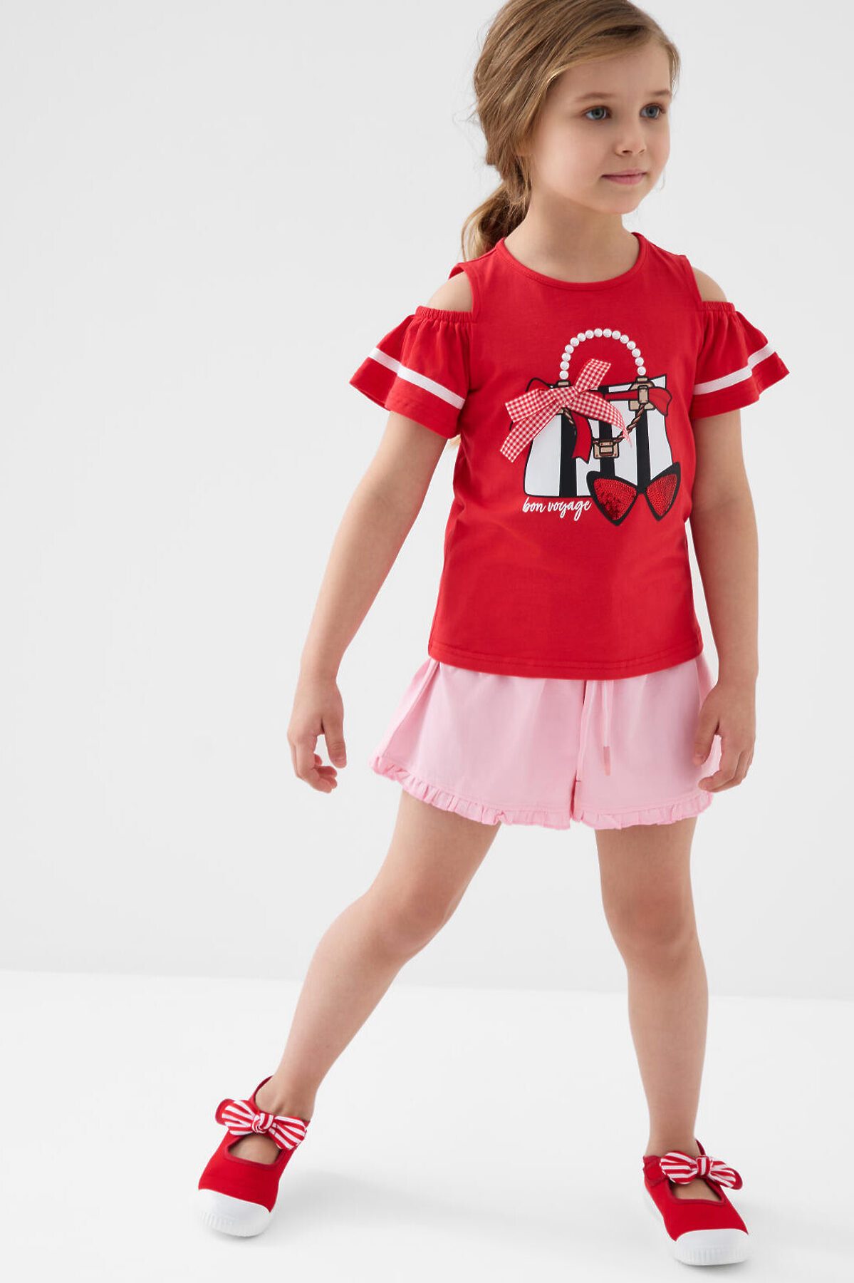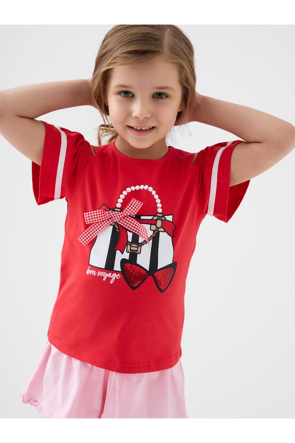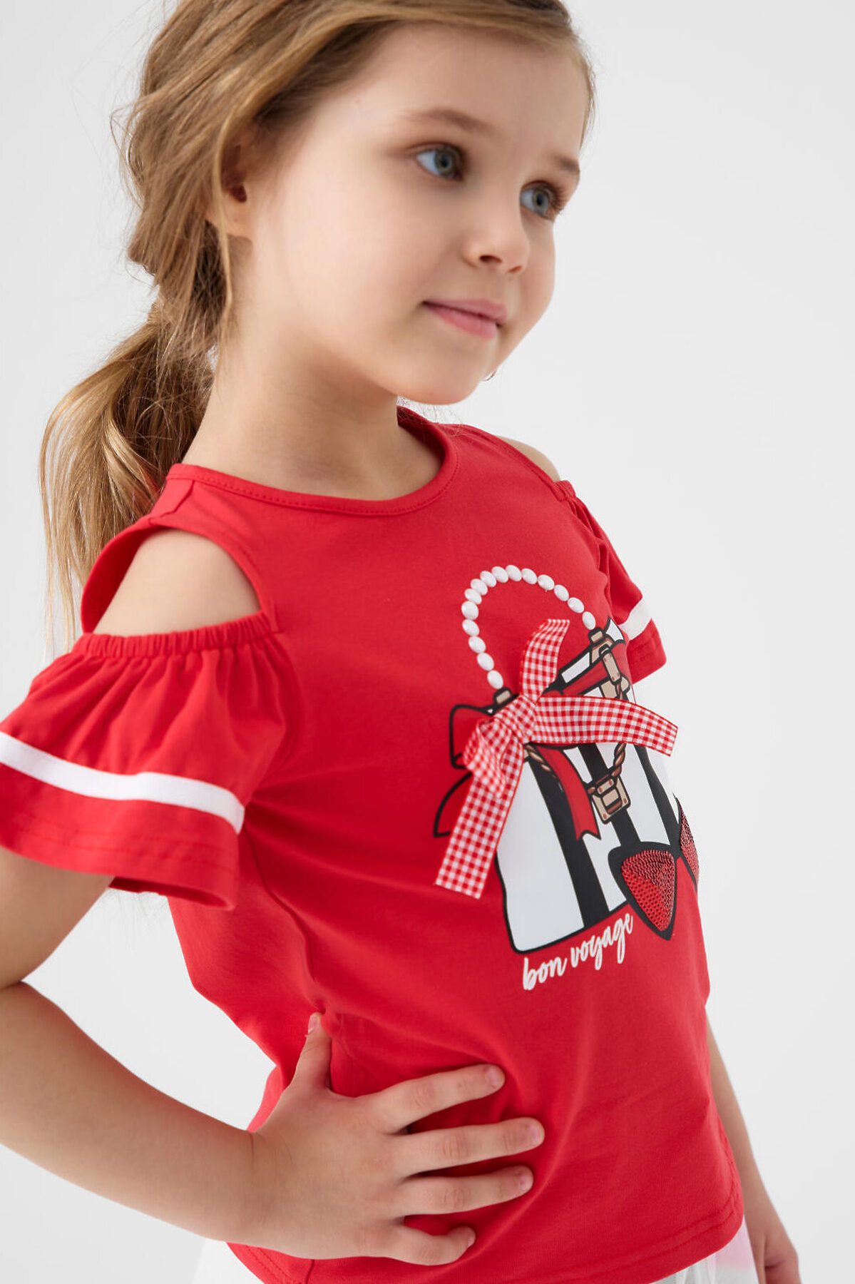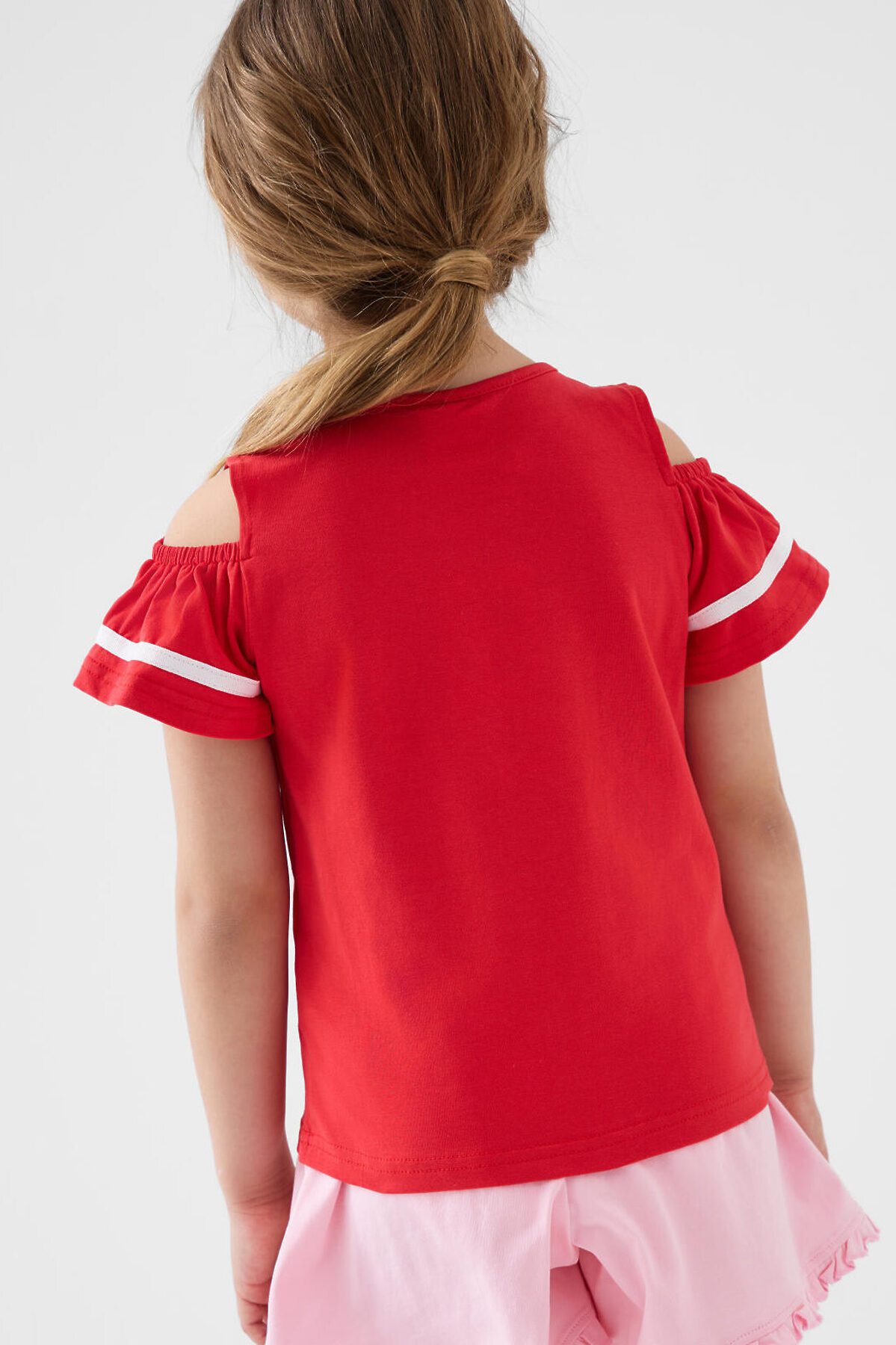 Детская футболка для девочки. Модель прямого кроя, выполнена из эластичного хлопкового трикотажа джерси. Спереди - яркий принт, паетки и декоративный бант. Горловина круглая. Вырезы на рукавах.
