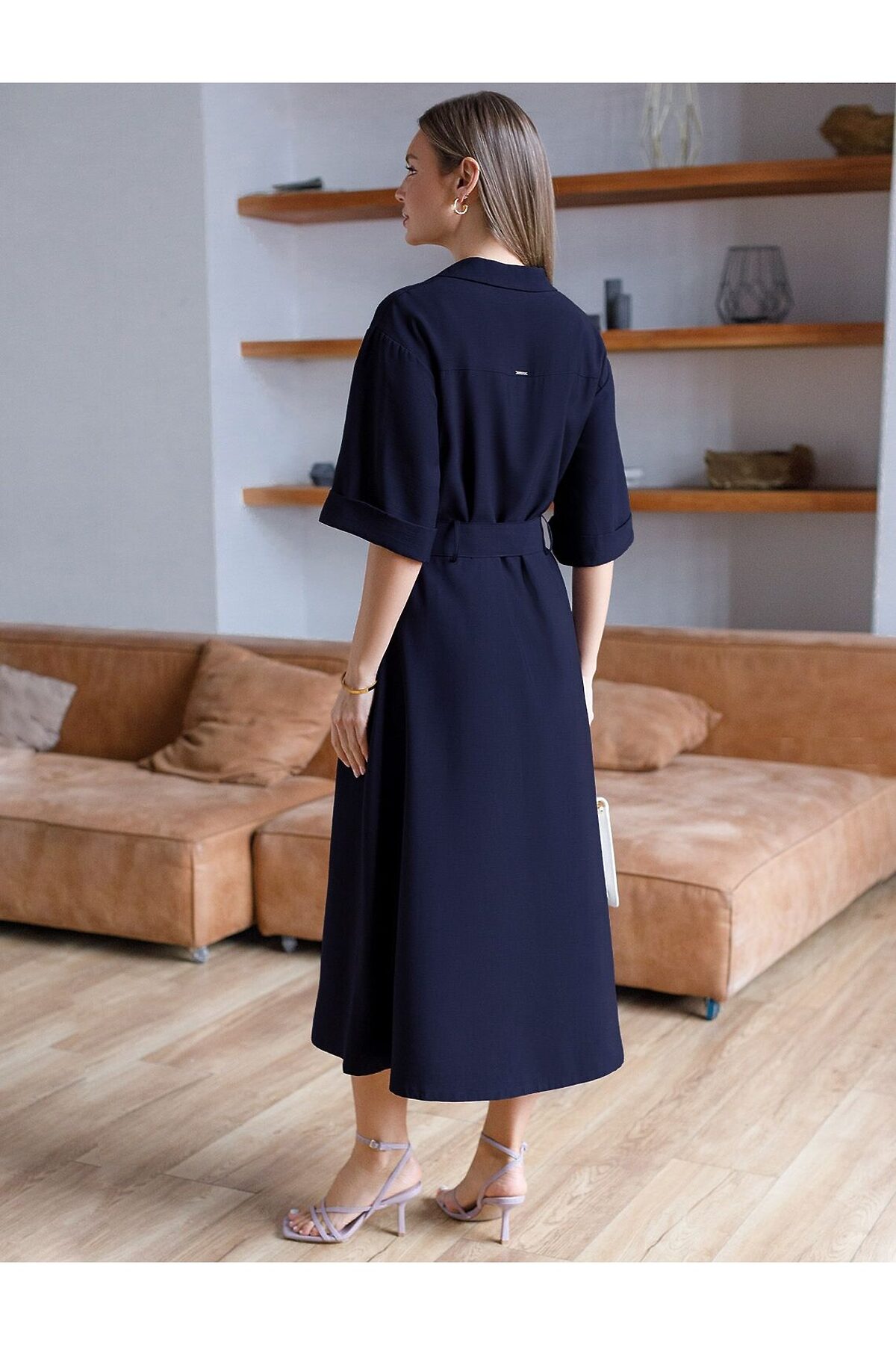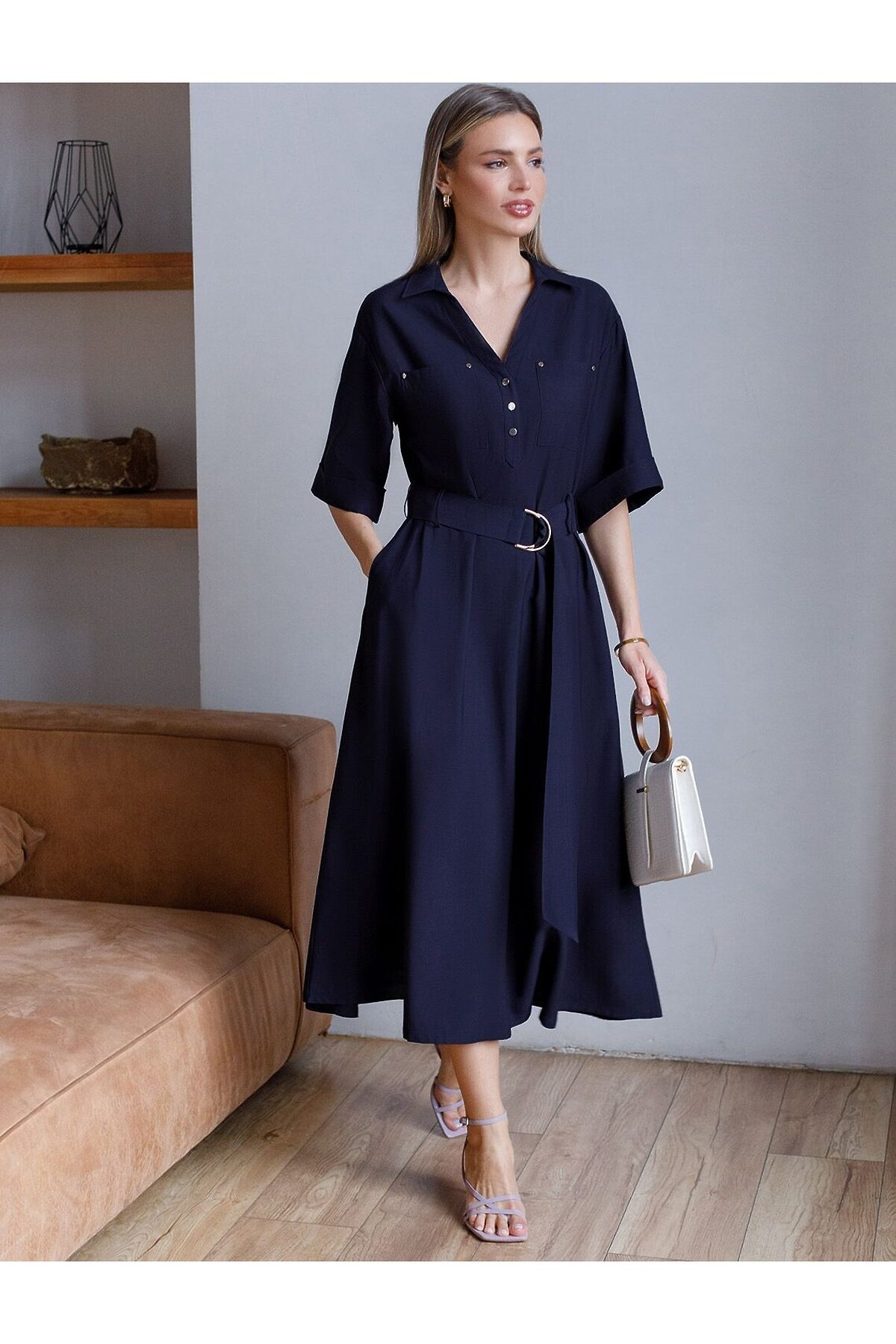 Платье-рубашка темно-синего цвета выполнено из плотного лиоцелла. Лиоцелл это более дорогой и экологичный вариант вискозы, очень прочный и шелковистый. Ткань отличается от регулярной коллекции из лиоцелла - она содержит еще больше лиоцелла (92%), благодаря чему имеет более нежную шелковистую фактуру. Свободное платье трапеция будет идеальным выбором для весны и лета. Отложной воротник добавляет классический акцент, широкий пояс с металлической пряжкой подчеркивает талию, делая силуэт выразительным и женственным. Платье с широким рукавом средней длины смотрится современно, карманы и пуговицы добавляют практичности. Платье А-силуэта идеально сядет и на большие размеры, скроет возможные недостатки и подчеркнет достоинства фигуры за счет элегантного облегания талии и расклешенной юбки. На высокий рост платье будет длины миди, а на низкий рост - длина макси. Такое красивое и комфортное платье подойдет для повседневных образов, для стилизации в стиле сафари или casual, а так же для торжественных мероприятий.