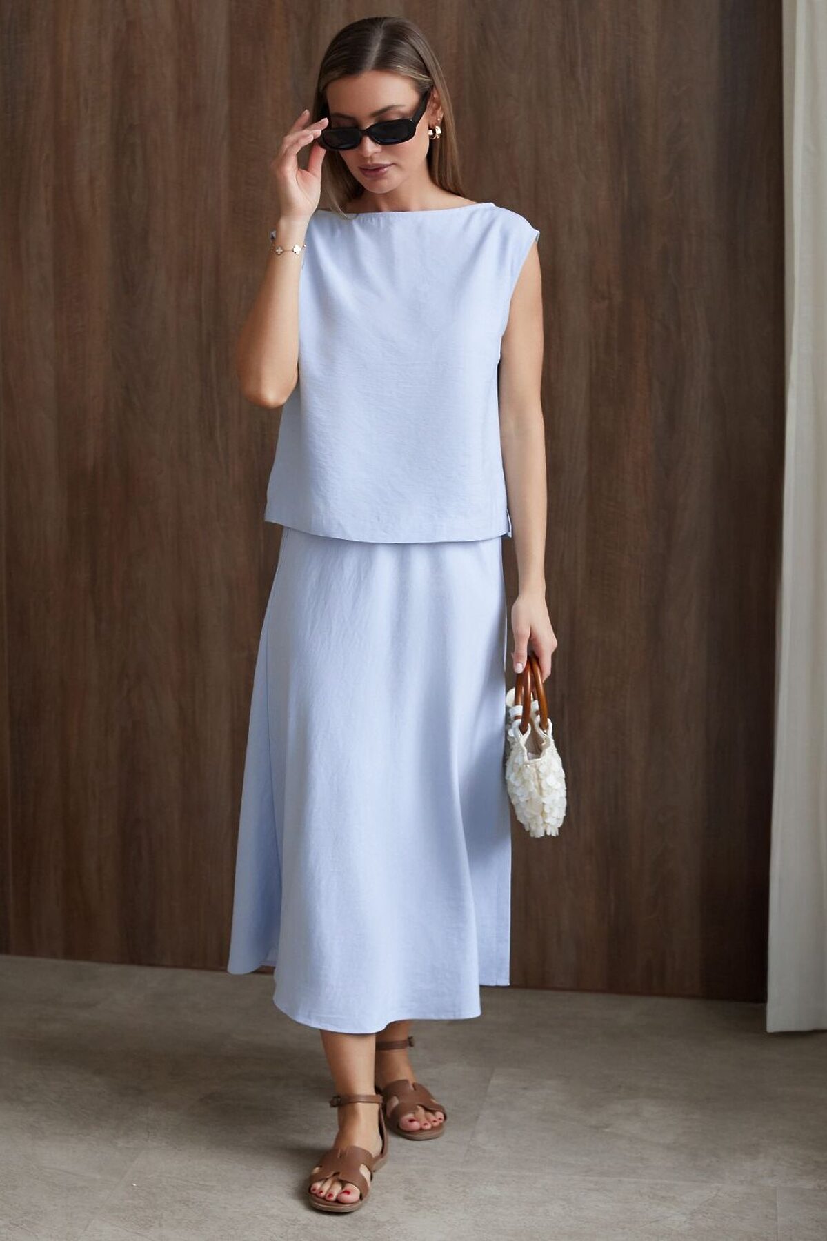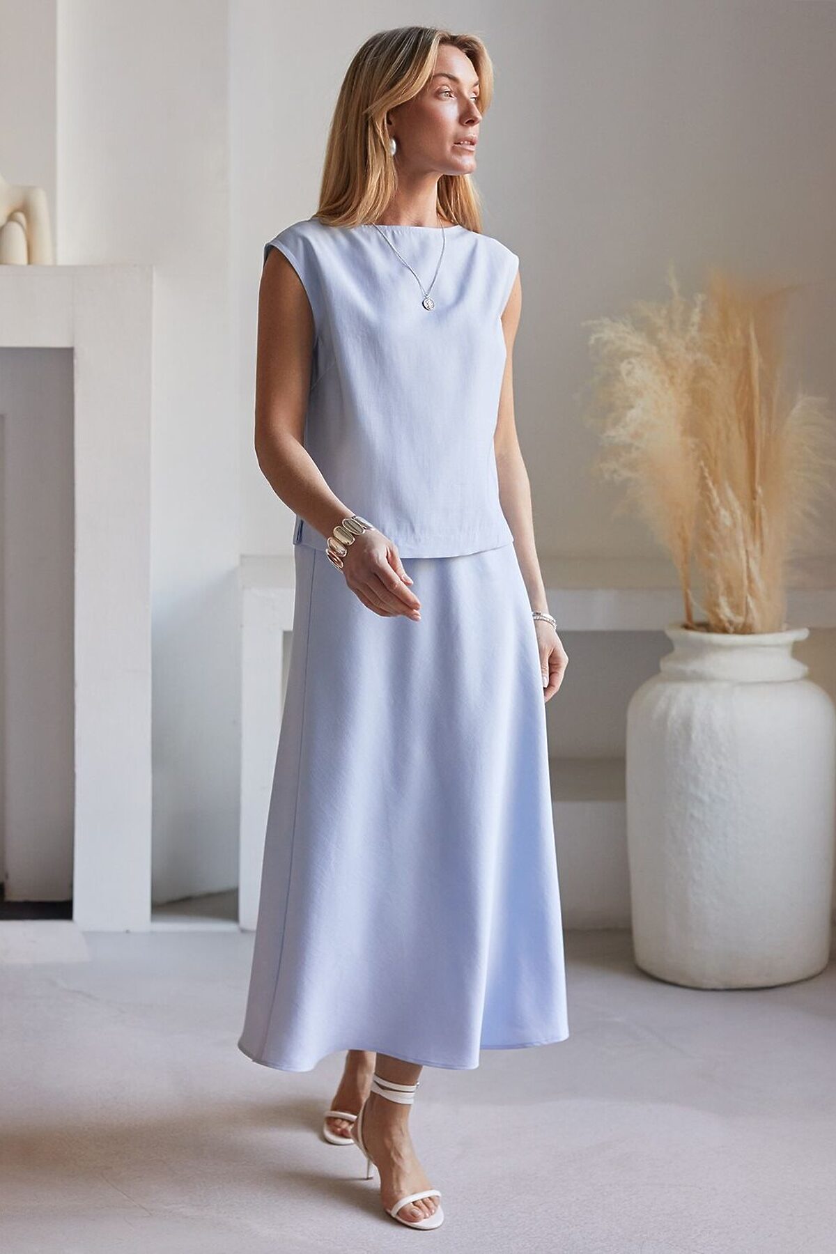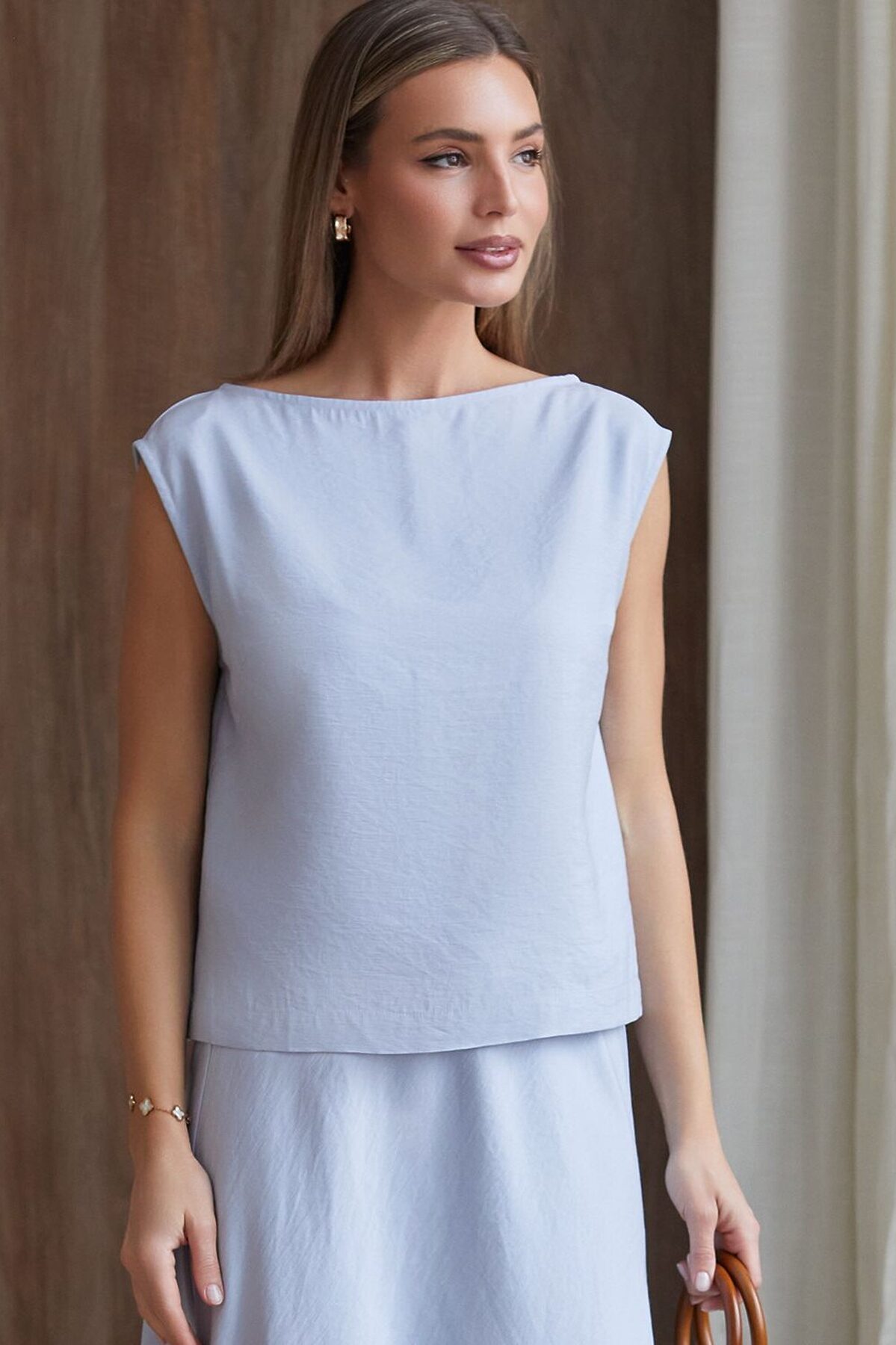 Изысканный топ голубого цвета с элегантным вырезом-лодочкой, выполненный из плотного лиоцелла. Лиоцелл это более дорогой и экологичный вариант вискозы, очень прочный и шелковистый.Ткань отличается от регулярной коллекции из лиоцелла - она содержит еще больше лиоцелла (92%), благодаря чему имеет более нежную шелковистую фактуру. Вырез лодочка придает топу утонченность, а небольшие разрезы по бокам добавляют легкости. Простой прямой крой в сочетании с интересными деталями создает стильную и в то же время комфортную вещь. Топ средней длины подойдет для любительниц базовой одежды, которые хотят деликатно повысить градус своего стиля. Этот лаконичный топ будет идеальным выбором для теплого времени года или многослойных ансамблей. Рекомендуем сочетать с артикулами: D26.208, D24.313