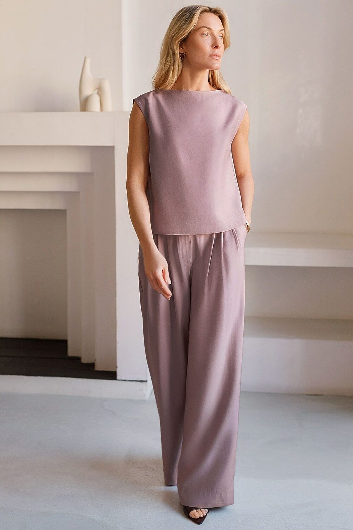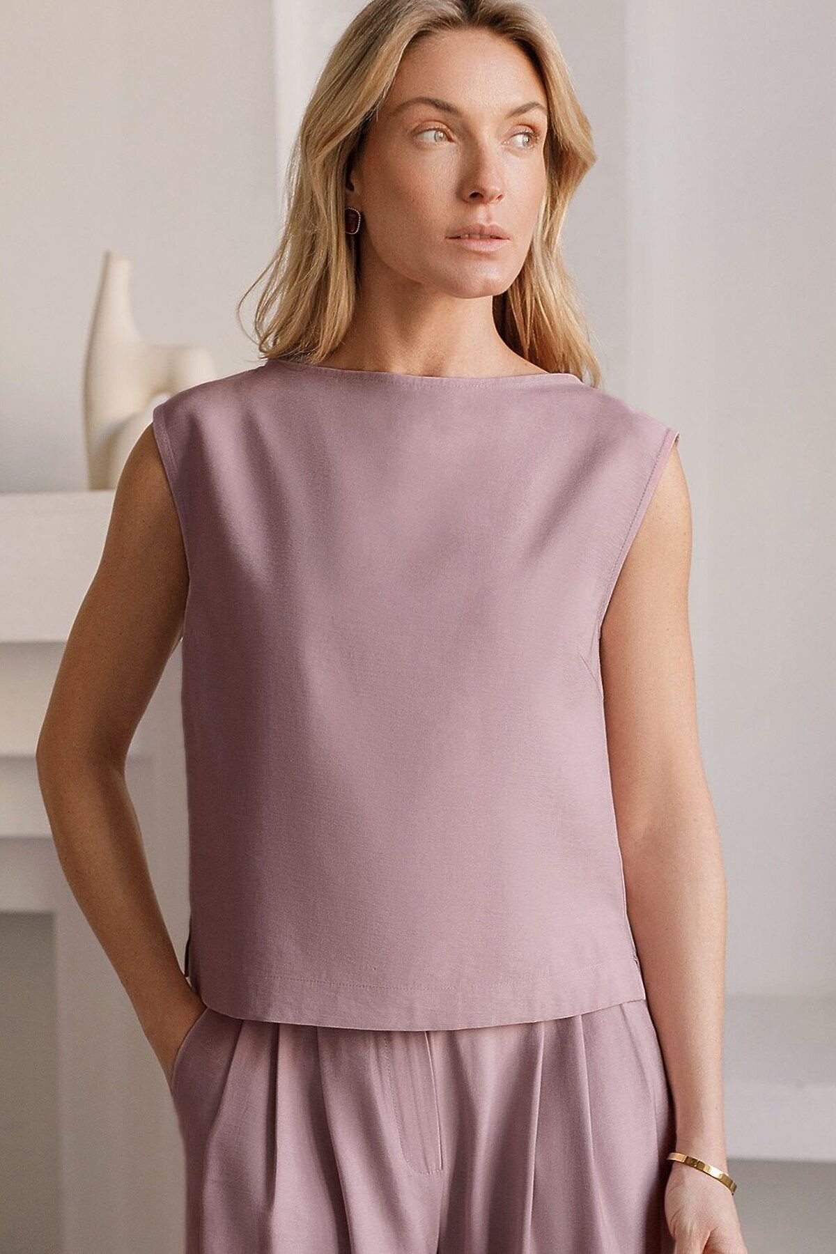 Изысканный топ нежного зефирно-розового цвета с элегантным вырезом-лодочкой, выполненный из плотного лиоцелла. Лиоцелл это более дорогой и экологичный вариант вискозы, очень прочный и шелковистый. Ткань отличается от регулярной коллекции из лиоцелла - она содержит еще больше лиоцелла (92%), благодаря чему имеет более нежную шелковистую фактуру. Вырез лодочка придает топу утонченность, а небольшие разрезы по бокам добавляют легкости. Простой прямой крой в сочетании с интересными деталями создает стильную и в то же время комфортную вещь. Топ средней длины подойдет для любительниц базовой одежды, которые хотят деликатно повысить градус своего стиля. Этот лаконичный топ будет идеальным выбором для теплого времени года или многослойных ансамблей. Рекомендуем сочетать с артикулами: D26.208, D24.313