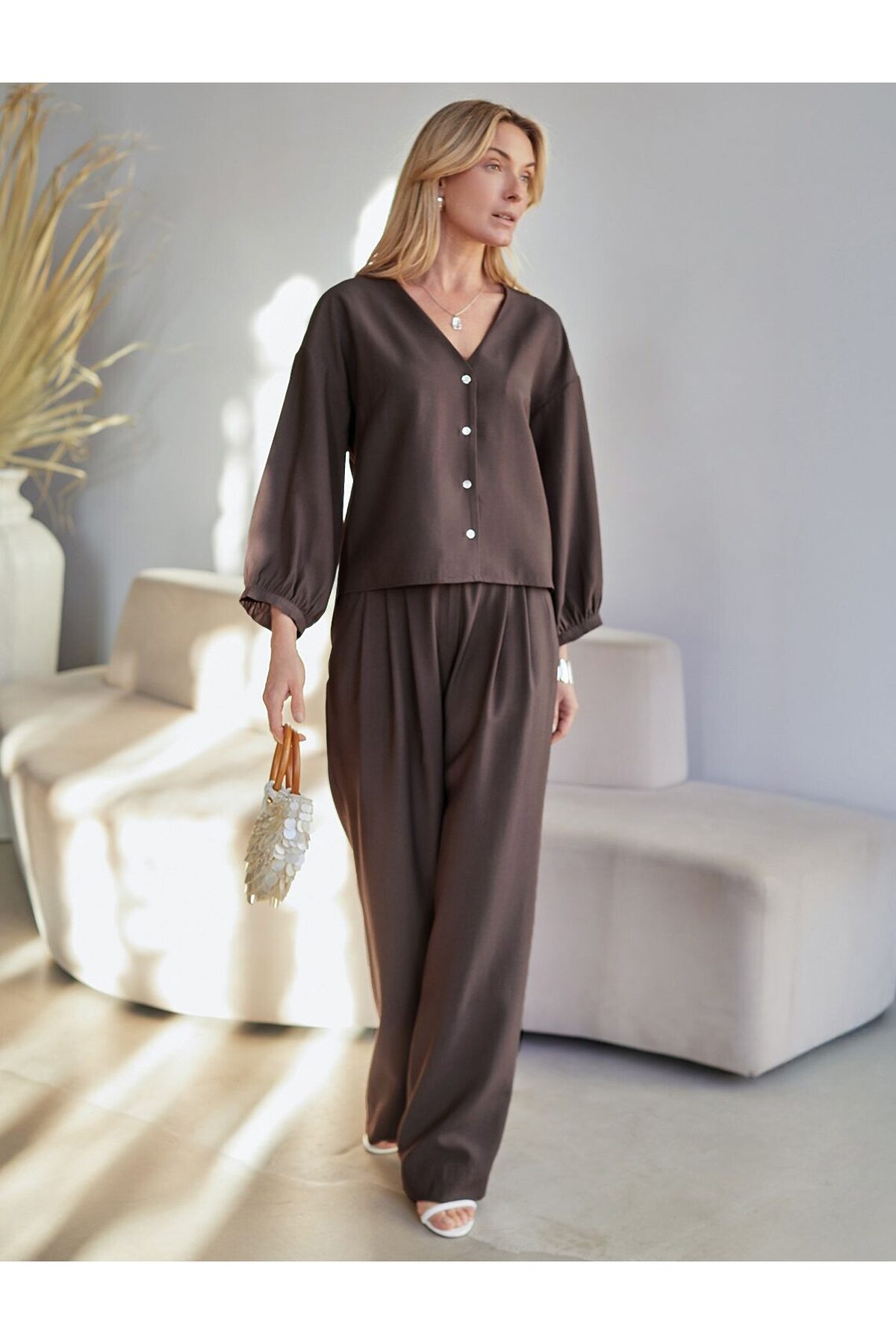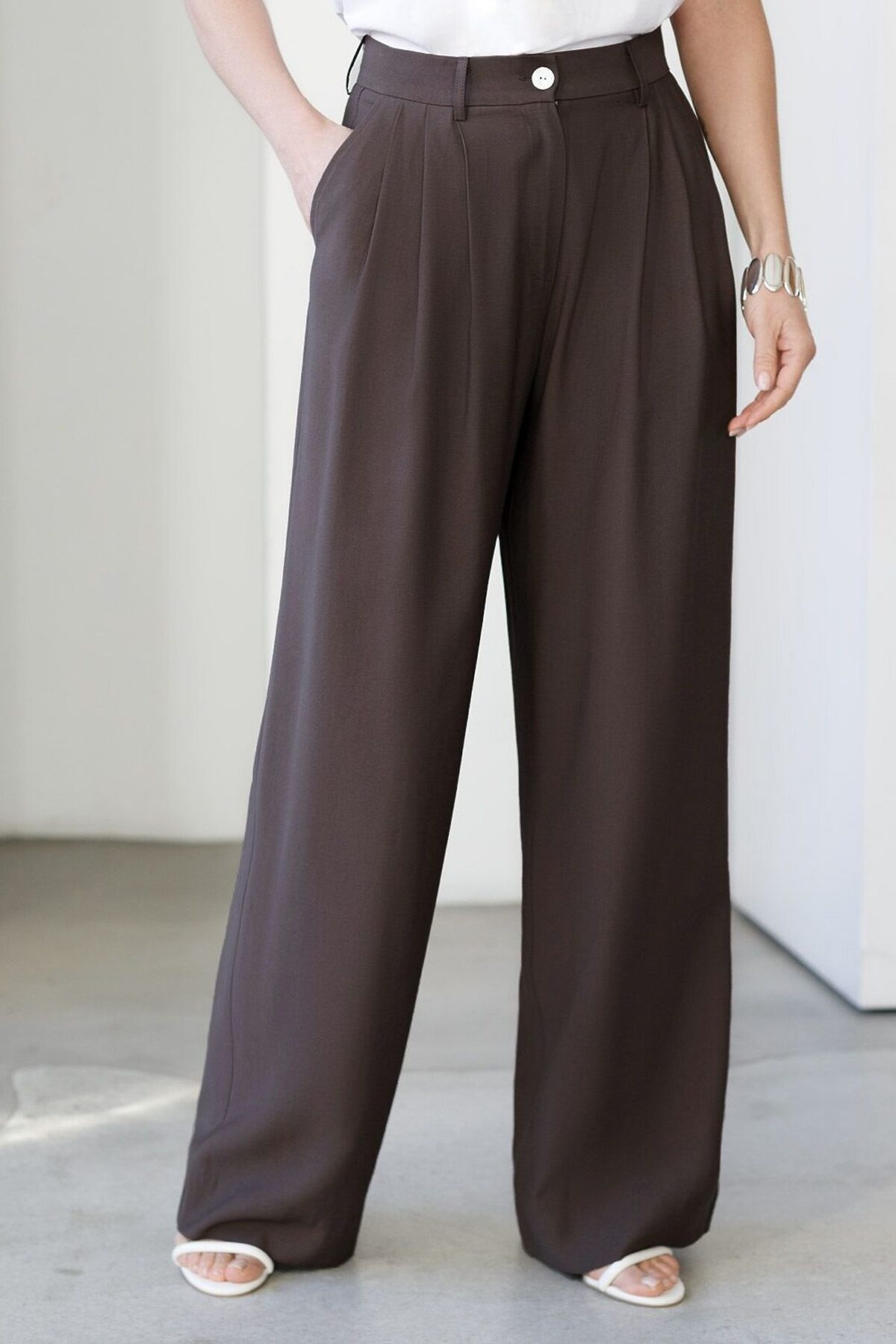 Брюки палаццо кофейного цвета выполнены из плотного лиоцелла. Лиоцелл это более дорогой и экологичный вариант вискозы, очень прочный и шелковистый. Ткань отличается от регулярной коллекции из лиоцелла - она содержит еще больше лиоцелла (92%), благодаря чему имеет более нежную шелковистую фактуру. Свободные прямые брюки с высокой посадкой визуально вытягивают и стройнят фигуру. Удобные карманы по бокам и свободный крой делают эти брюки базовым элементом гардероба. Летние брюки отлично сочетаются с монохромным верхом, с ними можно создавать эффектные наряды как на выход, так и для ежедневных рабочих дел или простых прогулок, от делового шика до повседневного кэжуал. Рекомендуем сочетать с артикулами: D27.004, D23.079, D29.356