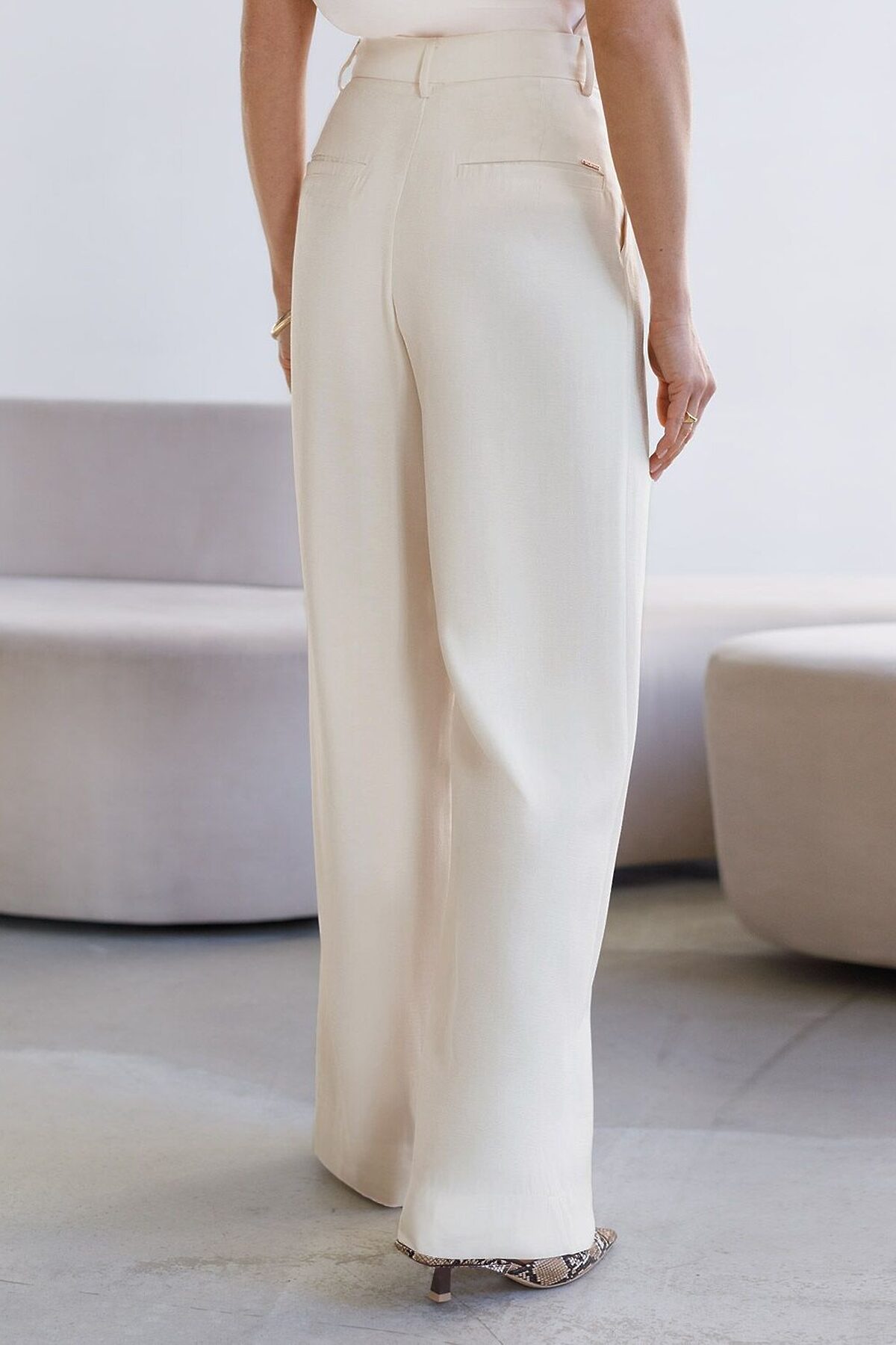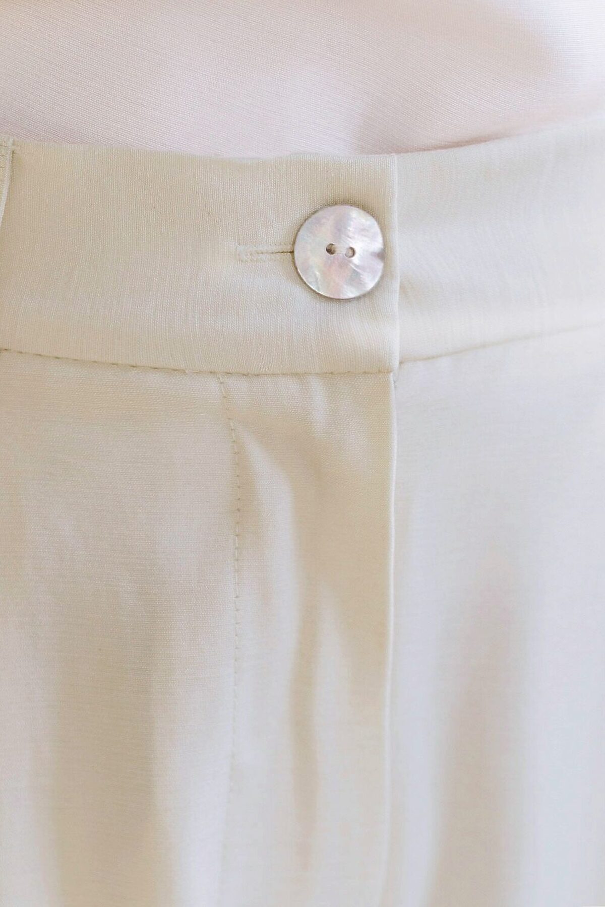 Брюки палаццо натурального белого цвета выполнены из плотного лиоцелла. Лиоцелл это более дорогой и экологичный вариант вискозы, очень прочный и шелковистый. Ткань отличается от регулярной коллекции из лиоцелла - она содержит еще больше лиоцелла (92%), благодаря чему имеет более нежную шелковистую фактуру. Свободные прямые брюки с высокой посадкой визуально вытягивают и стройнят фигуру. Удобные карманы по бокам и свободный крой делают эти брюки базовым элементом гардероба. Летние брюки отлично сочетаются с монохромным верхом, с ними можно создавать эффектные наряды как на выход, так и для ежедневных рабочих дел или простых прогулок, от делового шика до повседневного кэжуал. Рекомендуем сочетать с артикулами: D27.004, D23.079, D29.356