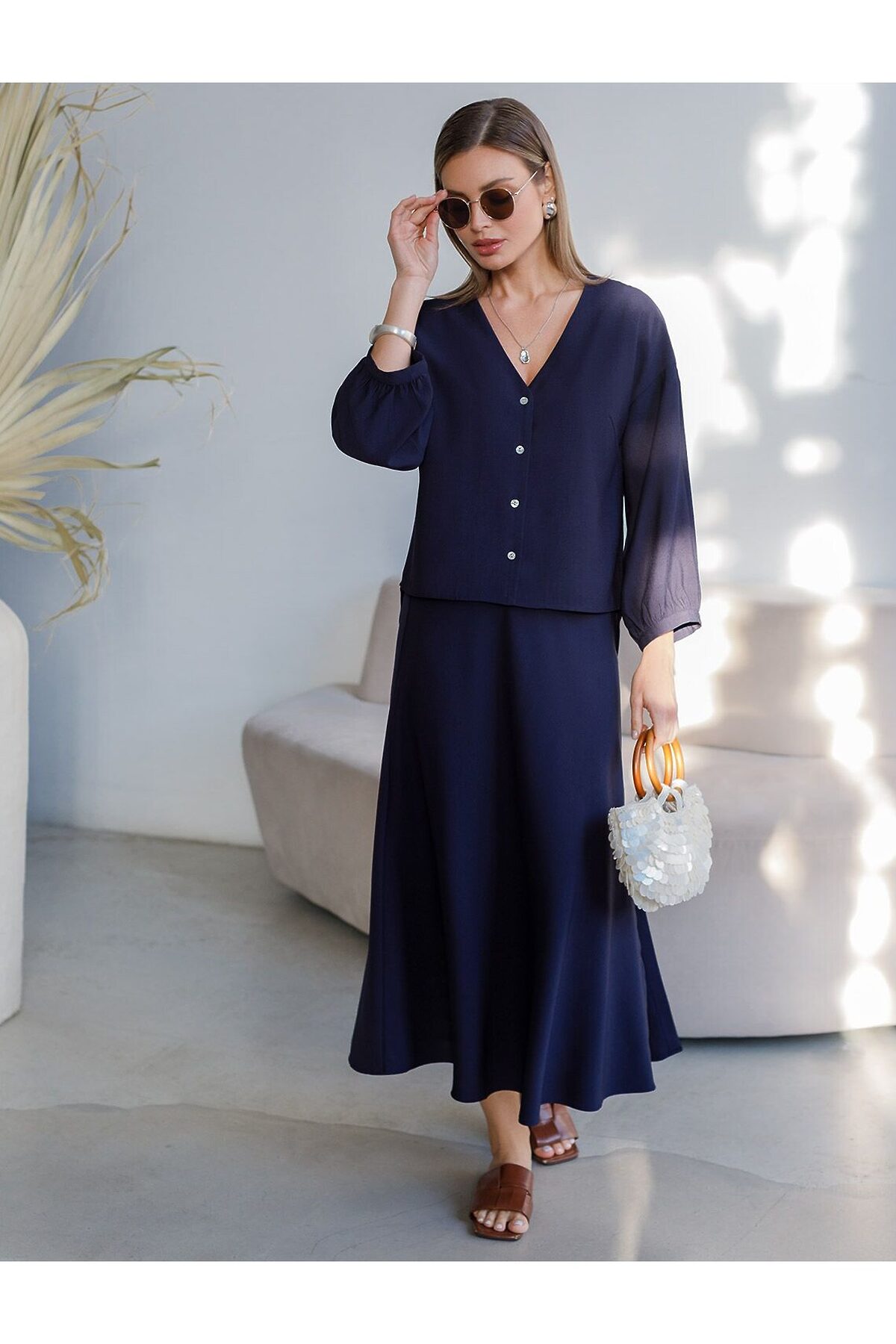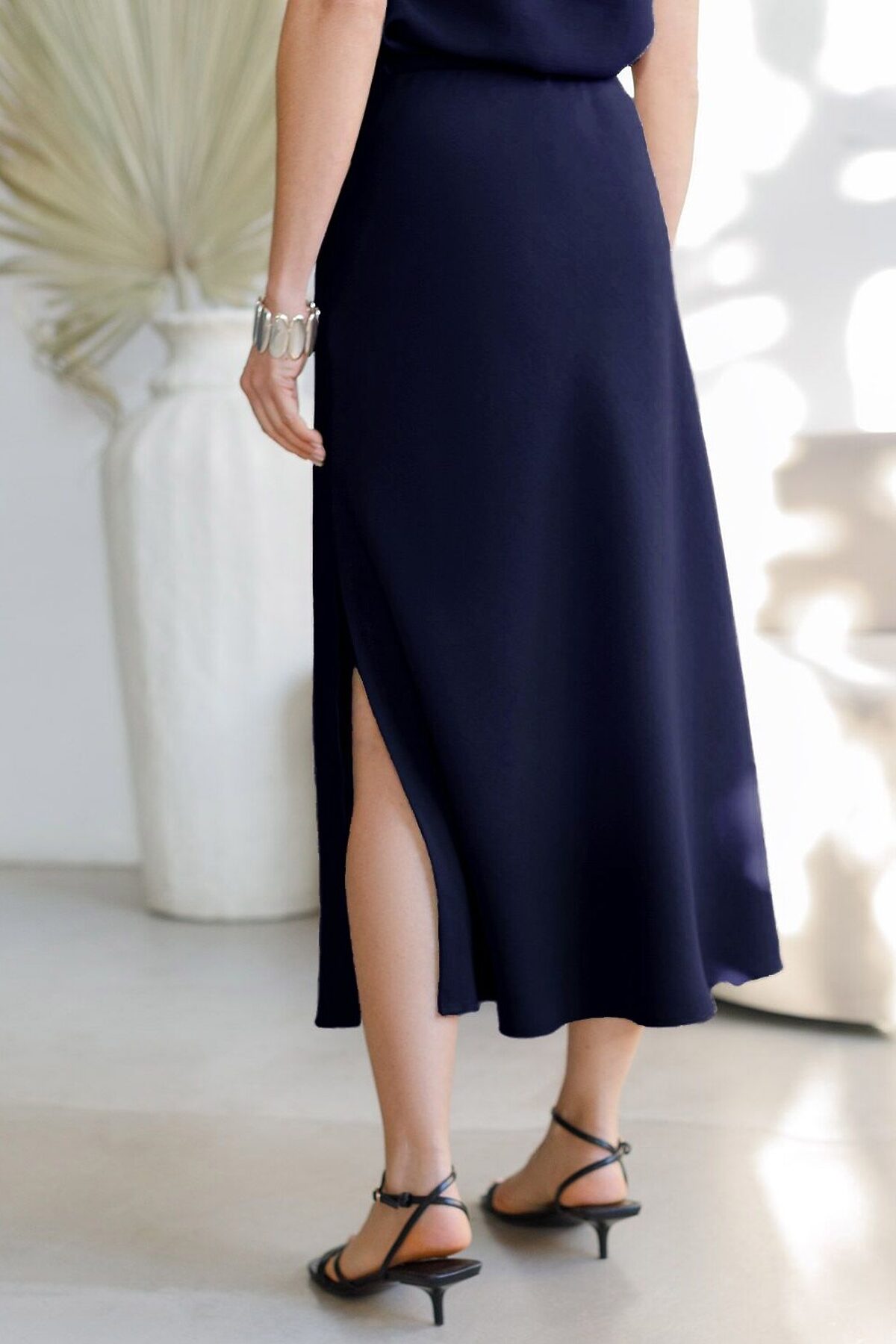 Юбка темно-синего цвета длины миди выполнена из плотного лиоцелла. Модель, скроенная по косой, мягко струится по телу и отлично драпируется. Лиоцелл это более дорогой и экологичный вариант вискозы, очень прочный и шелковистый. Ткань отличается от регулярной коллекции из лиоцелла - она содержит еще больше лиоцелла (92%), благодаря чему имеет более нежную шелковистую фактуру. Свободный крой юбки мягко скроет недостатки фигуры, акцентируя внимание на достоинствах и придавая силуэту привлекательность и женственность. Элегантная юбка на эластичном поясе гарантирует комфорт, а разрез с боку добавляет образу легкости и динамики. Расклешеная юбка подойдет на большие размеры, высокий и низкий рост. Юбка А силуэта будет базовым элементом для создания летних романтичных образов и стильных ансамблей на каждый день. Рекомендуем сочетать с артикулами: D29.356, D23.079, D27.004