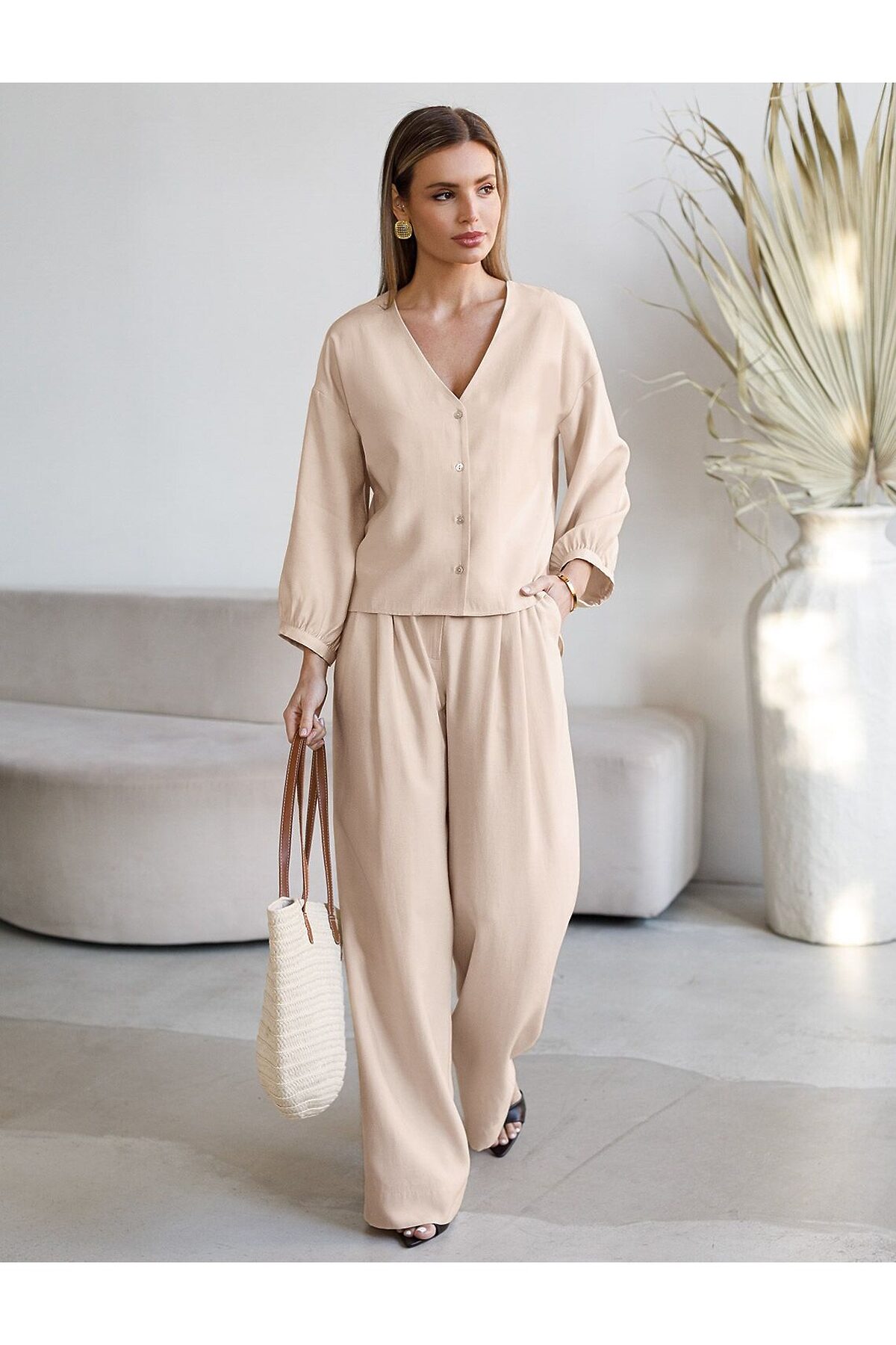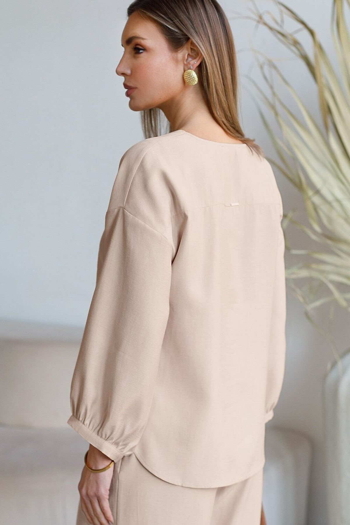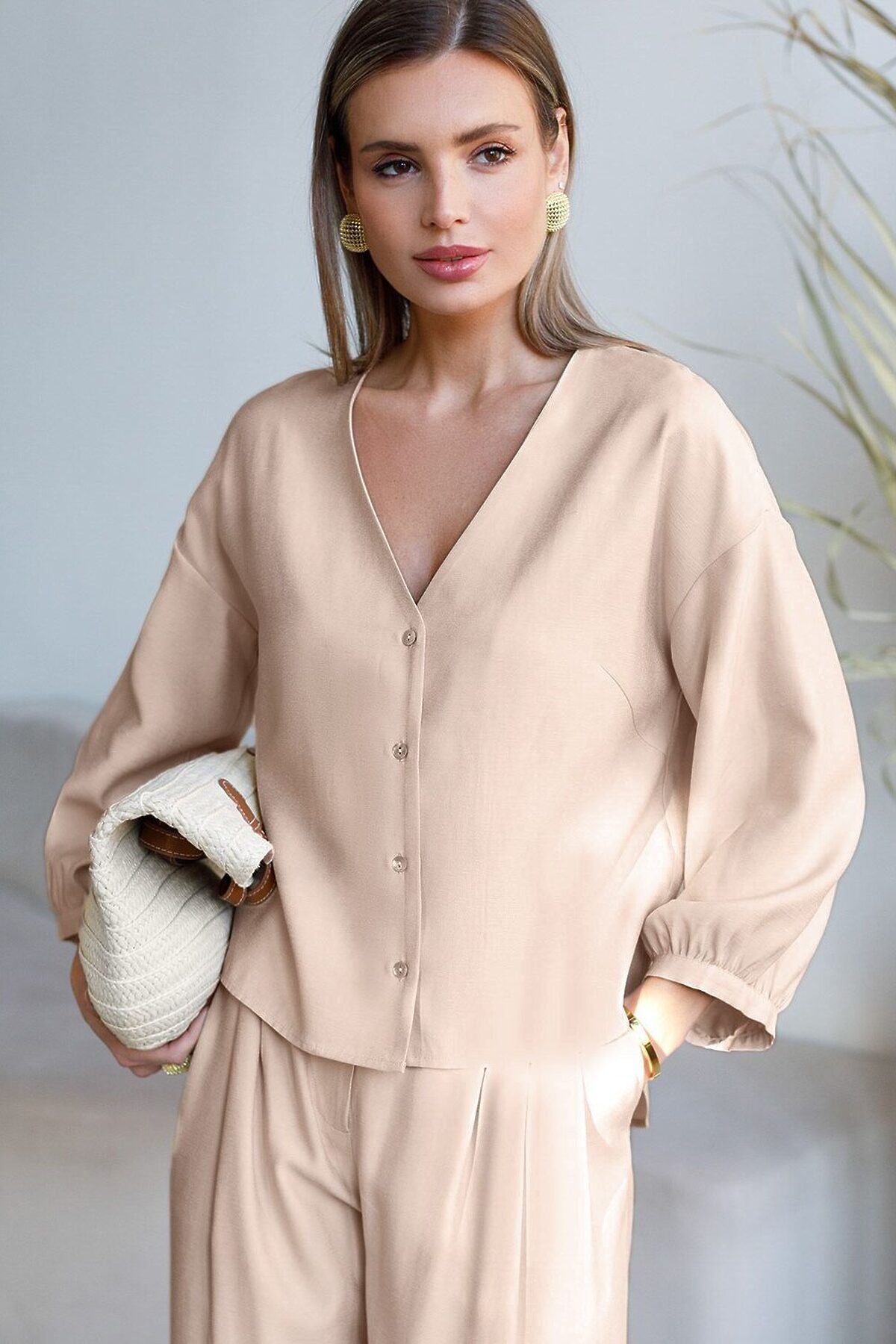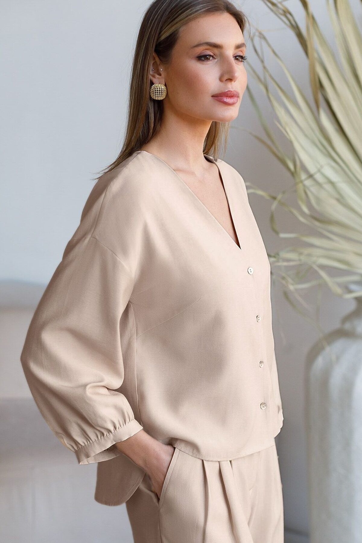 Элегантная укороченная блузка овсяного цвета выполнена из плотного лиоцелла. Лиоцелл это более дорогой и экологичный вариант вискозы, очень прочный и шелковистый. Ткань отличается от регулярной коллекции из лиоцелла - она содержит еще больше лиоцелла (92%), благодаря чему имеет более нежную шелковистую фактуру. Модель дополнена объемными рукавами длиной 7/8, создающими модный акцент. Укороченная передняя часть блузки выгодно подчеркивает линию талии, а удлиненная спинка обеспечивает комфорт. Этот асимметричный фасон придает образу динамичности, а V вырез визуально вытягивает силуэт. Свободный крой романтиной блузки не сковывает движений и отлично садится по фигуре даже на большие размеры, скрывая возможные недостатки. Эта легкая блузка с застежкой на пуговицы идеальный выборо для комфорта и стиля в теплое время года, она идеально адаптируется под любой повод. Реомендуем сочетать с артикулами: D26.208, D24.313