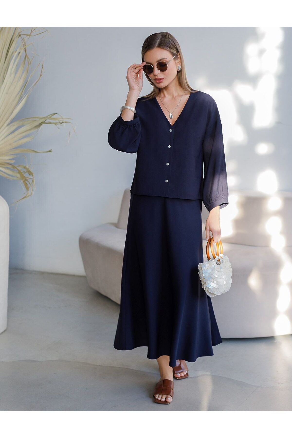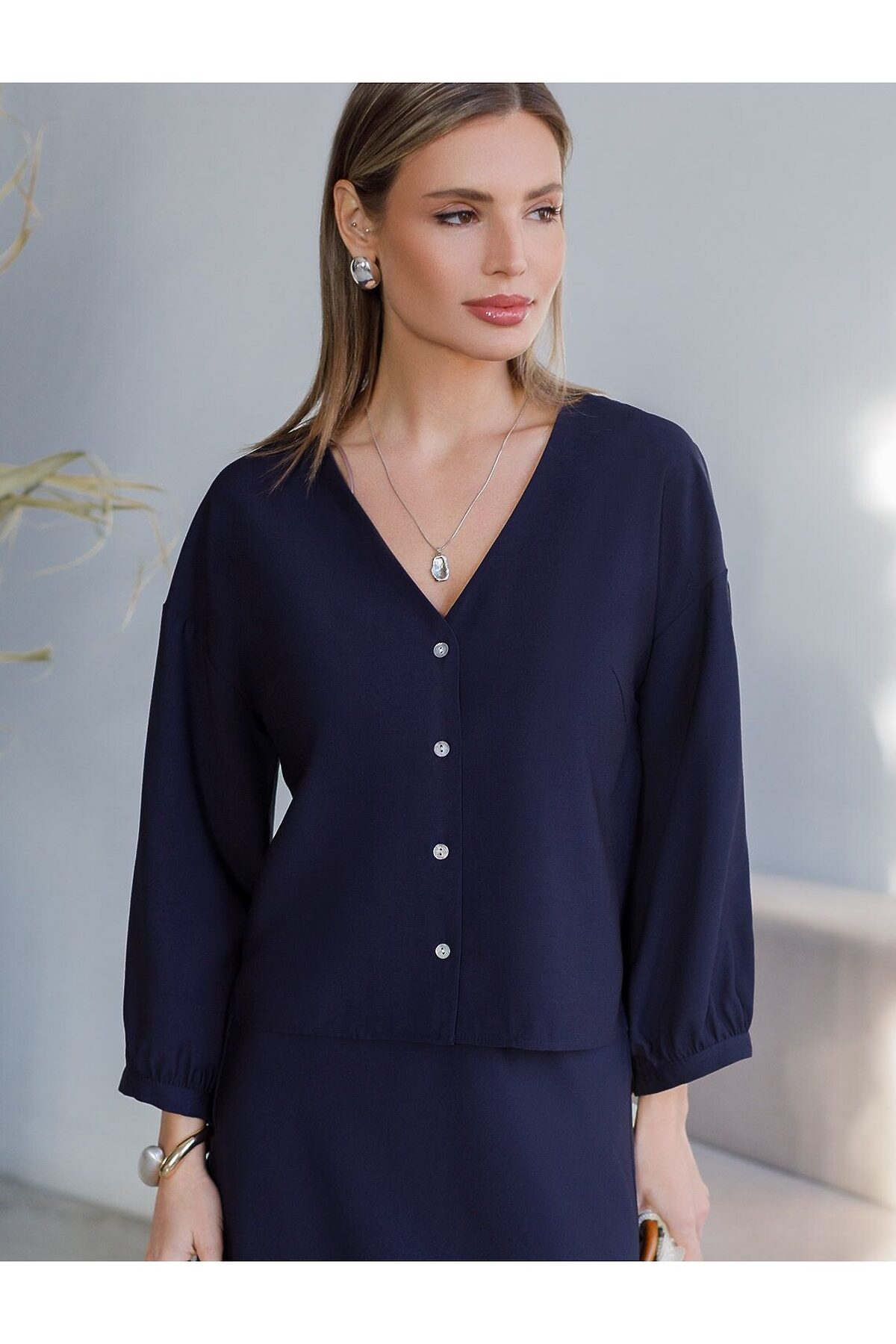 Элегантная укороченная блузка темно-синего цвета выполнена из плотного лиоцелла. Лиоцелл это более дорогой и экологичный вариант вискозы, очень прочный и шелковистый. Ткань отличается от регулярной коллекции из лиоцелла - она содержит еще больше лиоцелла (92%), благодаря чему имеет более нежную шелковистую фактуру. Модель дополнена объемными рукавами длиной 7/8, создающими модный акцент. Укороченная передняя часть блузки выгодно подчеркивает линию талии, а удлиненная спинка обеспечивает комфорт. Этот асимметричный фасон придает образу динамичности, а V вырез визуально вытягивает силуэт. Свободный крой романтиной блузки не сковывает движений и отлично садится по фигуре даже на большие размеры, скрывая возможные недостатки. Эта легкая блузка с застежкой на пуговицы идеальный выборо для комфорта и стиля в теплое время года, она идеально адаптируется под любой повод. Реомендуем сочетать с артикулами: D26.208, D24.313