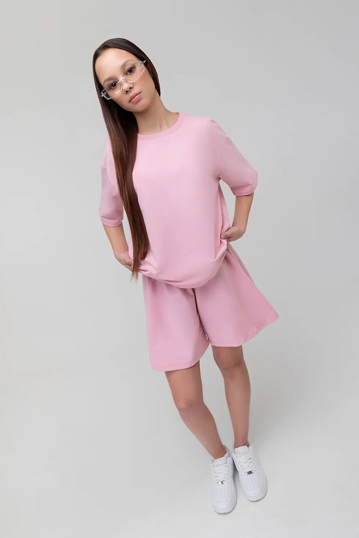 Костюм для детей школьного возраста. Футболка свободного силуэта, слегка укорочена, с втачным коротким рукавом. Горловина футболки округлой формы. Низ изделия прямой. Шорты для детей школьного возраста. Шорты свободного кроя, на цельнокроеном поясе с внутренней резинкой.