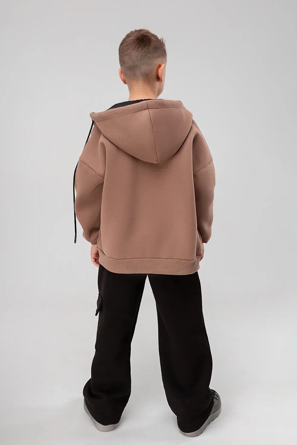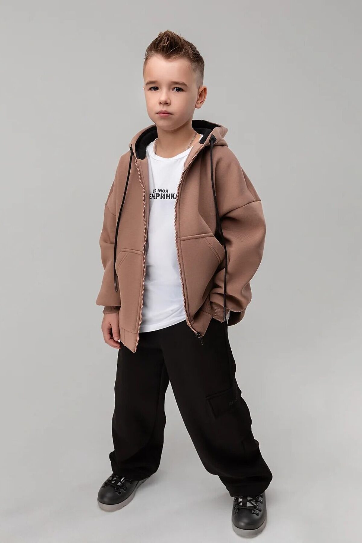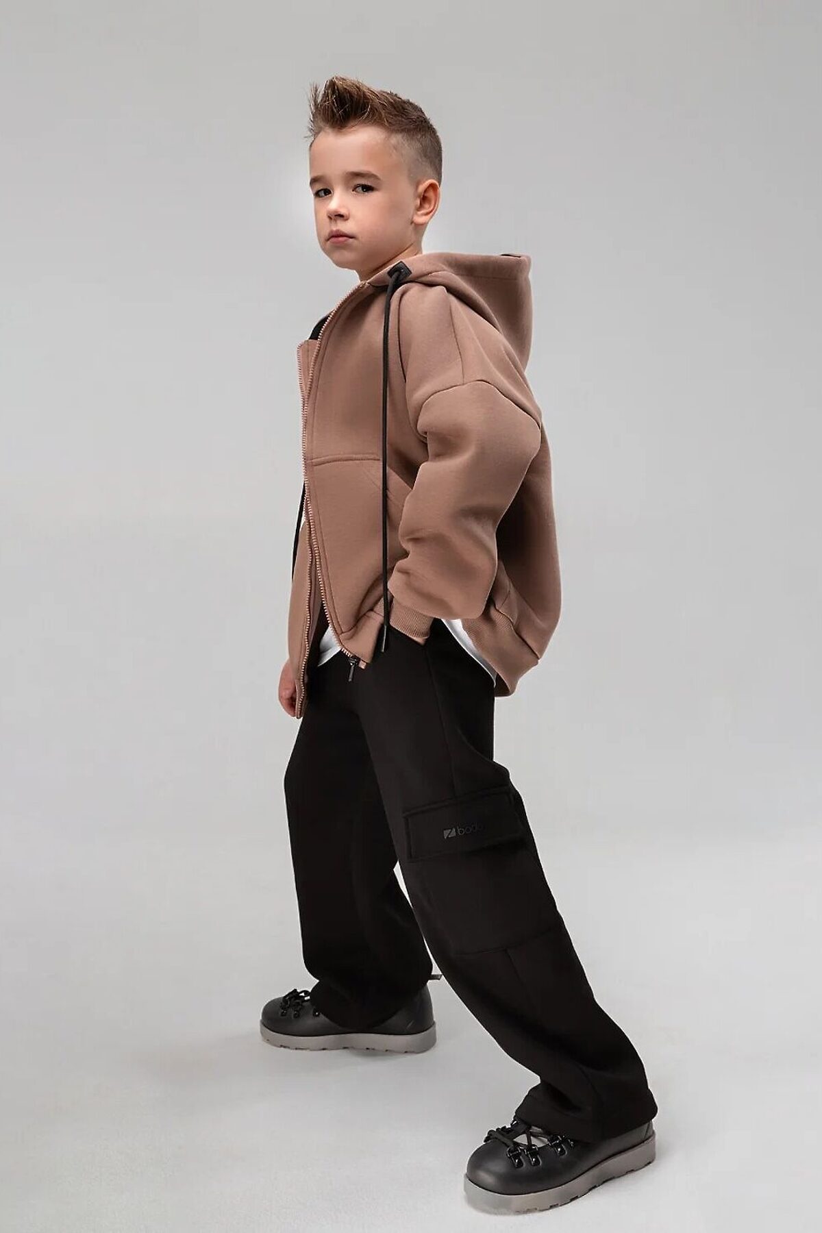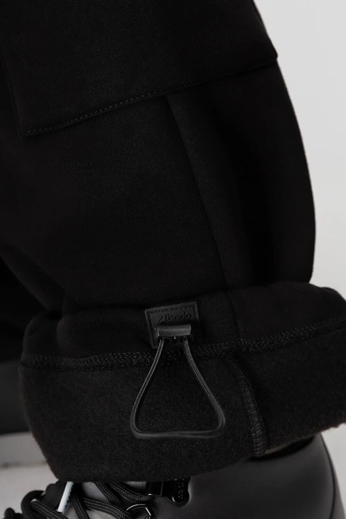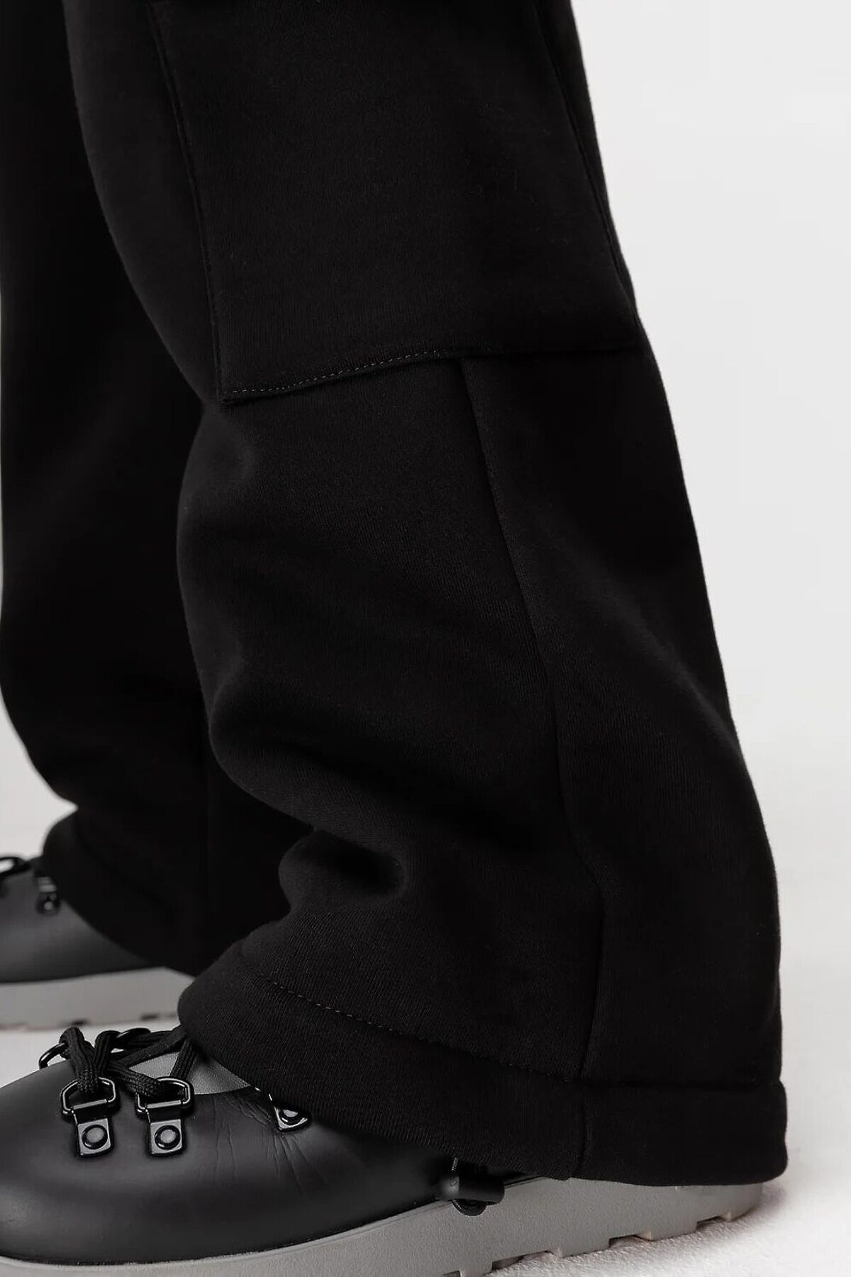Прямые, свободные брюки по низу с дополнительной резинкой с фиксатором для затяжки. Брюки с двумя видами карманов: отрезной бочок и накладной закрытый клапаном