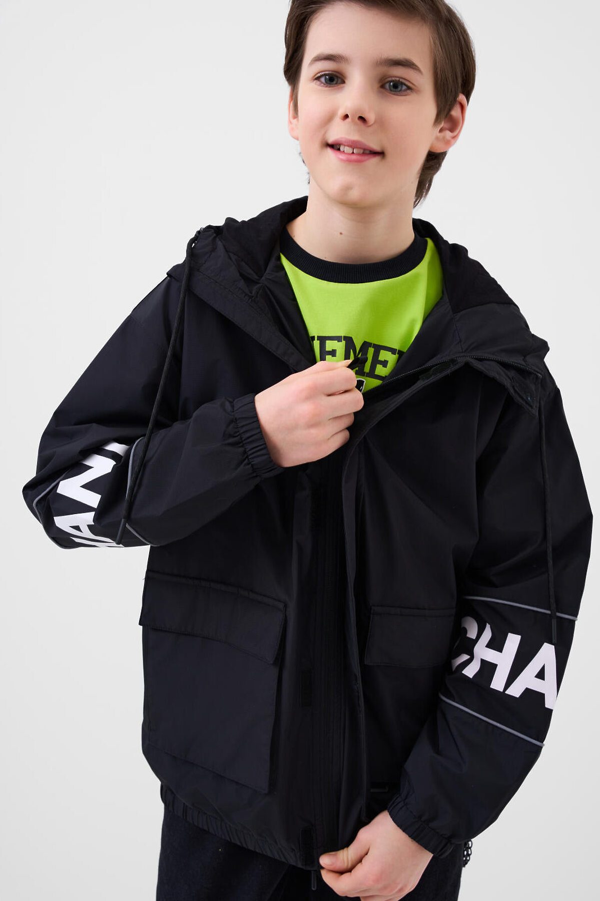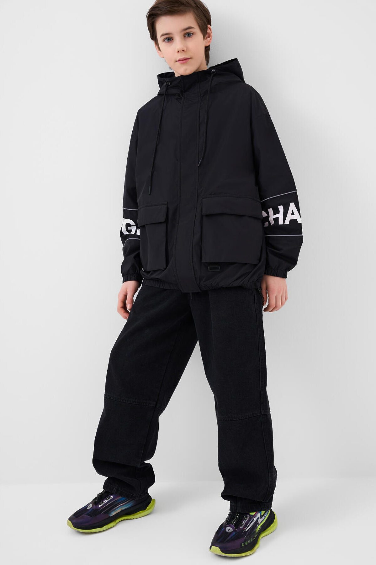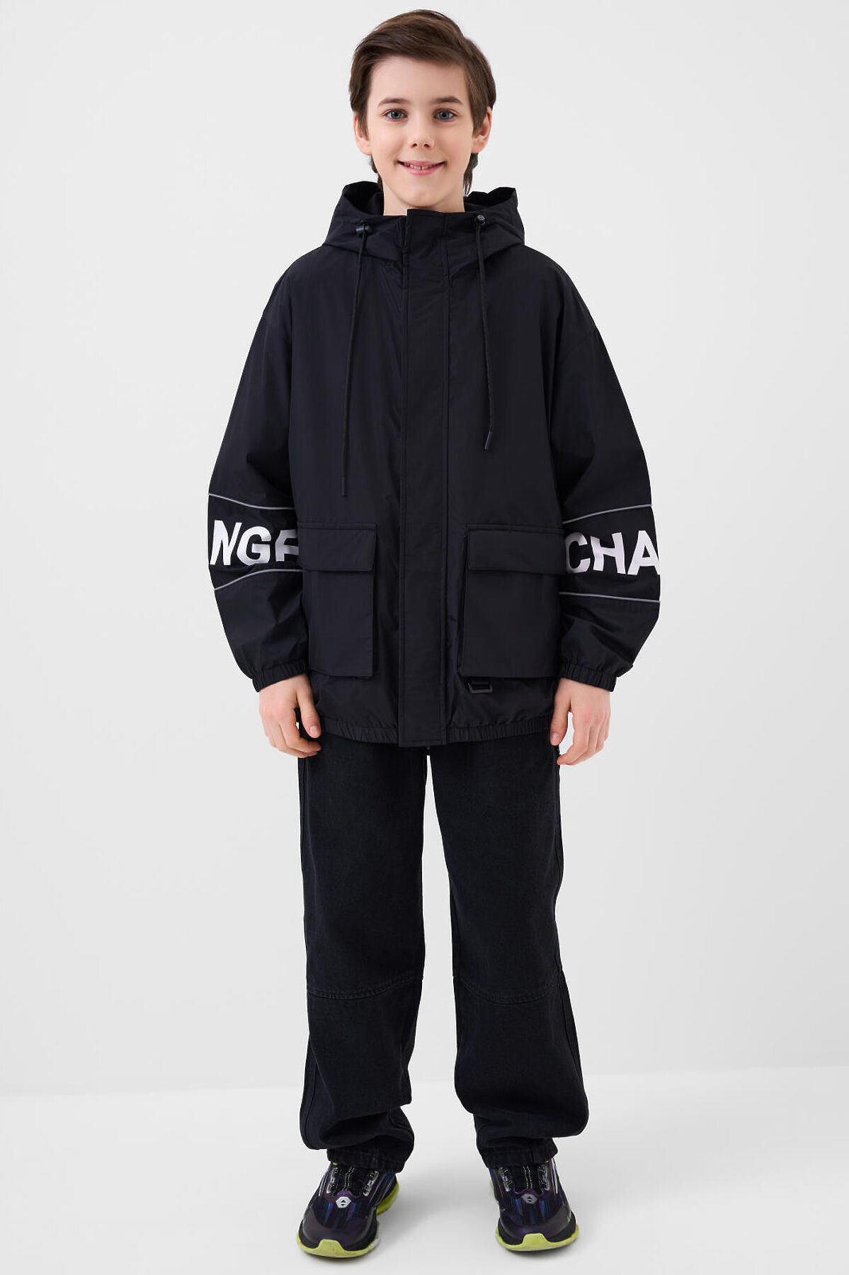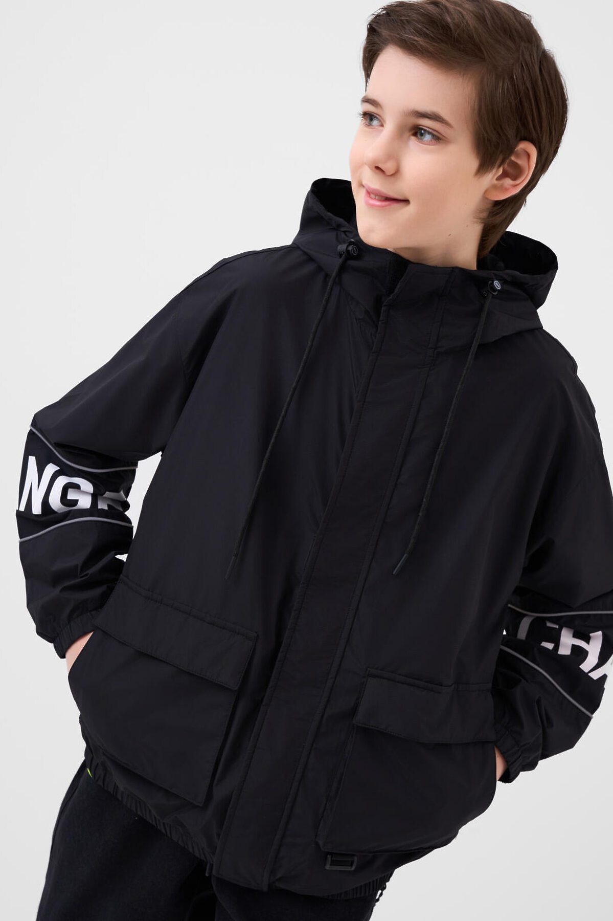 Ветровка на трикотажной подкладке для мальчика подростка. Температурный режим от +20°C до +10°C. Ветрозащитное и водоотталкивающее покрытие. Модель выполнена в черном цвете с контрастными белыми деталями. На рукавах — вставки со светоотражающей полосой. Два объемных кармана на липучках с дополнительным боковым входом. Капюшон регулируется шнуром. По низу изделия и на рукавах — мягкие резинки. Внутренний карман на липучке и петелька для вешалки. Светоотражающие элементы добавляют безопасность в тёмное время суток.