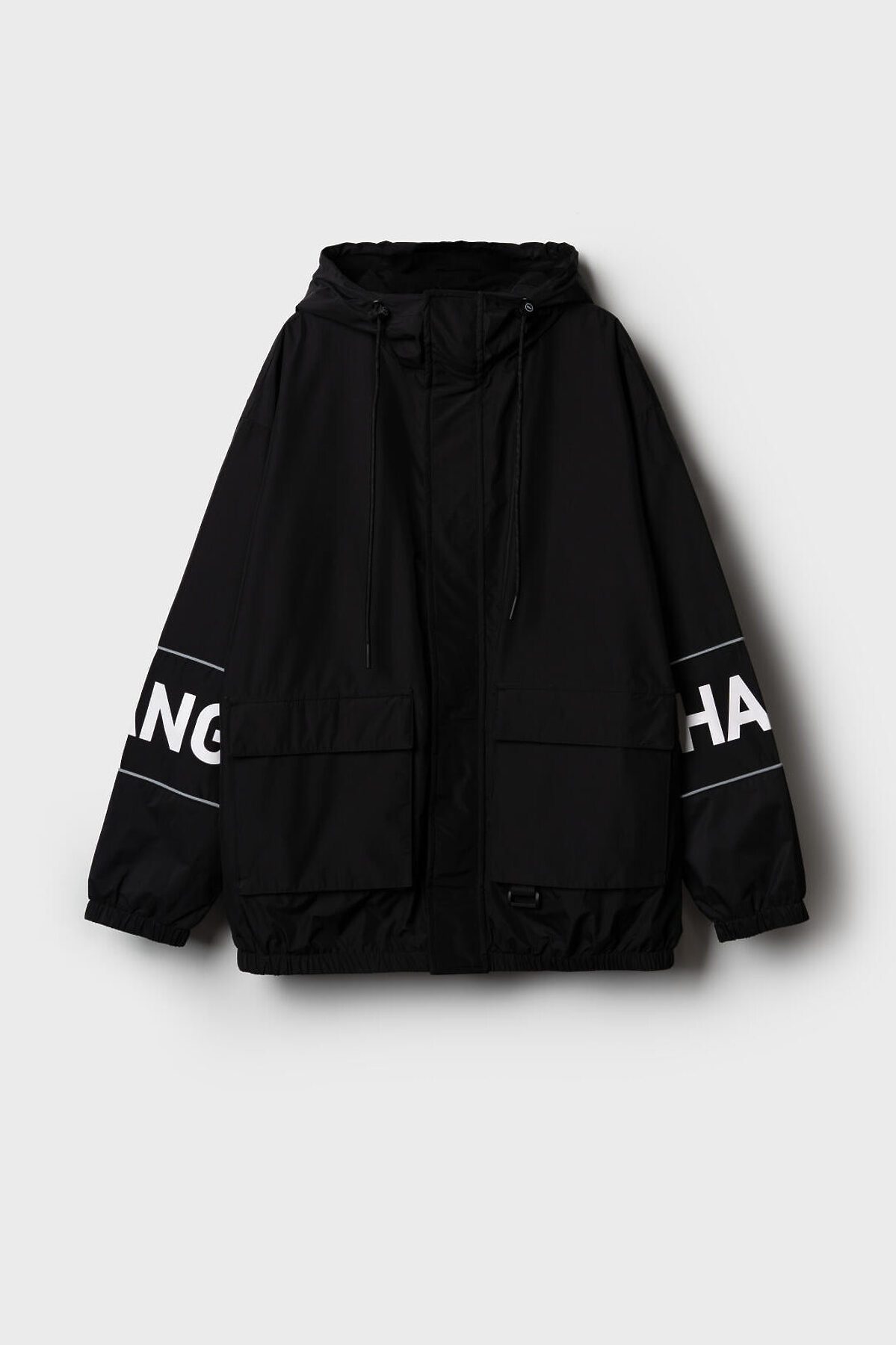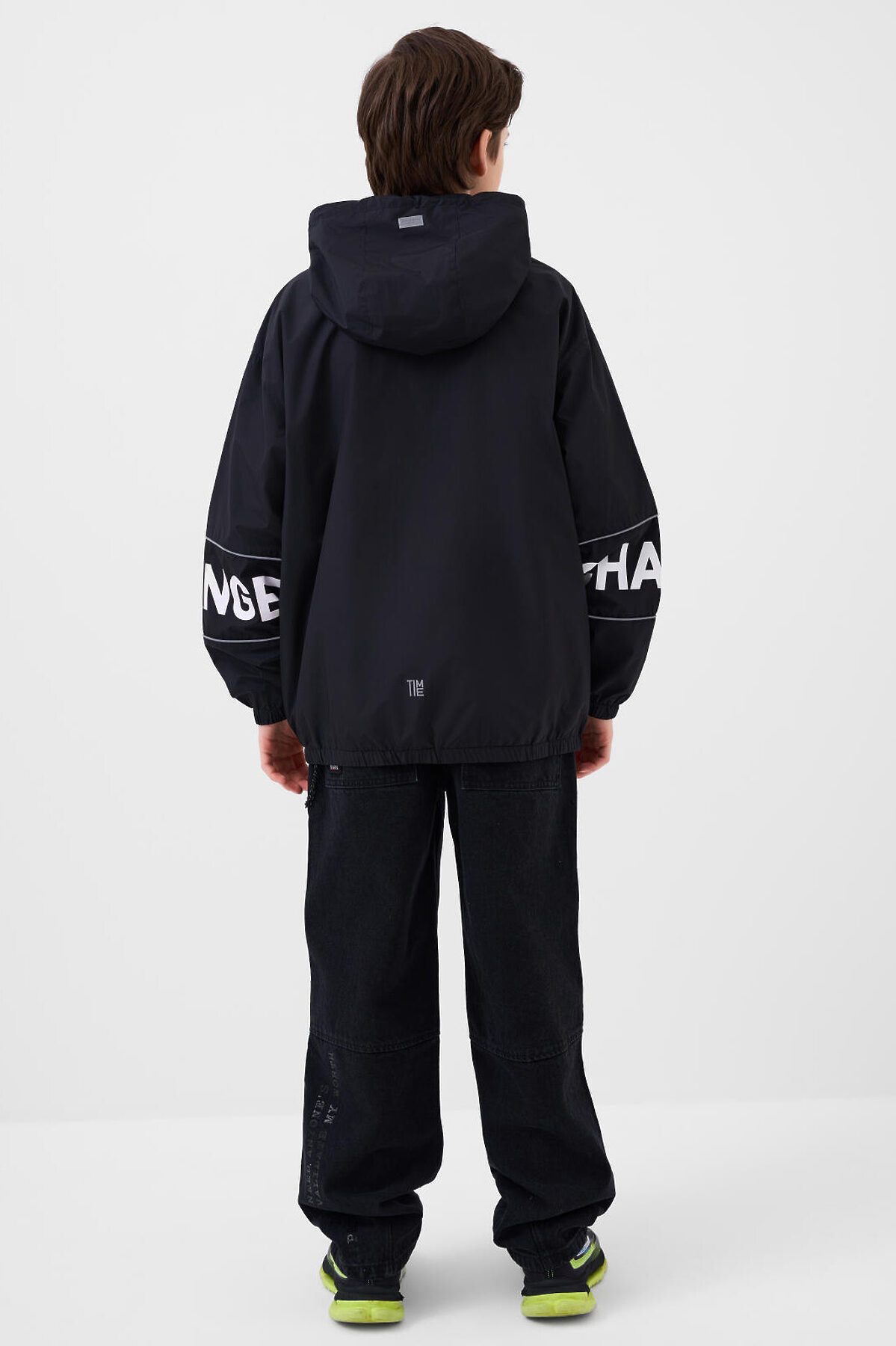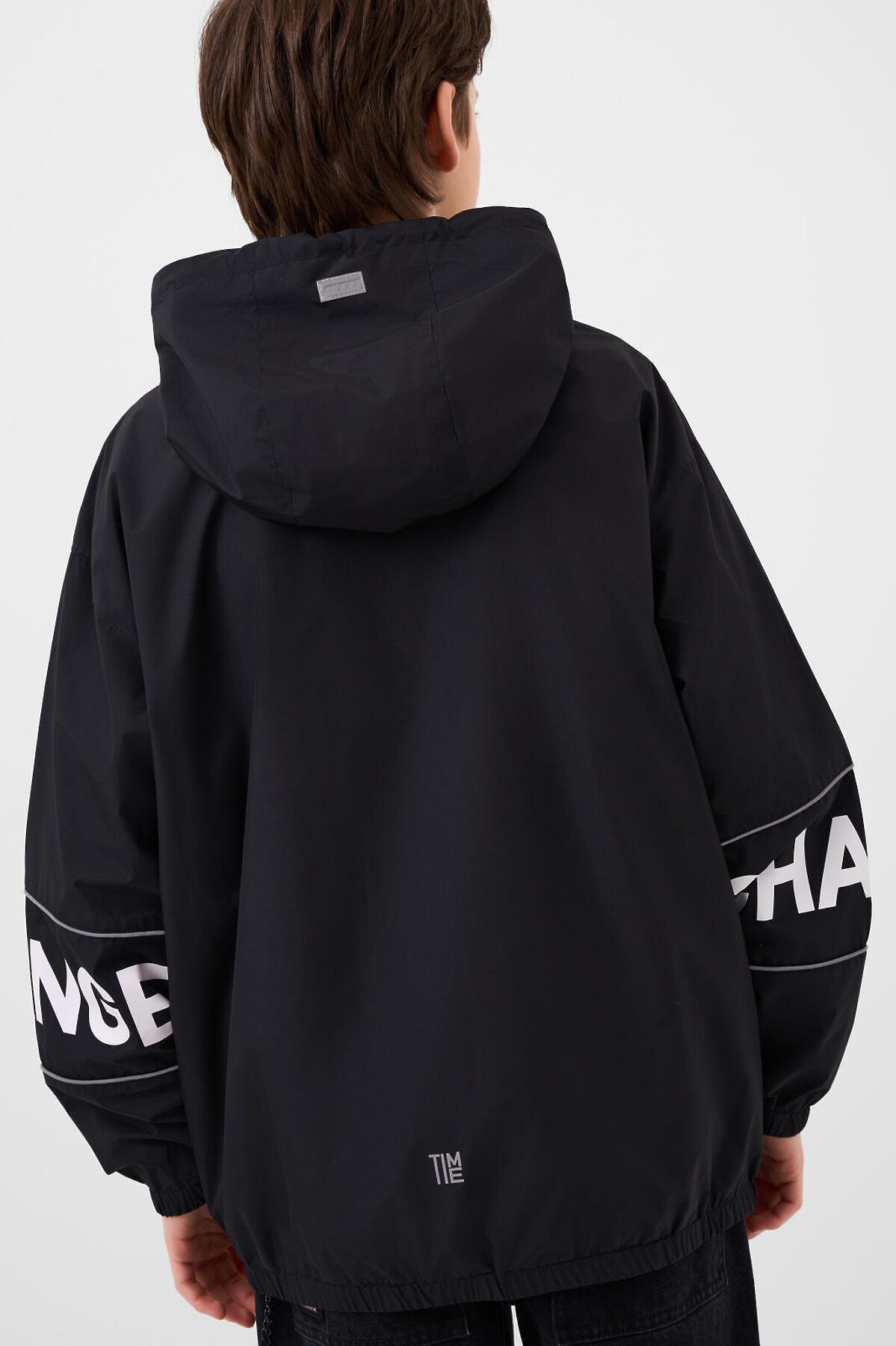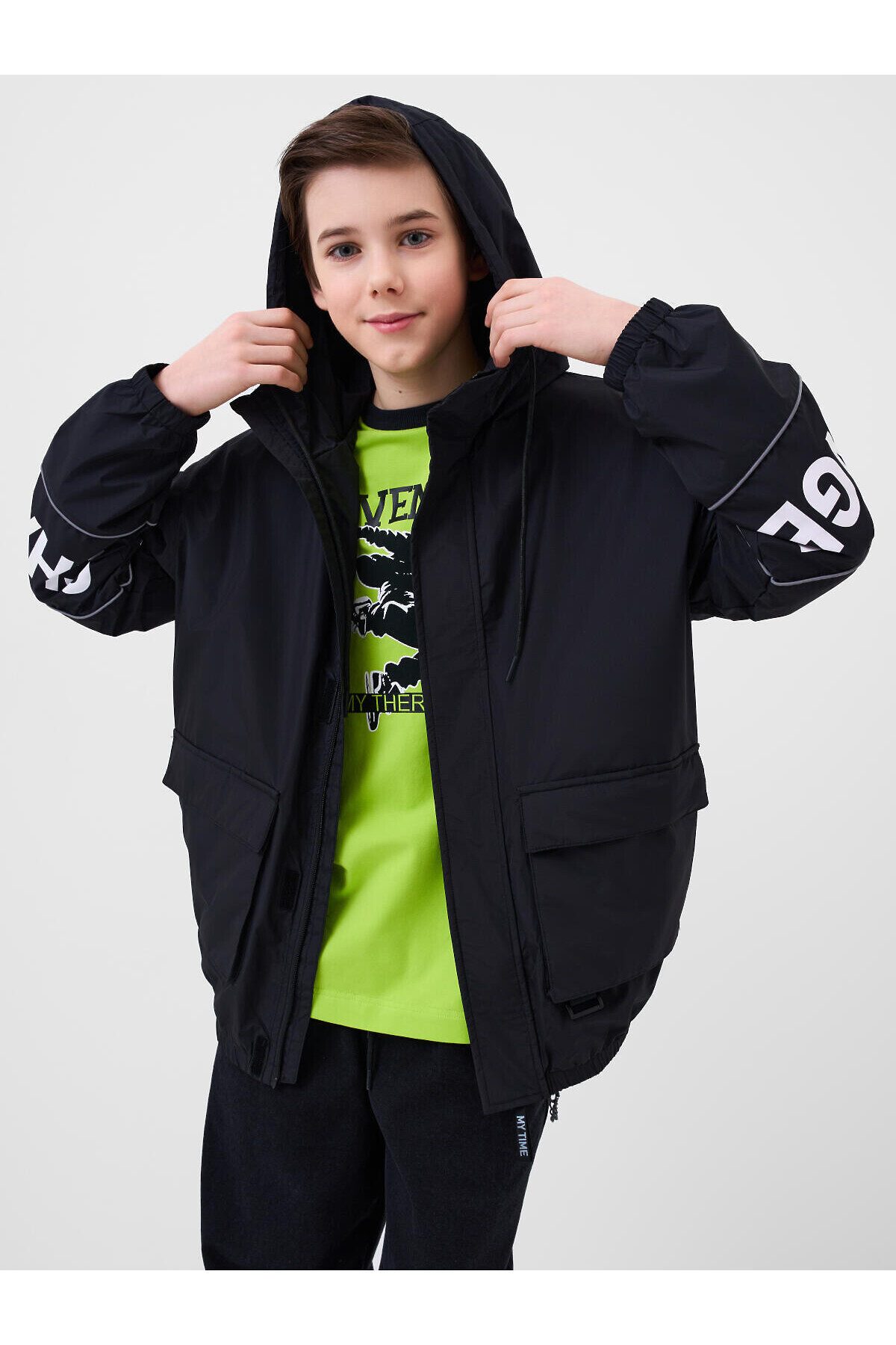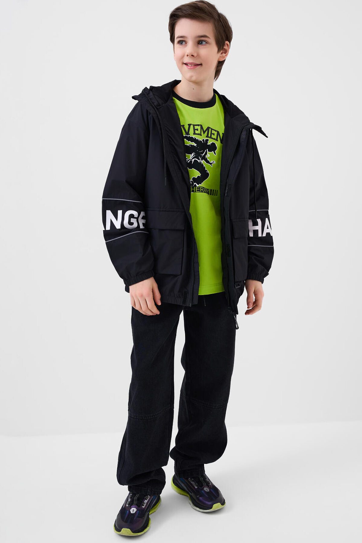 Ветровка на трикотажной подкладке для мальчика подростка. Температурный режим от +20°C до +10°C. Ветрозащитное и водоотталкивающее покрытие. Модель выполнена в черном цвете с контрастными белыми деталями. На рукавах — вставки со светоотражающей полосой. Два объемных кармана на липучках с дополнительным боковым входом. Капюшон регулируется шнуром. По низу изделия и на рукавах — мягкие резинки. Внутренний карман на липучке и петелька для вешалки. Светоотражающие элементы добавляют безопасность в тёмное время суток.