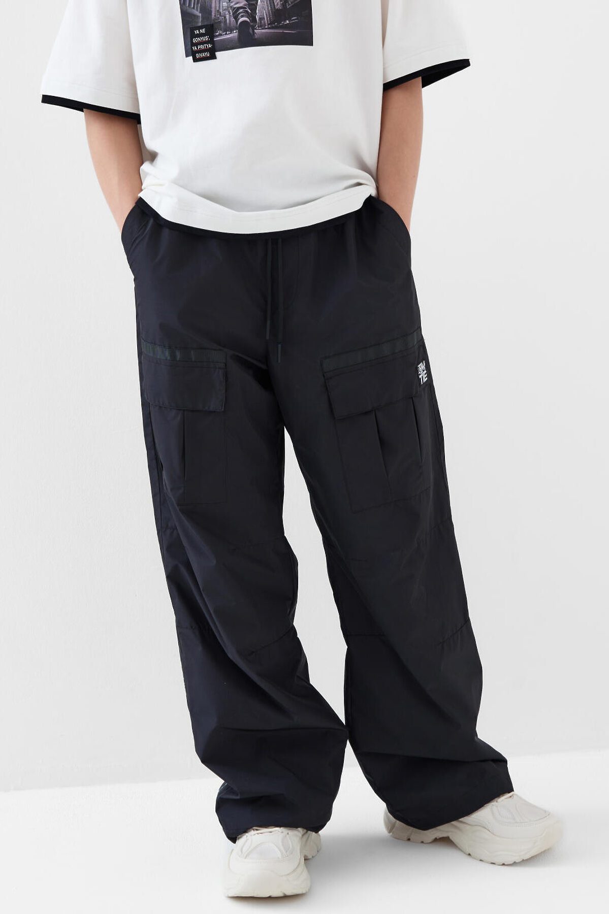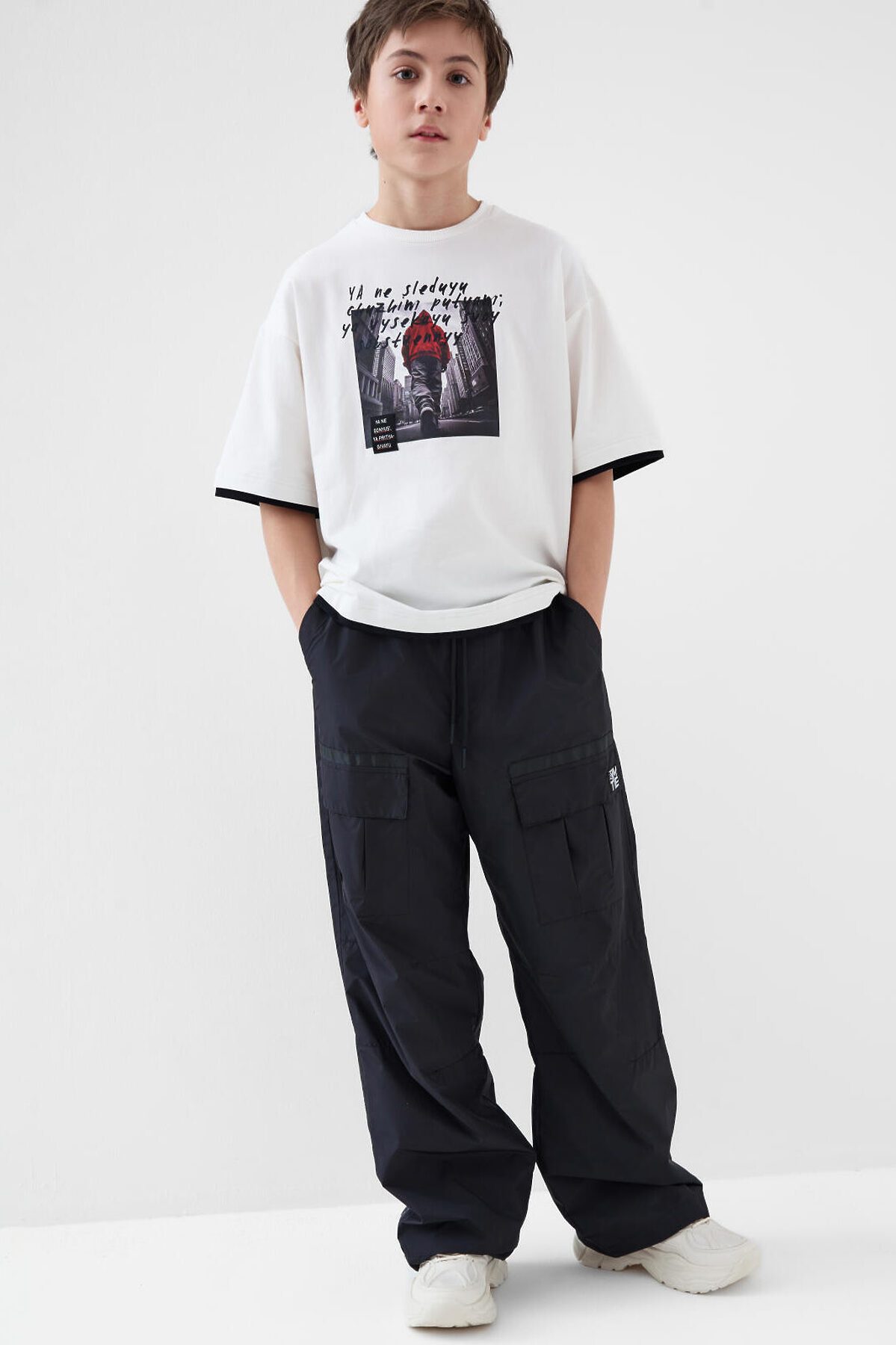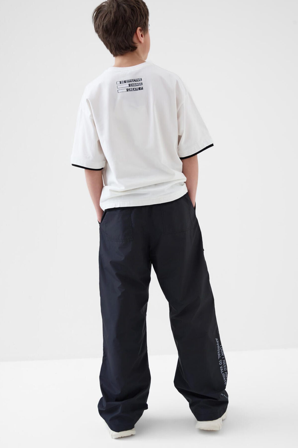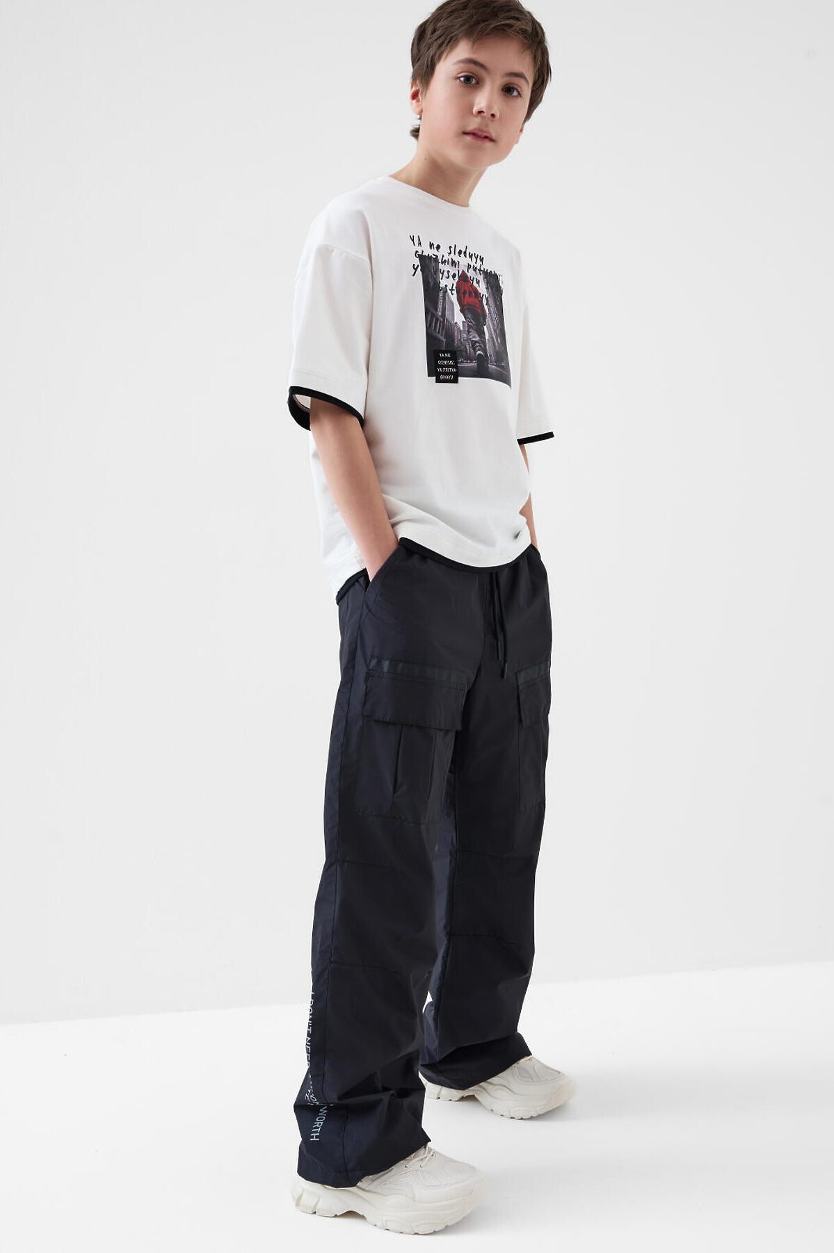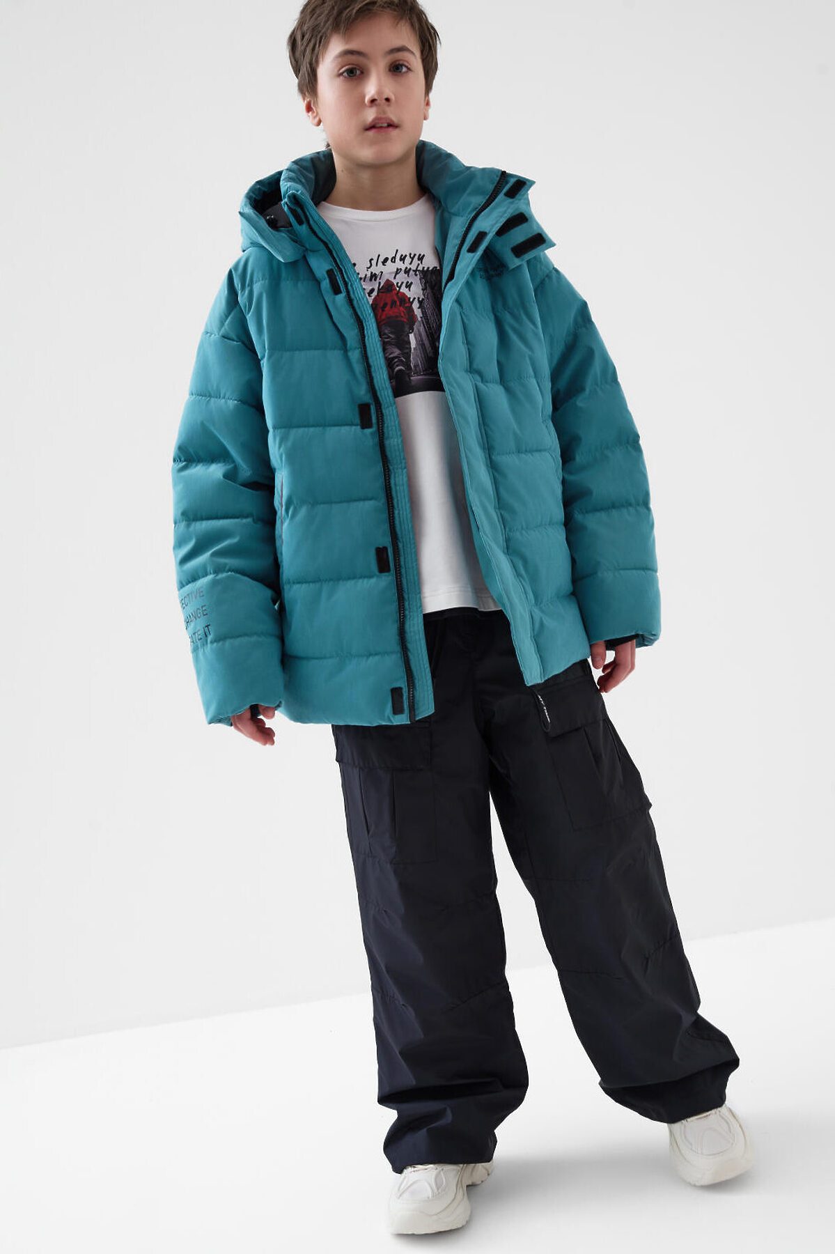 Брюки для мальчика подростка. Выполнены из плотной ткани с ветрозащитным и водоотталкивающим покрытием. Модель свободного прямого кроя со средней посадкой. Боковые карманы. На брючинах большие накладные карманы с клапанами, сзади — два кармана. Пояс на резинке с утягивающим шнурком. Внизу штанин предусмотрена регулировка объема с помощью эластичного шнура. На одном из боковых карманов — фирменный жаккардовый шеврон, а на задней штанине — вертикальный принт с мотивационной надписью. Внутри — мягкая подкладка из флиса и таффеты.
