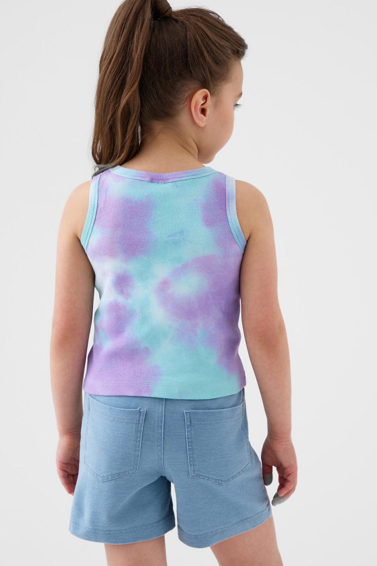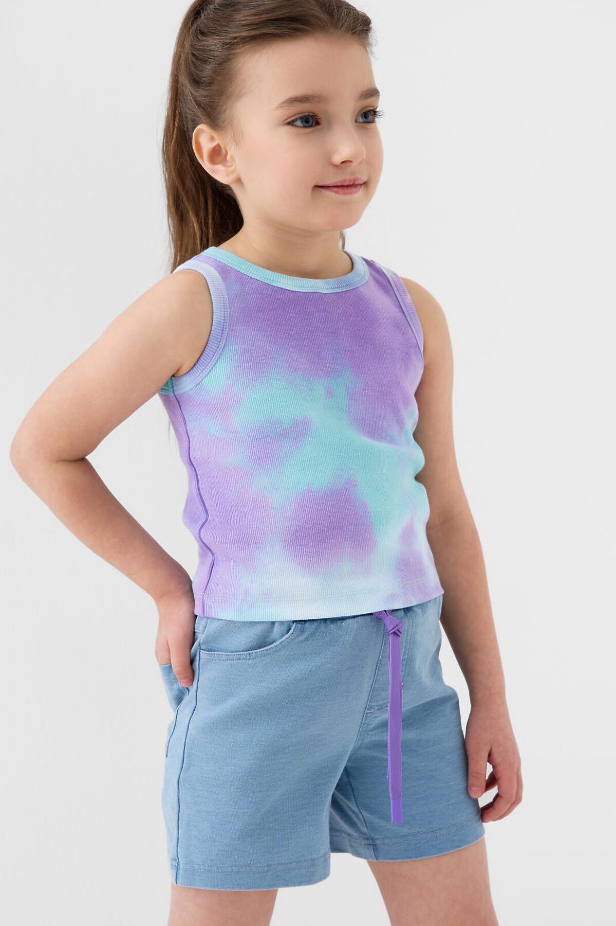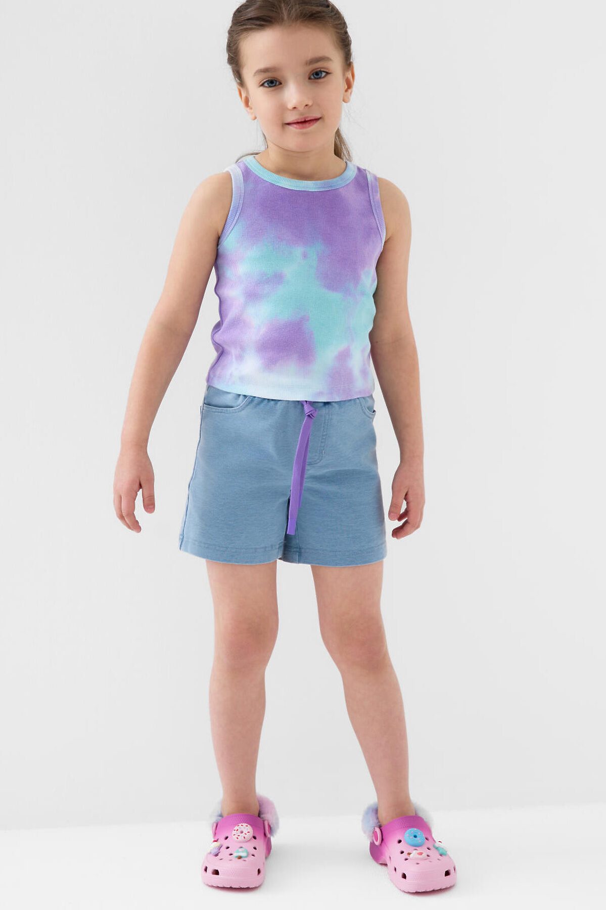 Детские шорты короткие для девочки. Модель прямого кроя. Материал визуально похож на деним, но имеет все кажется хлопкового трикотажа. Удобная посадка обеспечивается эластичным поясом со шнуром. Спереди расположены два боковых кармана, а сзади — два накладных кармана.