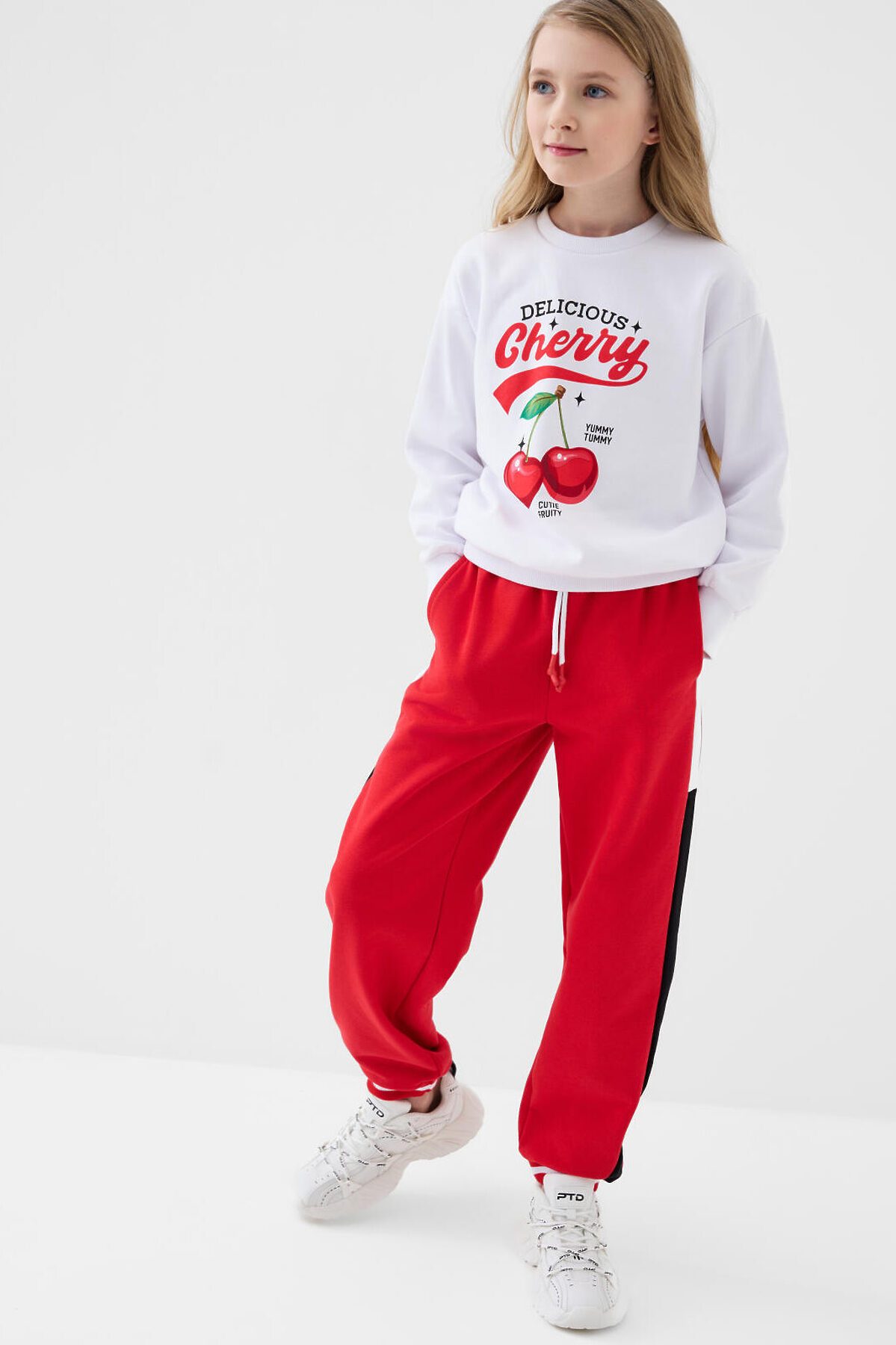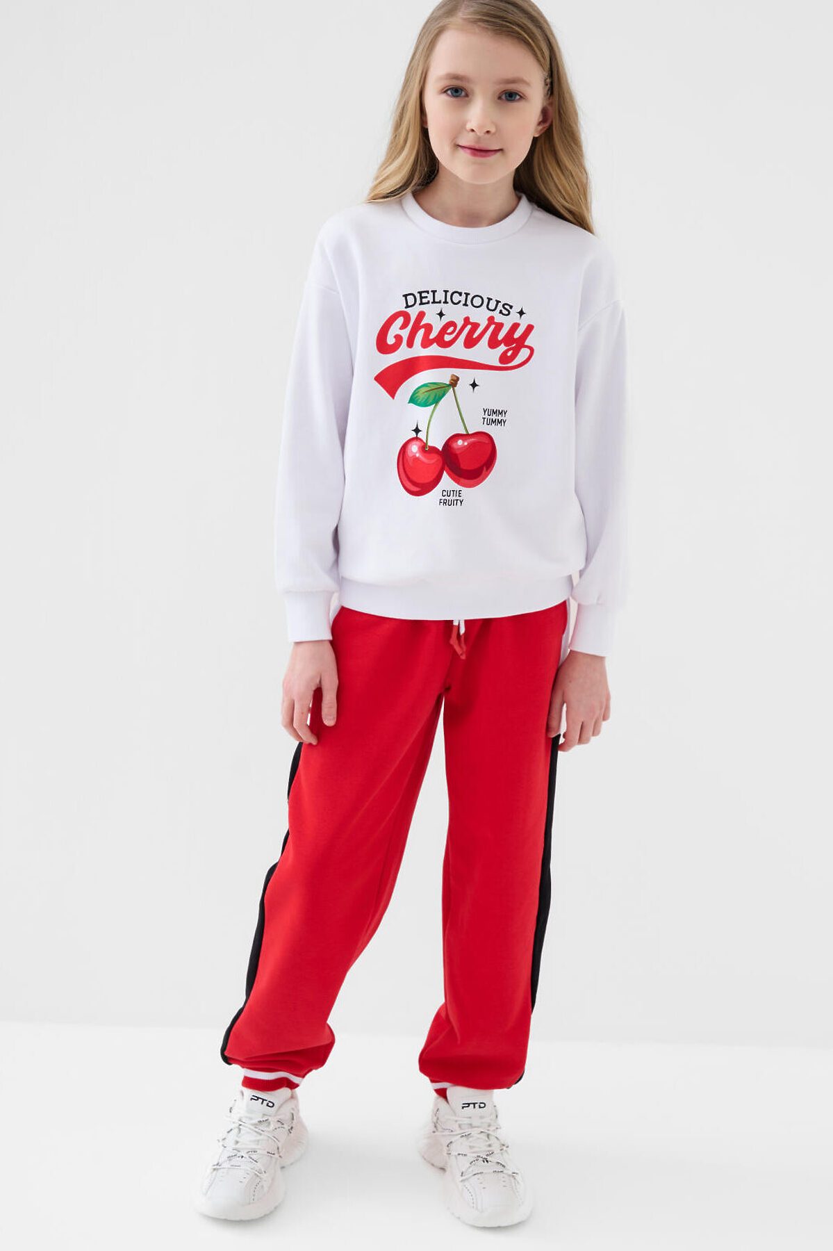 Свитшот оверсайз для девочки подростка. Выполнен из хлопкового футера без начеса. На передней части — выразительный принт с вишнями. Горловина, манжеты и низ изделия оформлены эластичными резинками.