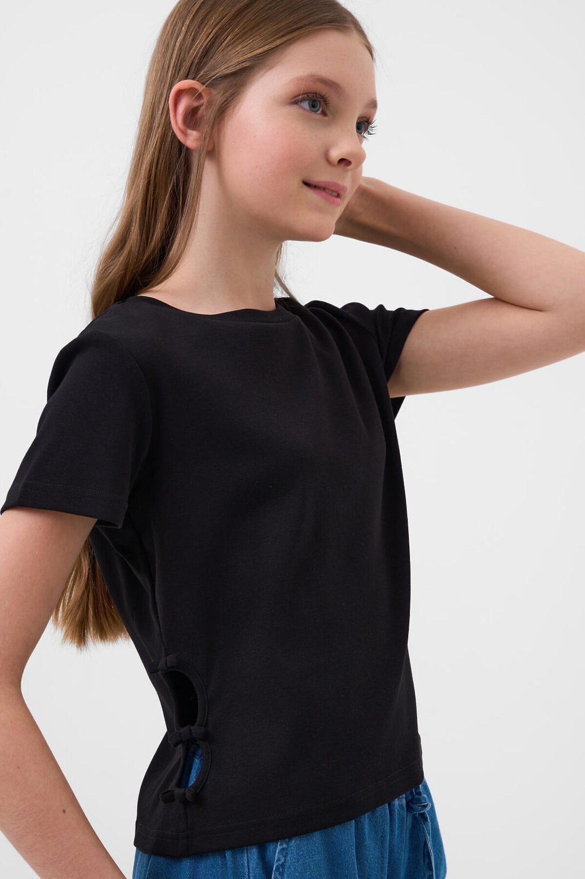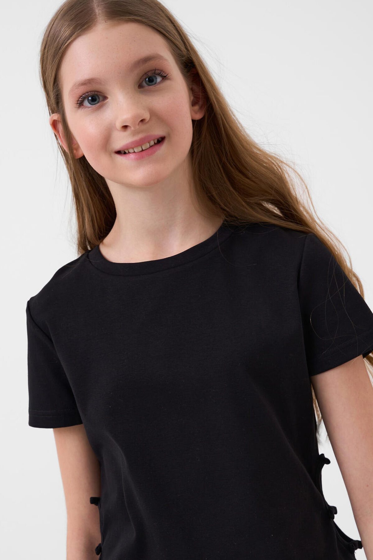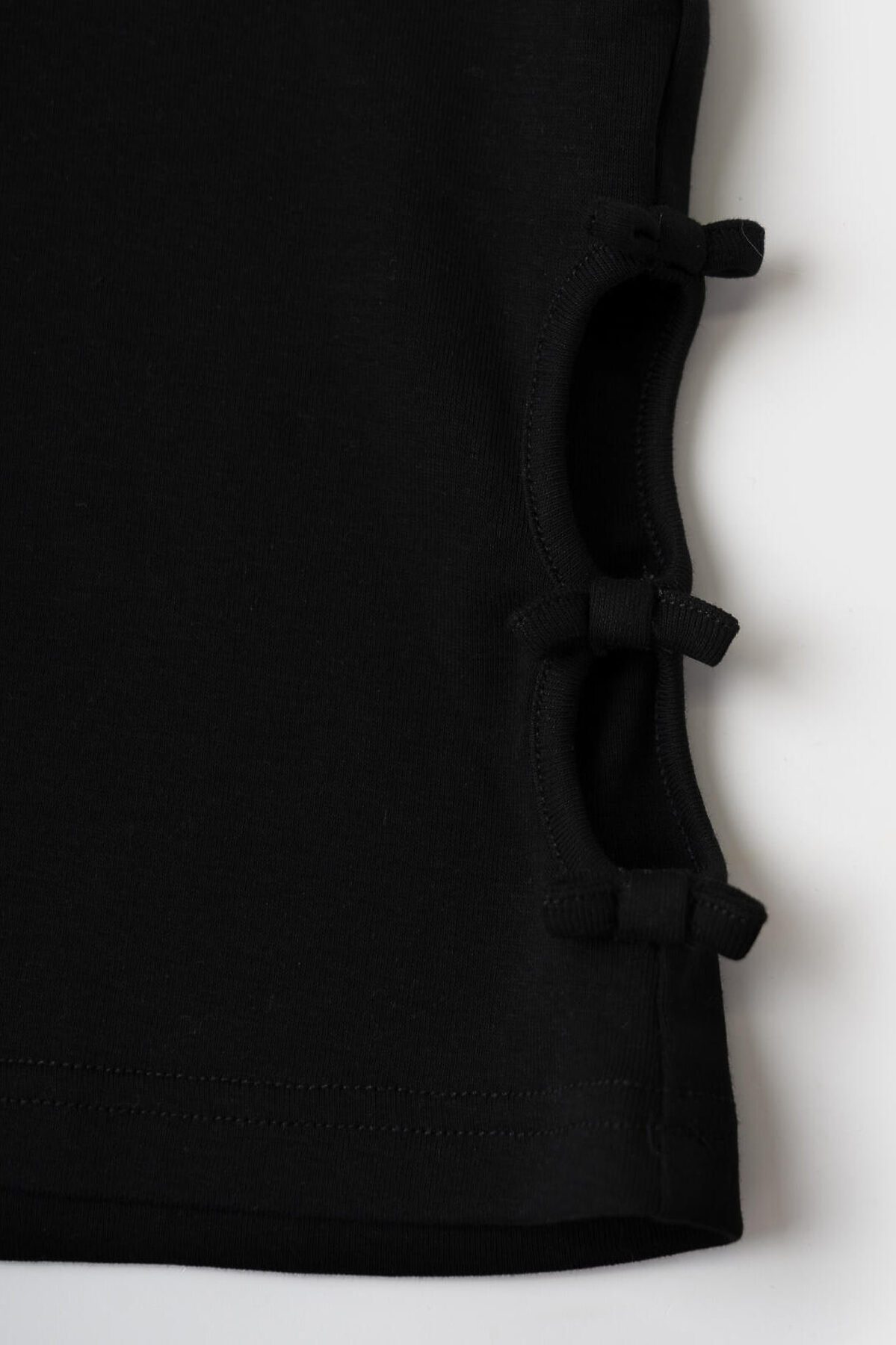 Футболка черная для девочки подростка. Модель приталенного кроя, выполнена из эластичного хлопкового трикотажа в рубчик. По бокам вырезы с декоративными бантиками.