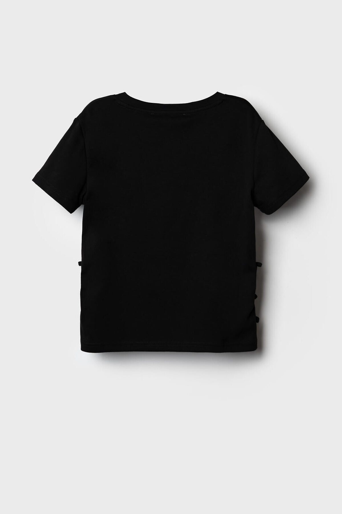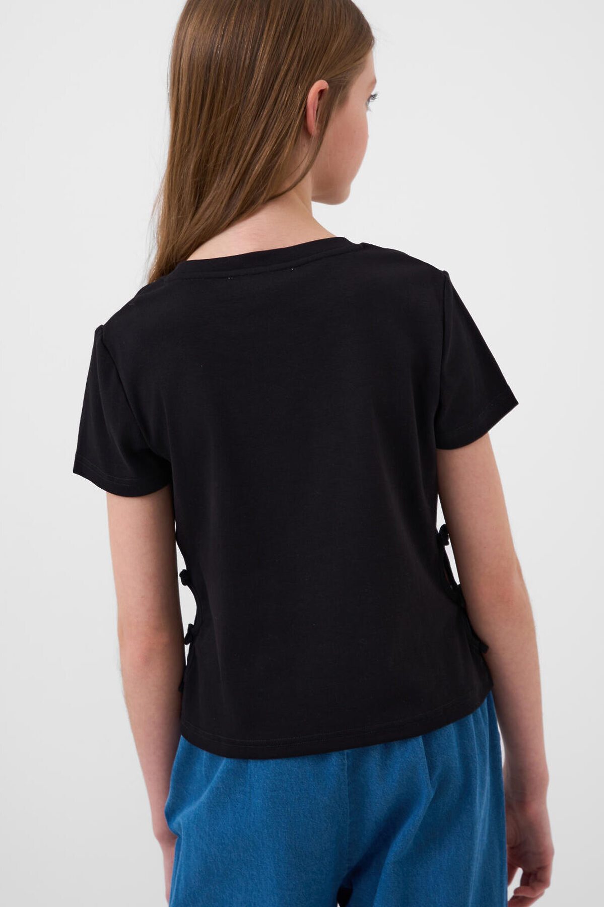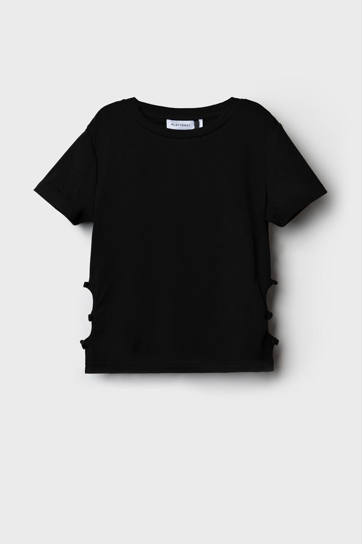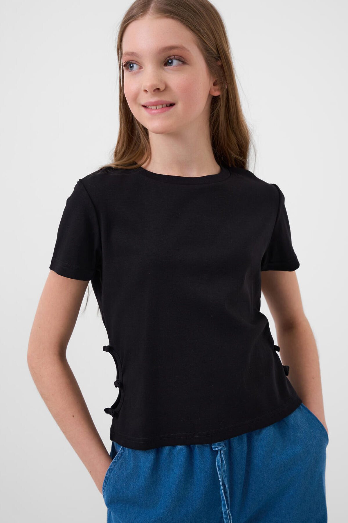 Футболка черная для девочки подростка. Модель приталенного кроя, выполнена из эластичного хлопкового трикотажа в рубчик. По бокам вырезы с декоративными бантиками.