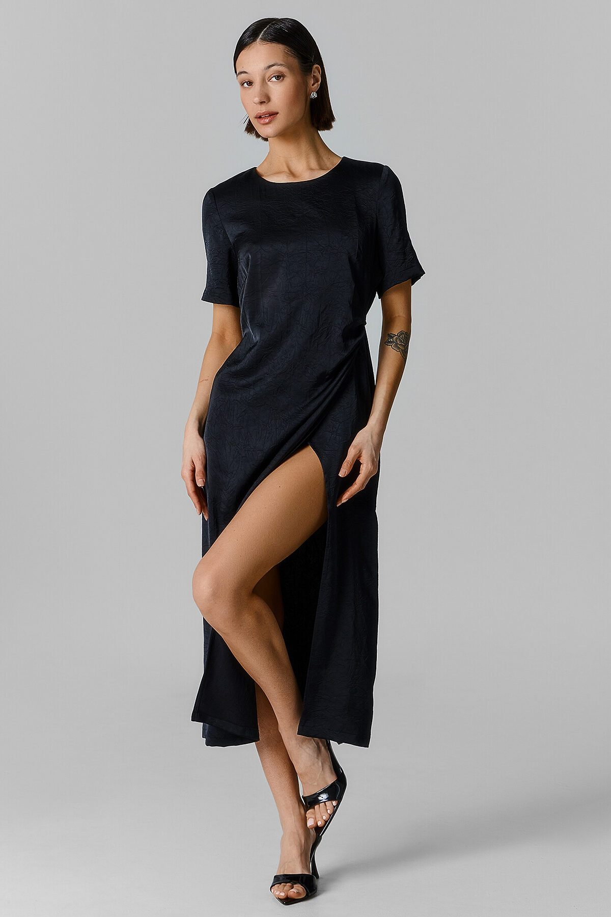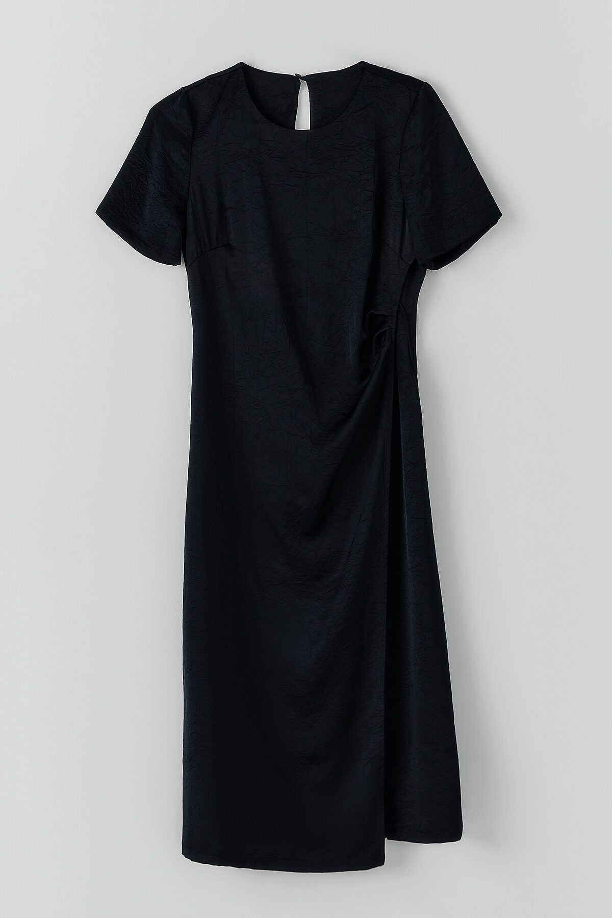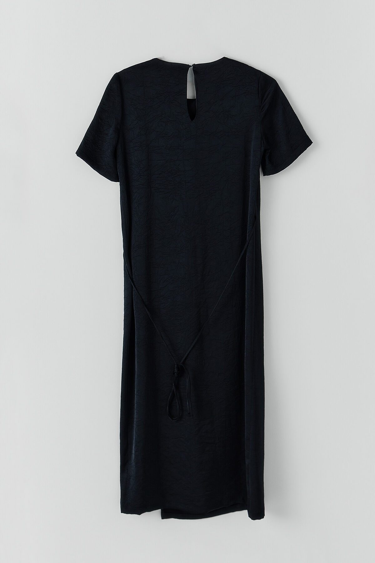 Платье полуприлегающего силуэта, перед и спинка цельнокроенные. Передняя деталь на запах, с завязками. На передней детали заложены складки. Рукава короткие, горловина обработана обтачкой из основного полотна. По спинке вырез-капелька на пуговицу 10мм и жилку тканую (жилка Jw34493, WT4-4). Низ изделия и рукавов в подгибку.