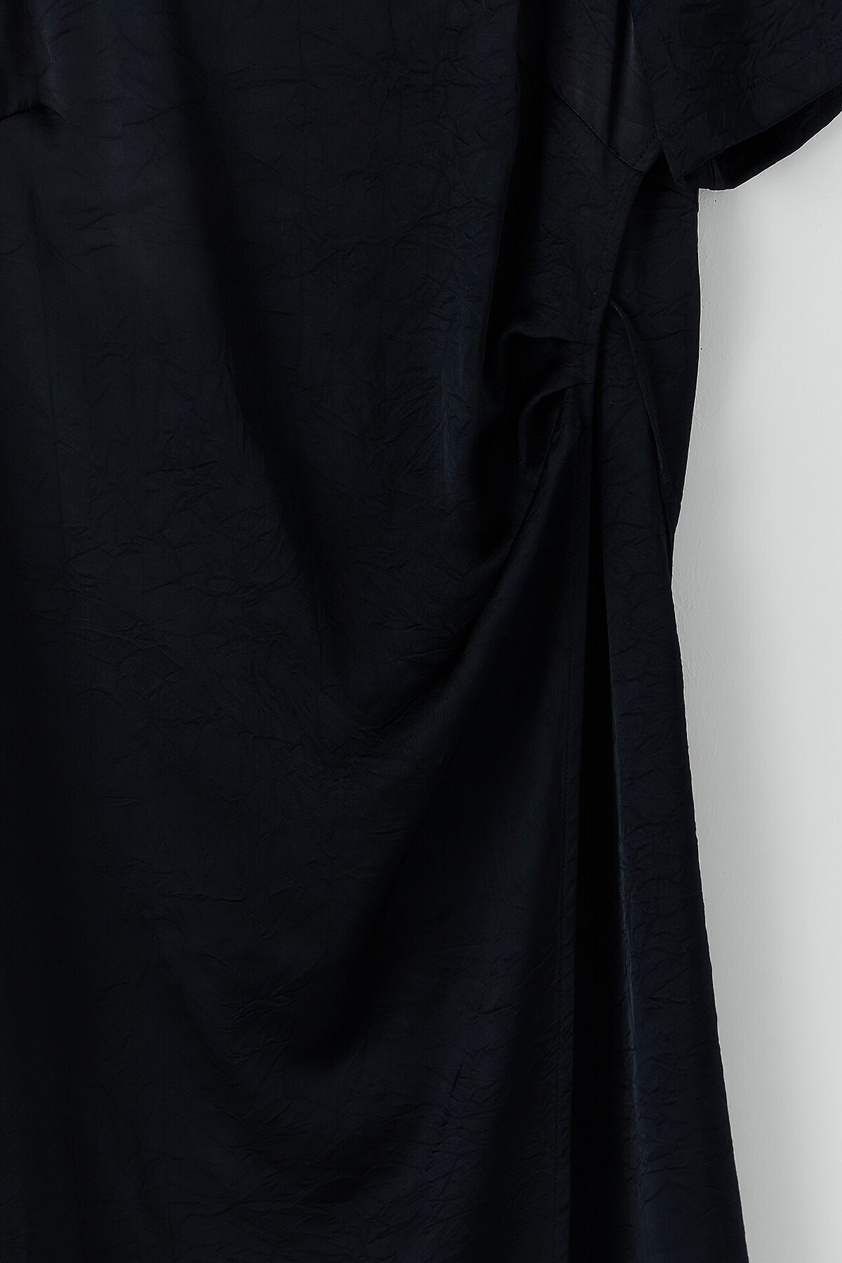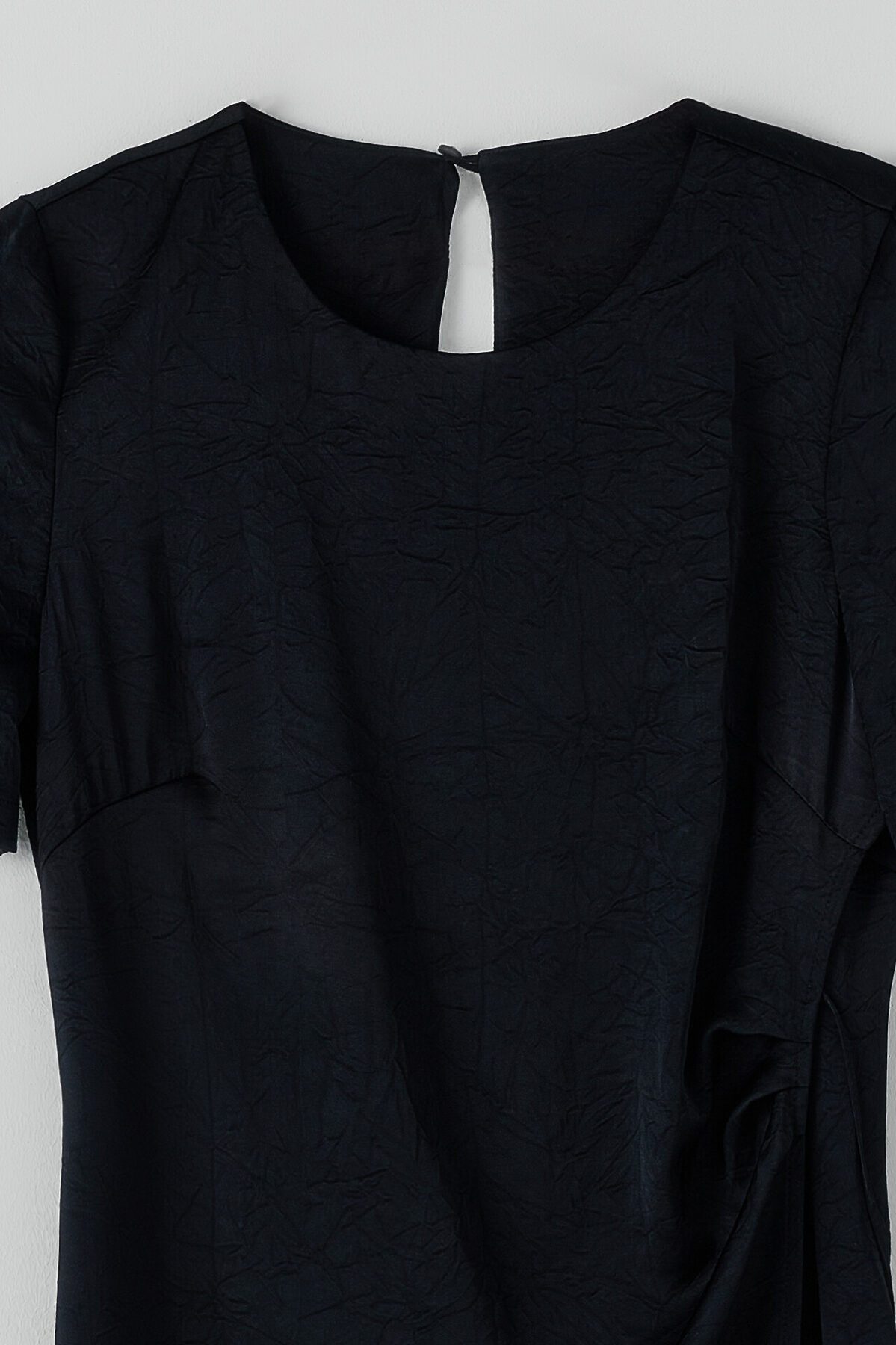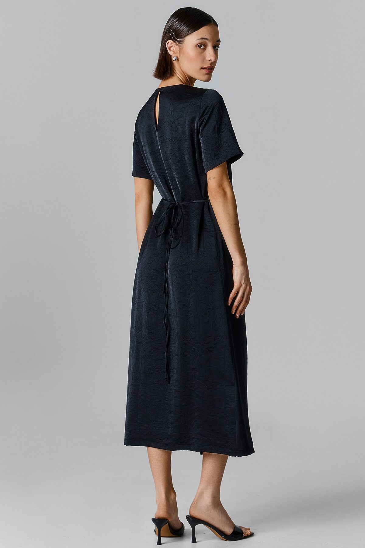 Платье полуприлегающего силуэта, перед и спинка цельнокроенные. Передняя деталь на запах, с завязками. На передней детали заложены складки. Рукава короткие, горловина обработана обтачкой из основного полотна. По спинке вырез-капелька на пуговицу 10мм и жилку тканую (жилка Jw34493, WT4-4). Низ изделия и рукавов в подгибку.