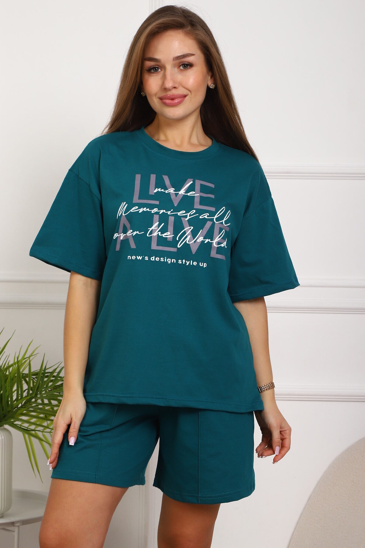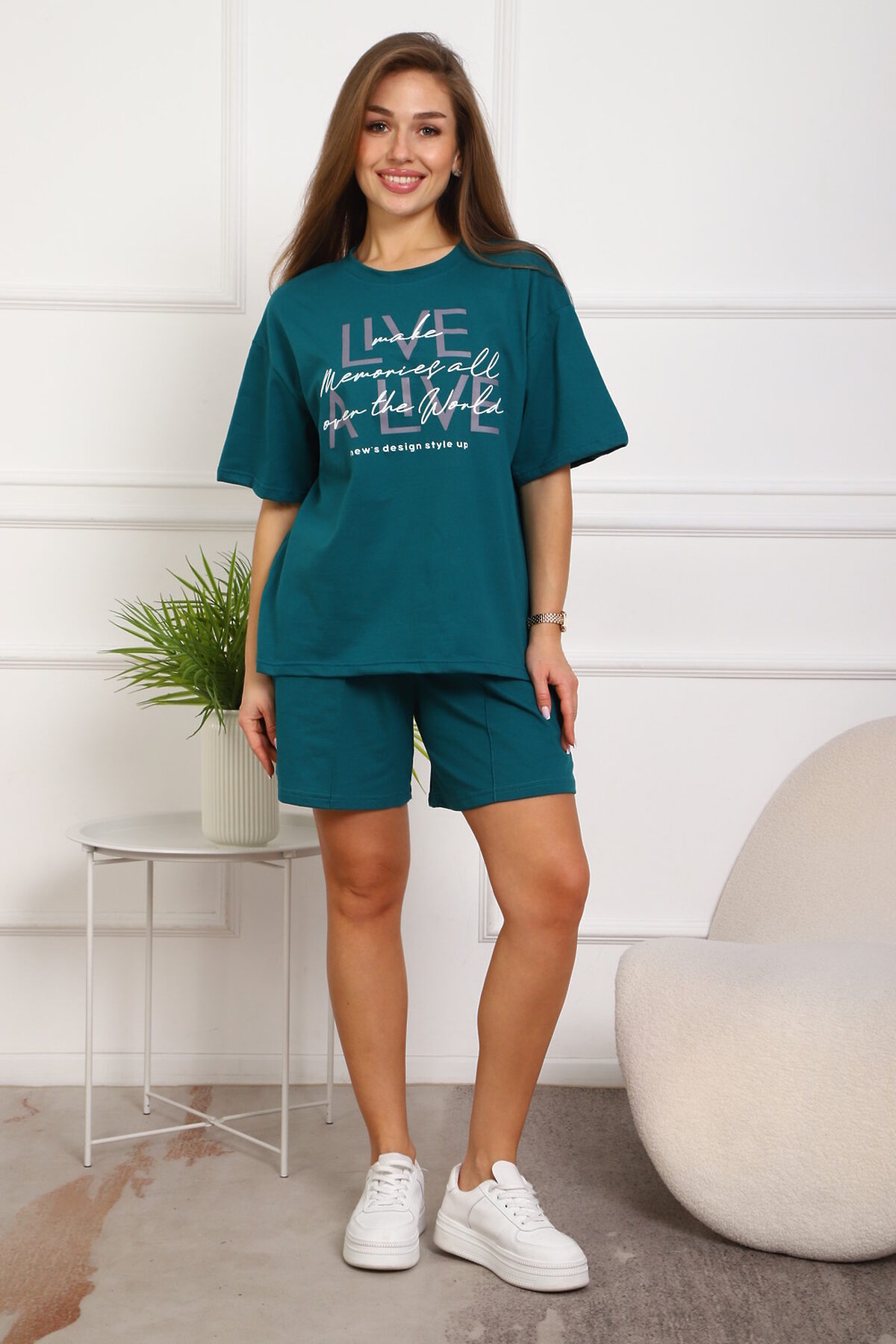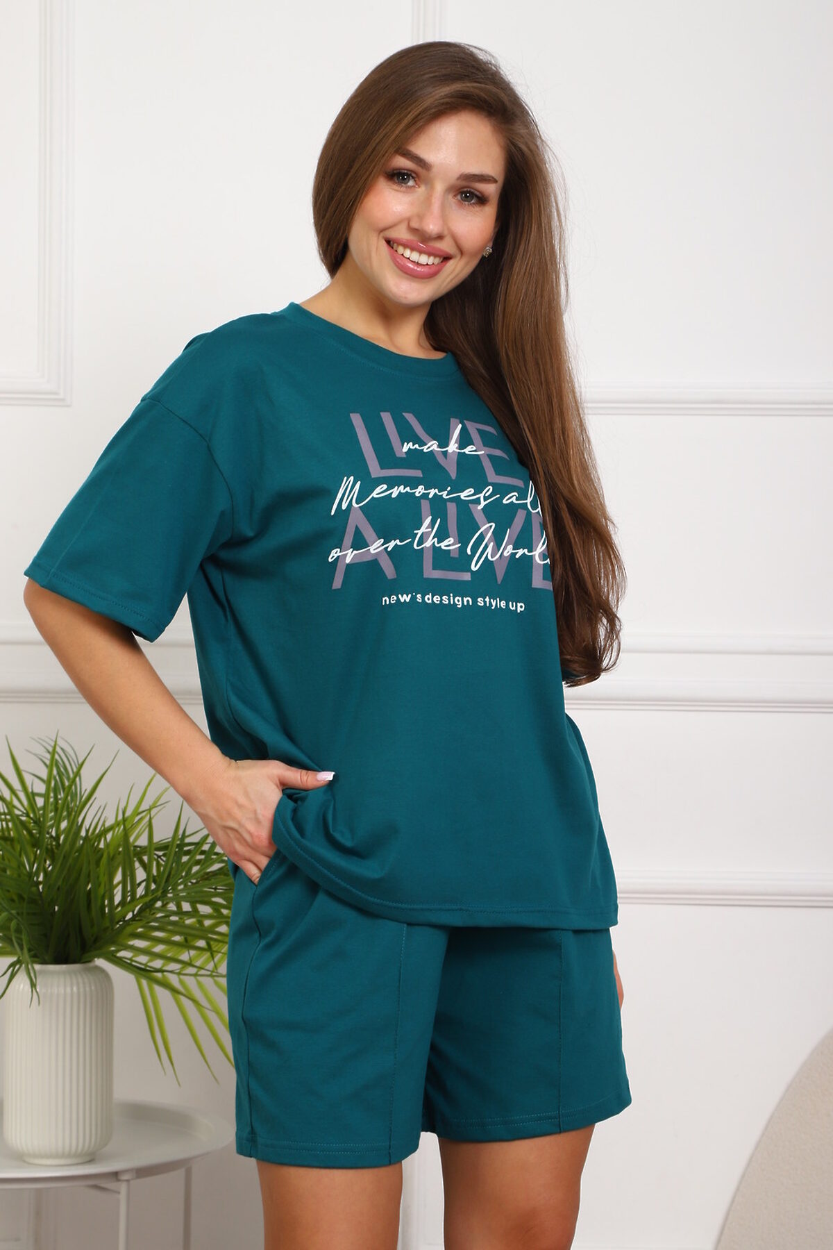 Костюм женский, выполнен из трикотажного полотна кулирка. Костюм состоит из футболки и шорт. Шорты с карманами, со строчкой на передней части полочки вдоль. Футболка свободного силуэта, вточная горловина, на полочке выполнена печать.