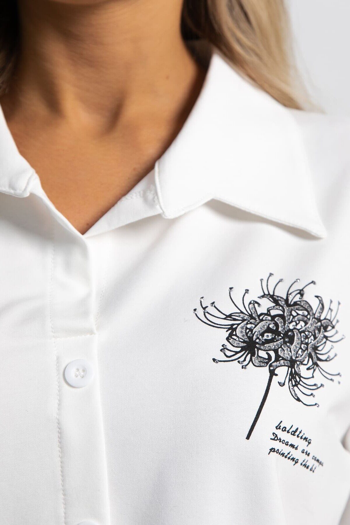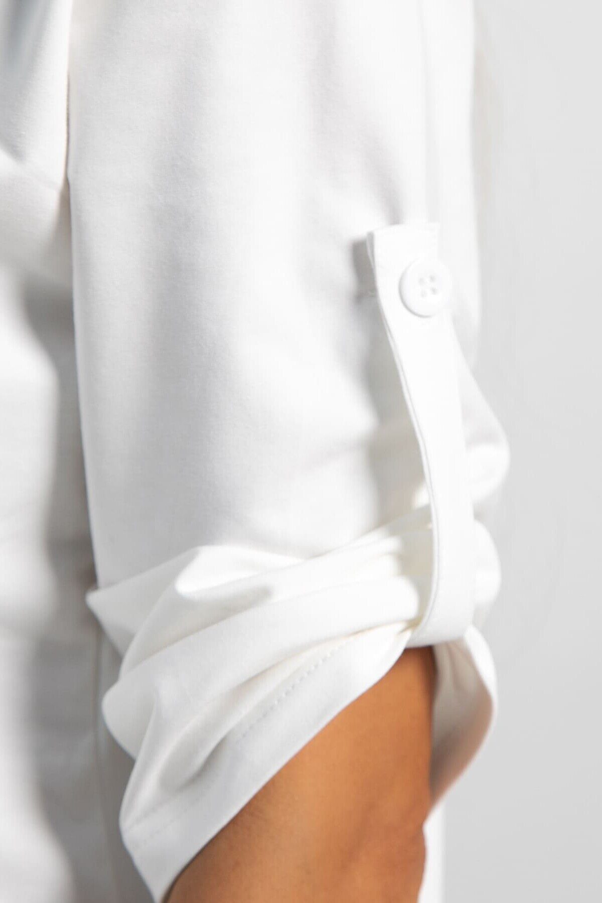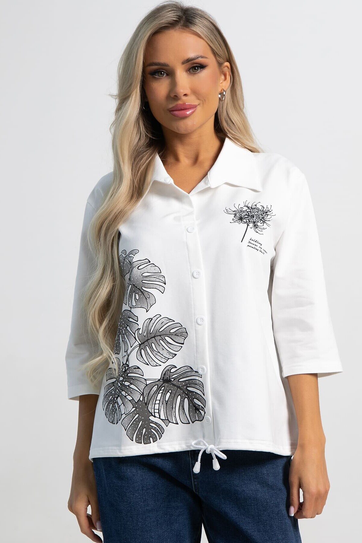 Стильная блуза прямого кроя с втачными рукавами длиной 3/4 — идеальный выбор для повседневного образа. Рукава заканчиваются на пате, придавая изделию изящество. Воротник рубашечного типа с планкой добавляет модели классический и аккуратный вид. Декоративный ряд пуговиц на передней части подчеркивает стиль. Завязка на шнурке на линии низа позволяет регулировать посадку и создавать эффектный силуэт. Эта блуза гармонично сочетается с разными образами, привнося нотки элегантности и комфорта.