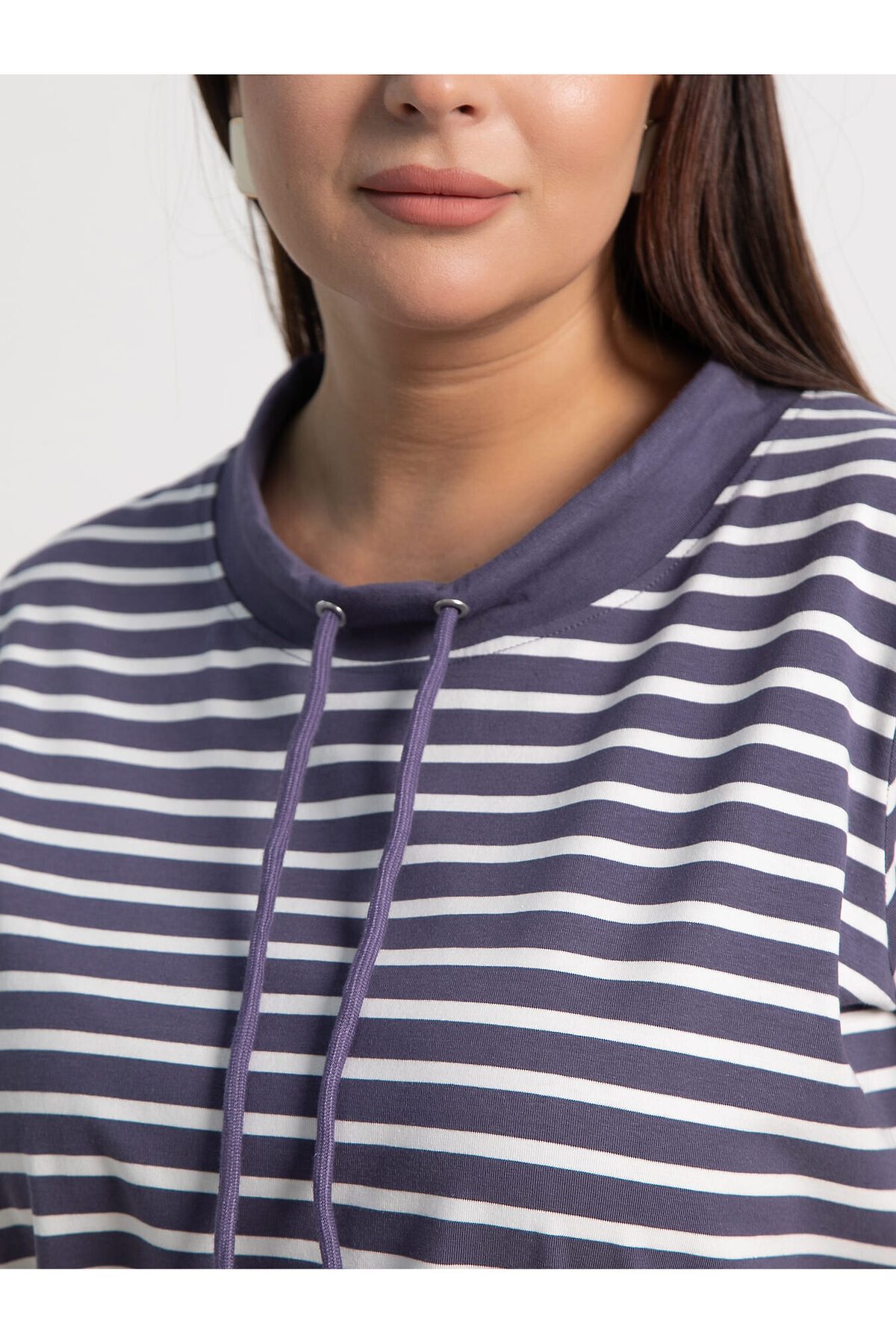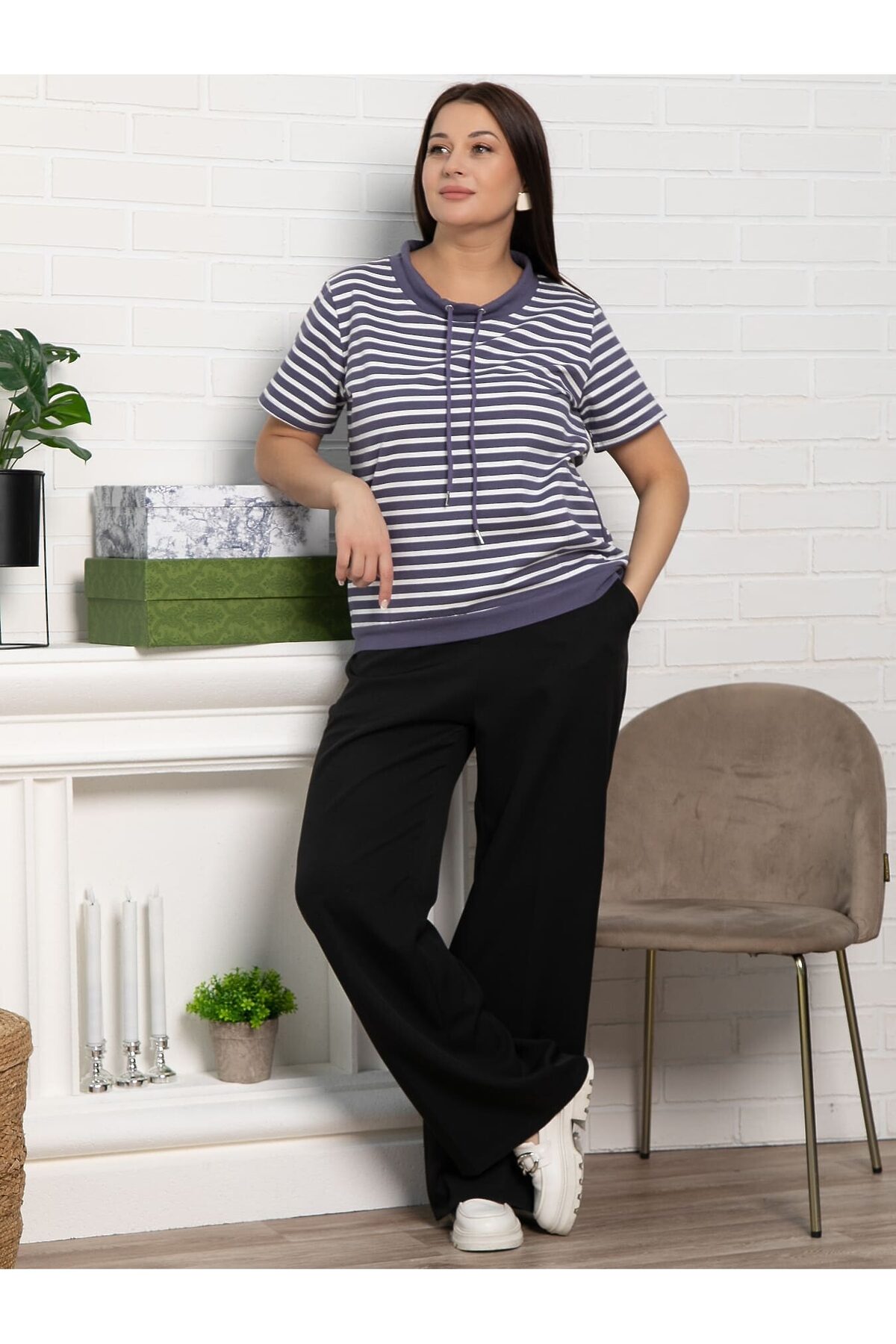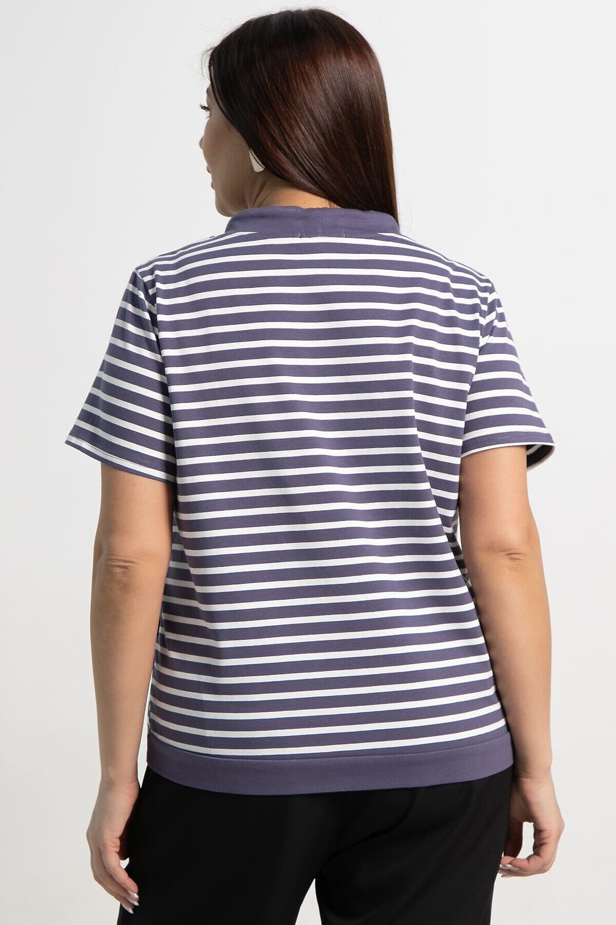 Женская блузка фиолетового цвета в полоску — удобная и стильная вещь для любого гардероба. Короткий рукав и классический дизайн делают ее универсальной и легкой в сочетании с различными элементами одежды. Спереди оформлена завязками. Отличный выбор для создания комфортных и модных повседневных образов.