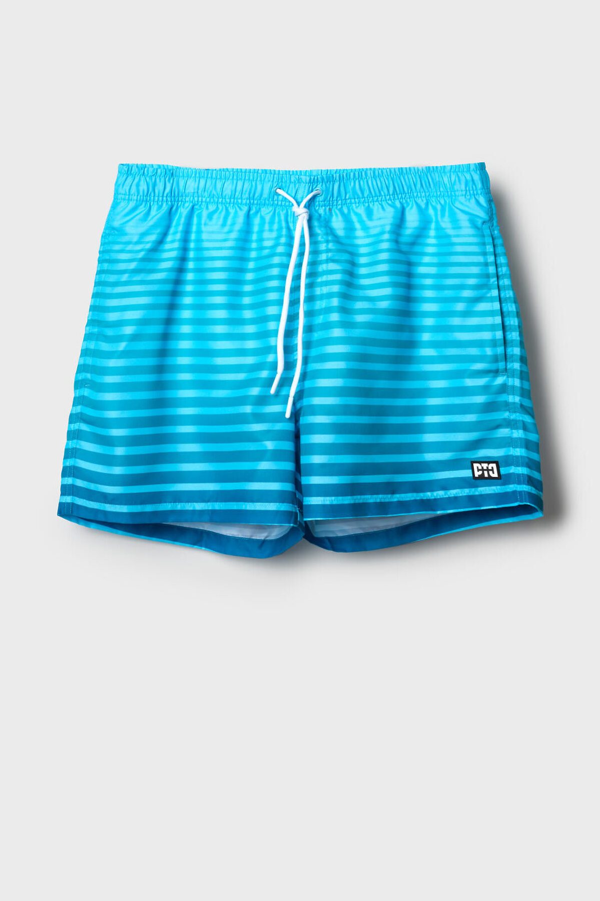 Мужские короткие плавательные шорты из гладкого быстросохнущего материала. Модель выполнена с градиентом от светло-голубого к тёмно-бирюзовому. На талии — эластичный пояс со шнуром. Благодаря UF-защите, ткань сохраняет первоначальный вид даже при длительном пребывании на солнце. Подходит для плавания и активного отдыха.