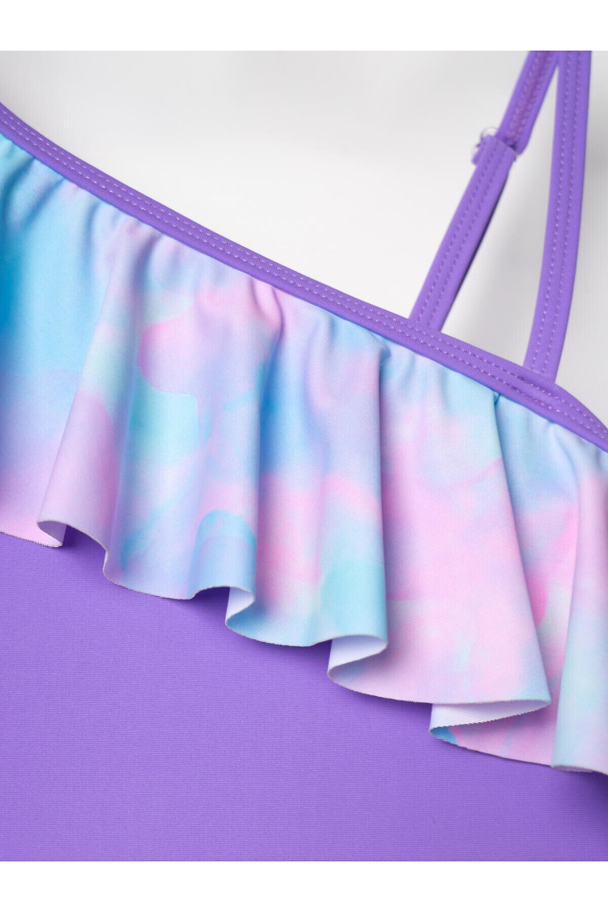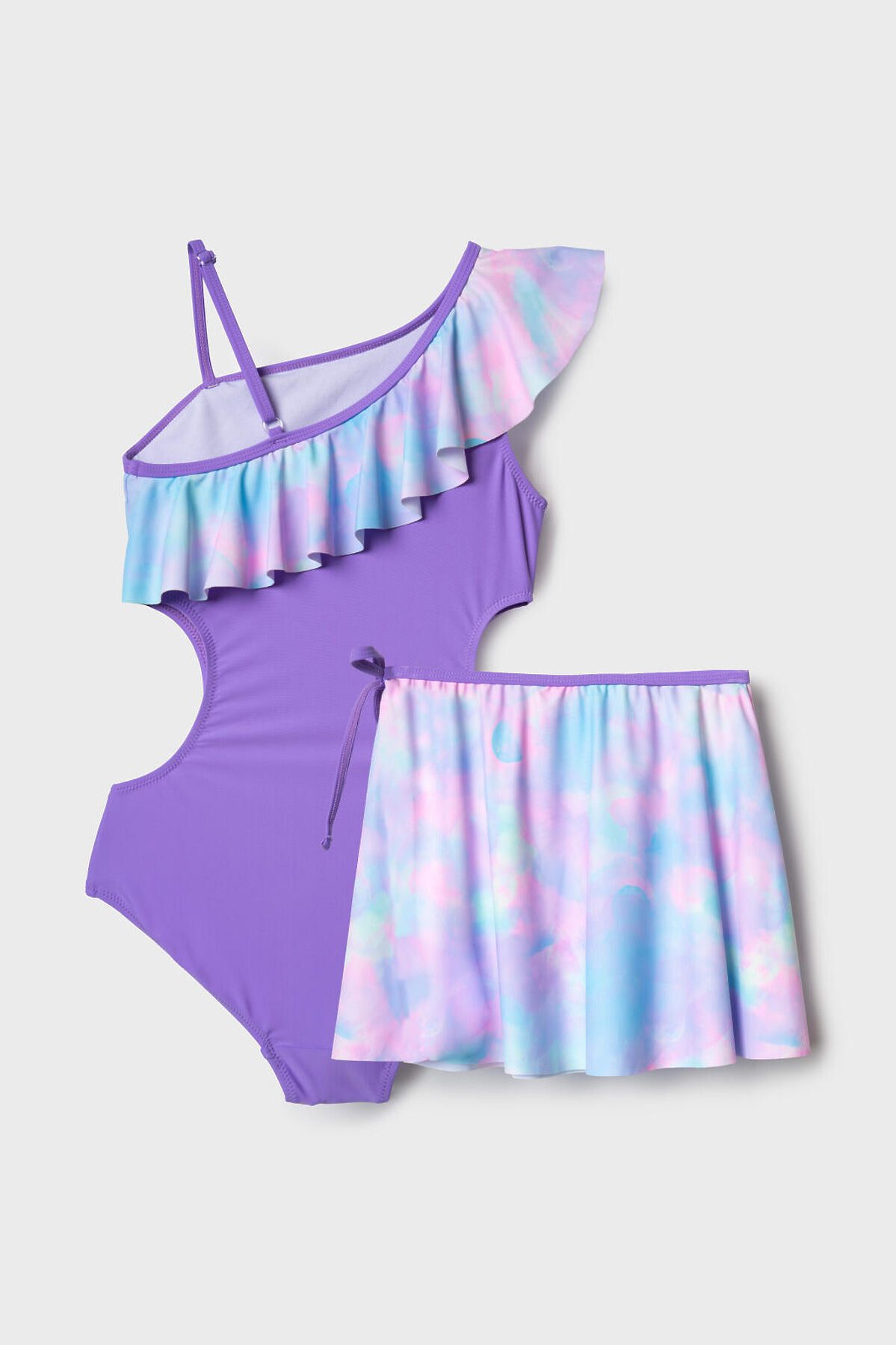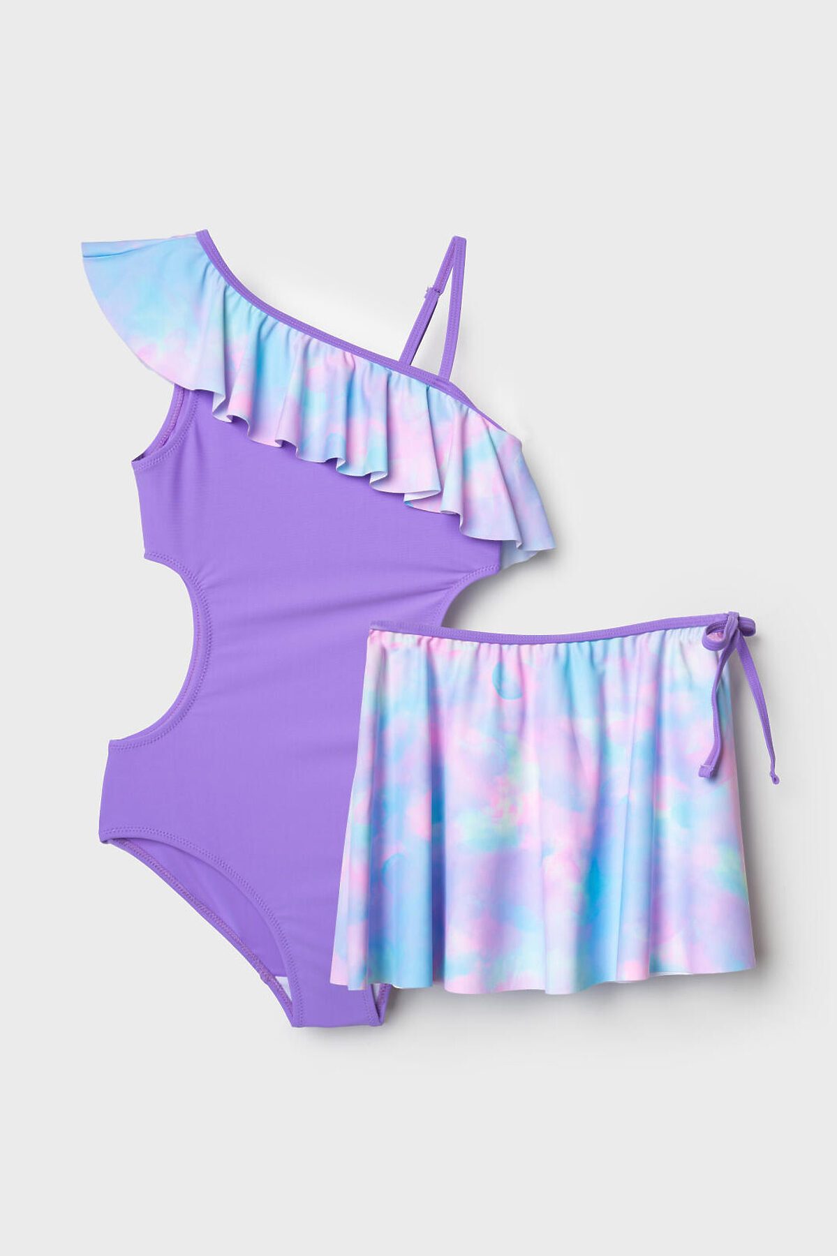Комплект для девочки подростка из купальника и юбки. Купальник выполнен в сиреневом цвете с необычным асимметричным кроем: одно плечо открыто, второе украшено широкой плиссированной оборкой с ярким акварельным принтом. По бокам — фигурные вырезы. В комплект входит отдельная плиссированная юбка с тем же принтом и декоративным бантом на поясе. Изделие выполнено из эластичного материала и дополнено мягкой подкладкой. Подходит для пляжа и бассейна.