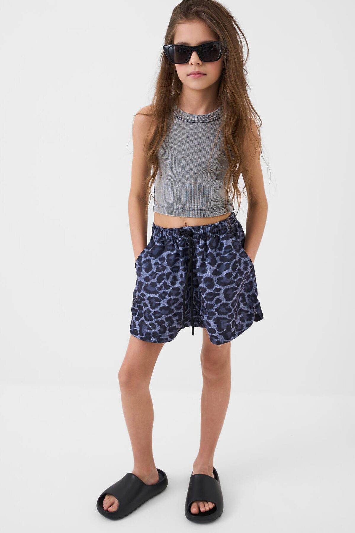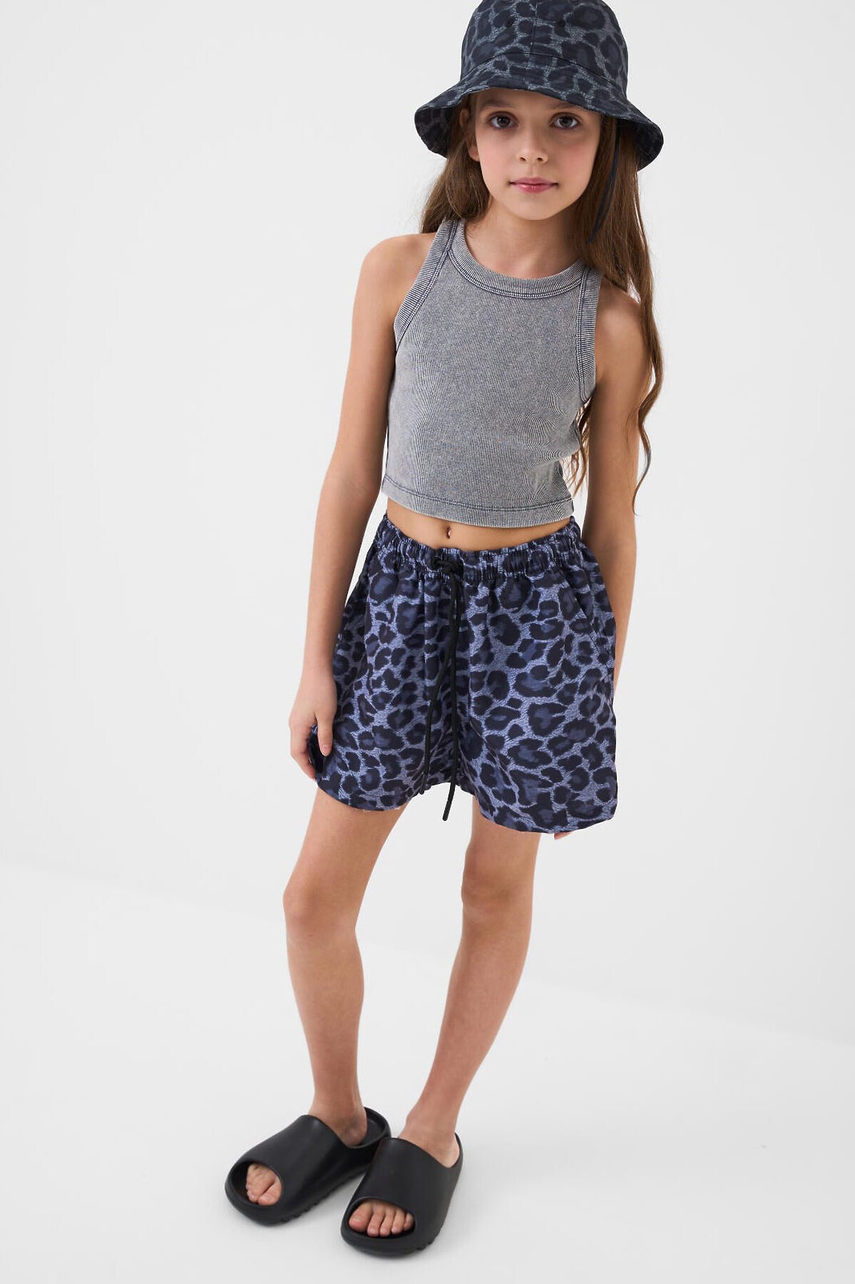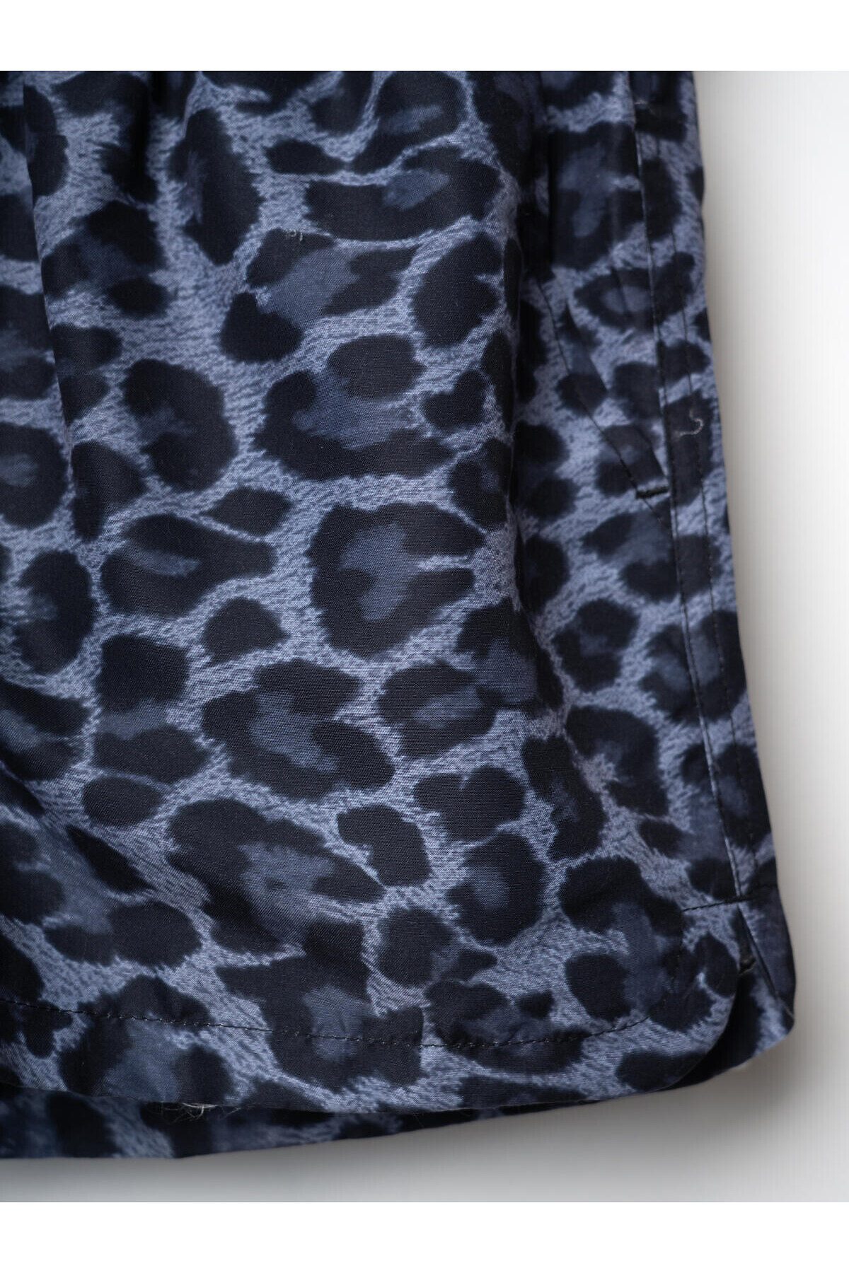 Плавательные шорты средней длины для девочки подростка. Модель с комфортной посадкой на талии и анатомически закруглённым краем по бокам. Выполнены из лёгкой ткани с выразительным леопардовым принтом в серо-чёрной гамме. Внутри — сетчатая подкладка, обеспечивающая комфорт при носке. Шорты дополнены двумя удобными боковыми карманами и шнурком на талии, который помогает отрегулировать посадку. Эластичный пояс обеспечивает хорошее прилегание. Яркий, смелый дизайн и функциональность делают эту модель идеальной для летнего отдыха. Благодаря UF-защите, ткань сохраняет первоначальный вид даже при длительном пребывании на солнце.