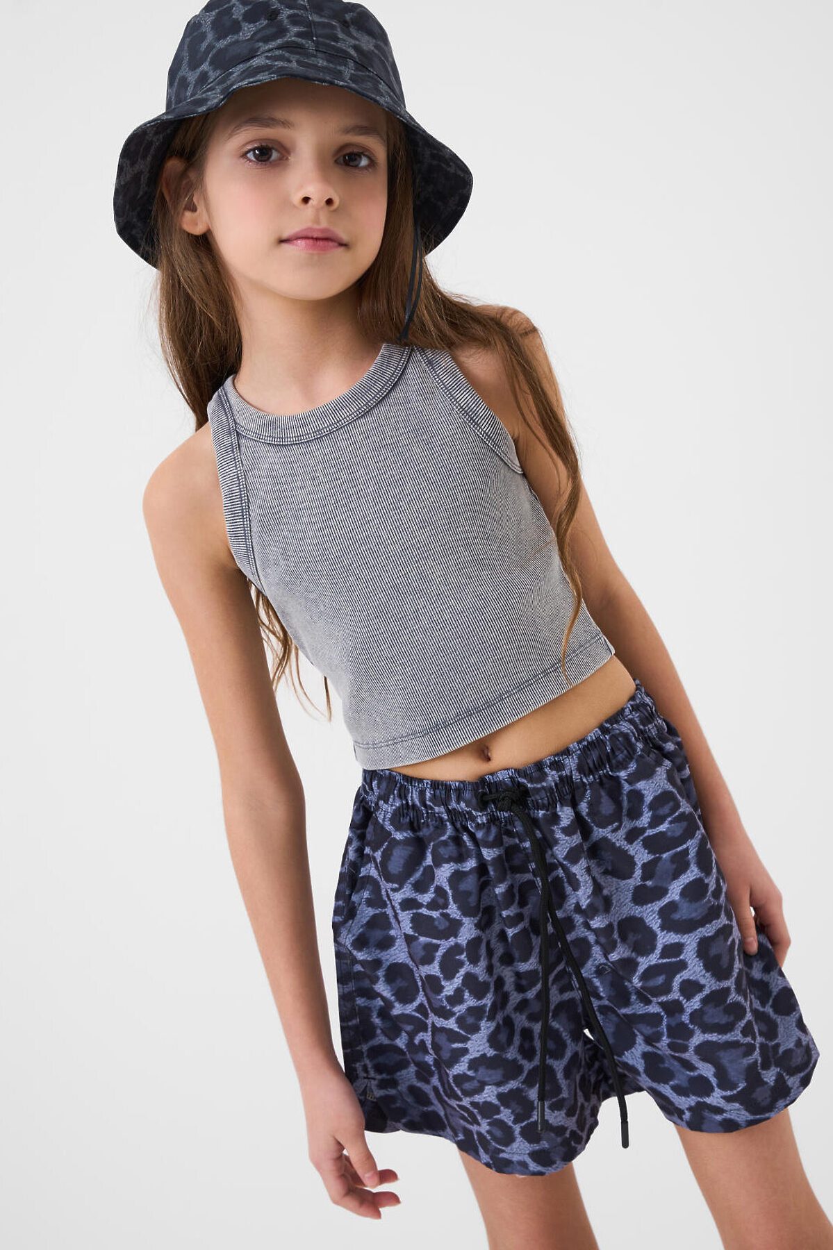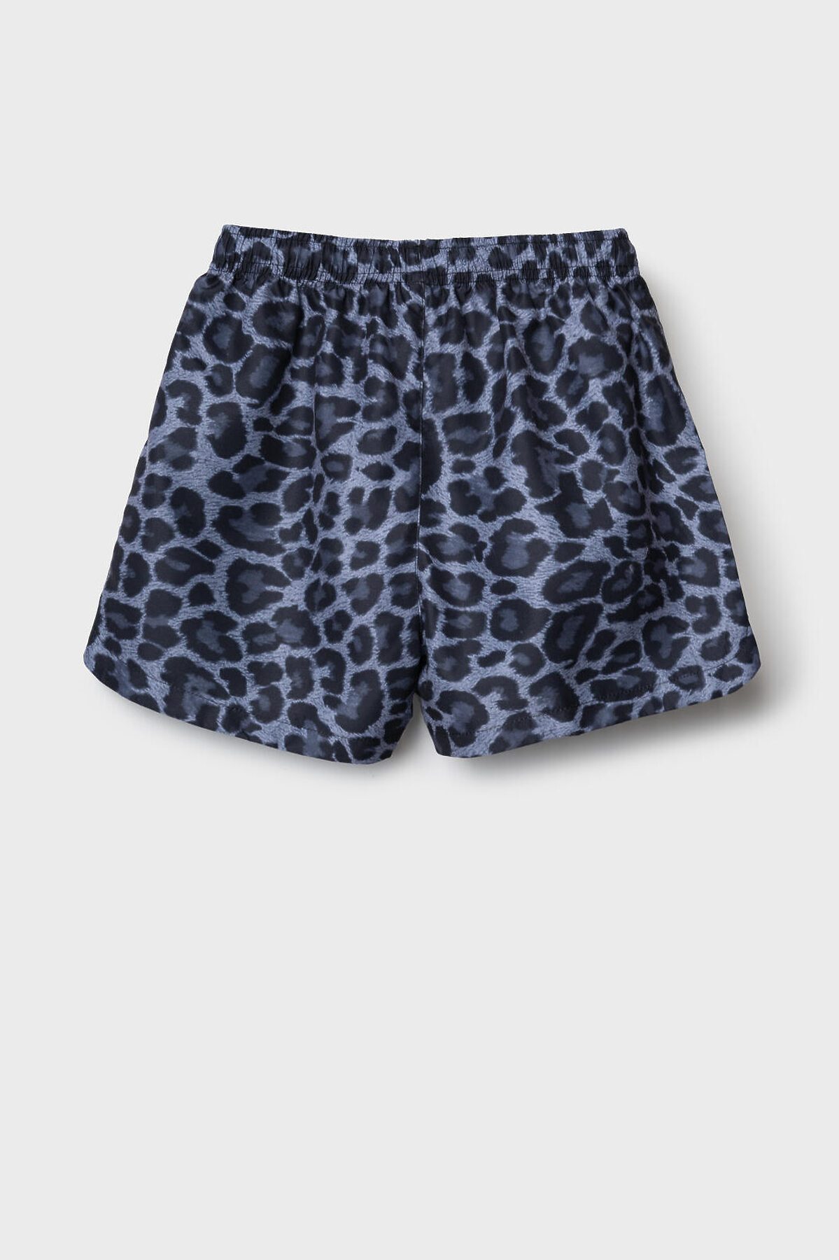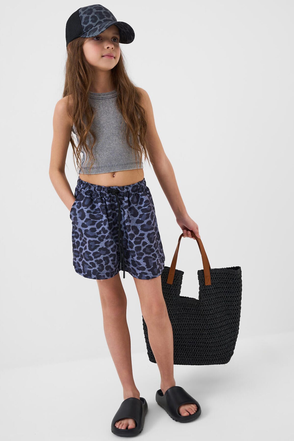 Плавательные шорты средней длины для девочки подростка. Модель с комфортной посадкой на талии и анатомически закруглённым краем по бокам. Выполнены из лёгкой ткани с выразительным леопардовым принтом в серо-чёрной гамме. Внутри — сетчатая подкладка, обеспечивающая комфорт при носке. Шорты дополнены двумя удобными боковыми карманами и шнурком на талии, который помогает отрегулировать посадку. Эластичный пояс обеспечивает хорошее прилегание. Яркий, смелый дизайн и функциональность делают эту модель идеальной для летнего отдыха. Благодаря UF-защите, ткань сохраняет первоначальный вид даже при длительном пребывании на солнце.