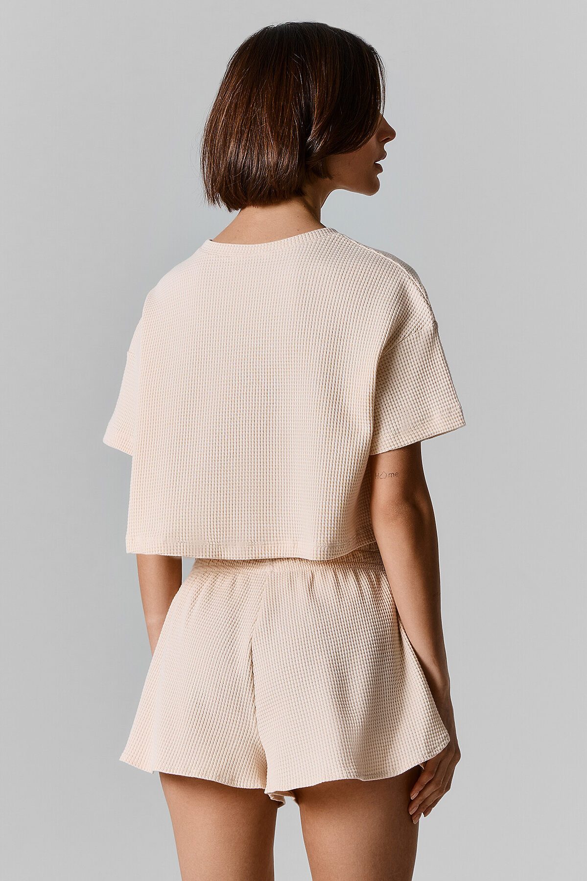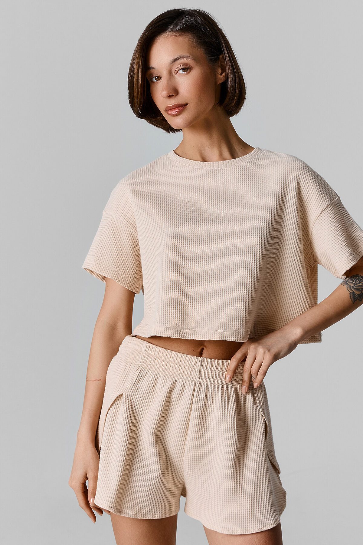 Этот женский домашний комплект — идеальное сочетание комфорта и стиля. Укороченный джемпер прямого силуэта с короткими рукавами и круглой горловиной создает легкий и расслабленный образ. Низ джемпера и рукавов обработан швом в подгибку, что добавляет аккуратности и долговечности изделию. Шорты свободного силуэта с эластичной талией обеспечивают удобство и свободу движений, идеально подходя для домашнего отдыха. Низ шорт обработан швом вподгибку, что подчеркивает качество выполнения. Комплект выполнен из чистого хлопка с вафельной текстурой — мягкого, дышащего материала, который делает его комфортным и приятным для кожи. Отличный выбор для уютных вечеров и расслабленных дней дома!
