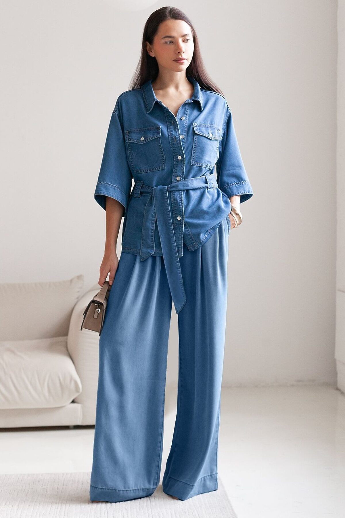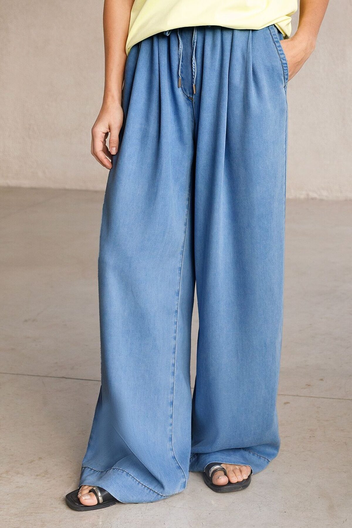 Эффектные брюки-палаццо светло-синего цвета из джинсового лиоцелла плотностью 7,8 OZ отлично подойдут для лето и весну. Свободные и легкие палаццо смотрятся стильно и незаменимые в гардеробе женщин. Благодаря удобному эластичному поясу и защипам в области талии они хорошо садятся на разные типы фигур, скрывают недостатки и создают модный силуэт. Такие повседневные широкие брюки комфортно носить девушкам и женщинам маленького и высокого роста, представлена различная ростовка. Их фасон универсальный: оптимален для офиса, прогулок, встреч или отдыха. Ткань сочетает прочность и мягкость лиоцелла с вискозой, что делает её невероятно комфортной, дышащей, устойчивой к сминанию и идеально подходящей для чувствительной кожи. Благодаря нежным тактильным ощущениям, будто шелк, от которого ощущается приятная прохлада, штаны отлично подходят для создания легких летних образов или стильных ансамблей на каждый день засчет своей универсальности. Тонкие джинсы можно сочетать в стиле кэжуал, а также создавать монохромные образы или добавлять яркие акценты с помощью аксессуаров. Брюки-палаццо гармонично сочетаются с разной обувью и верхом, что делает их отличным выбором для любого случая. Рекомендуем сочетать с артикулами: D53.000, D59.018, D59.020, D59.021