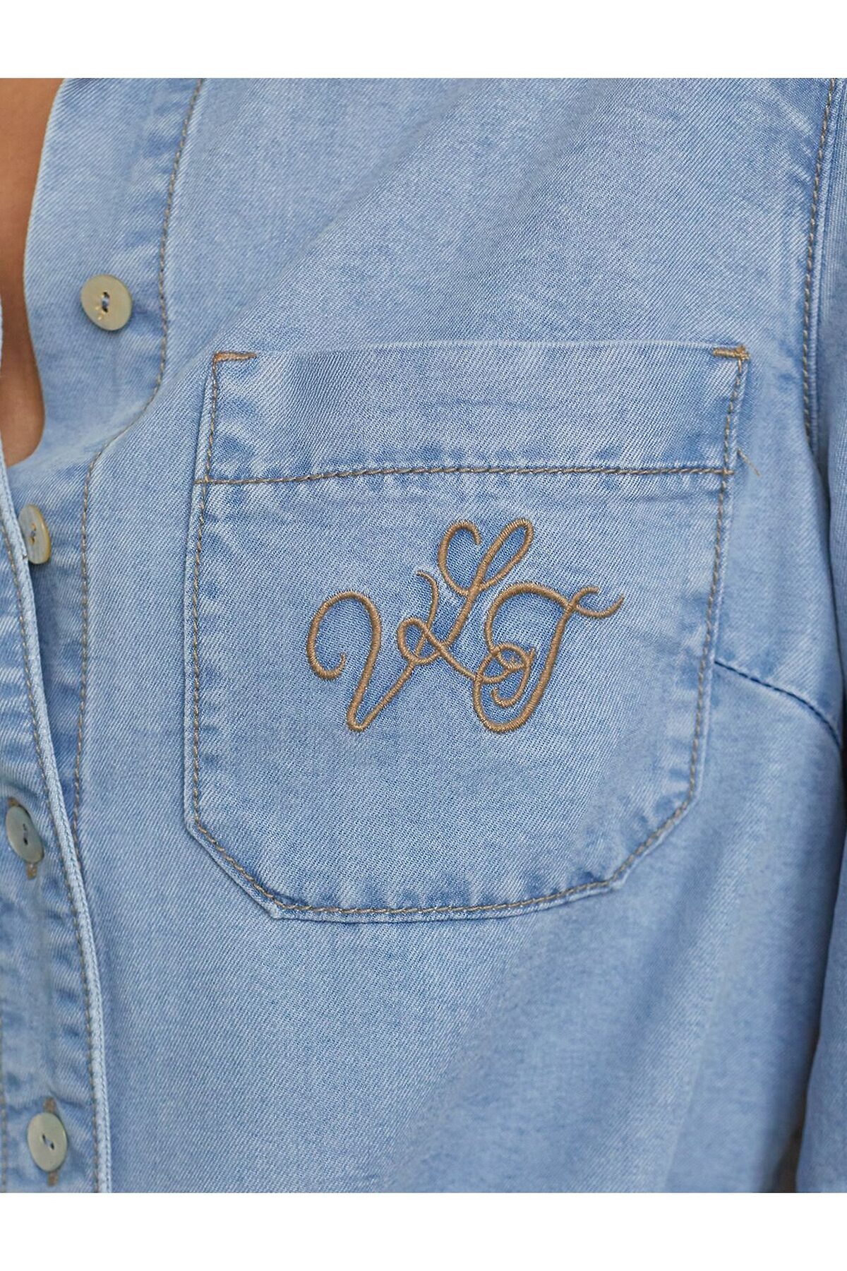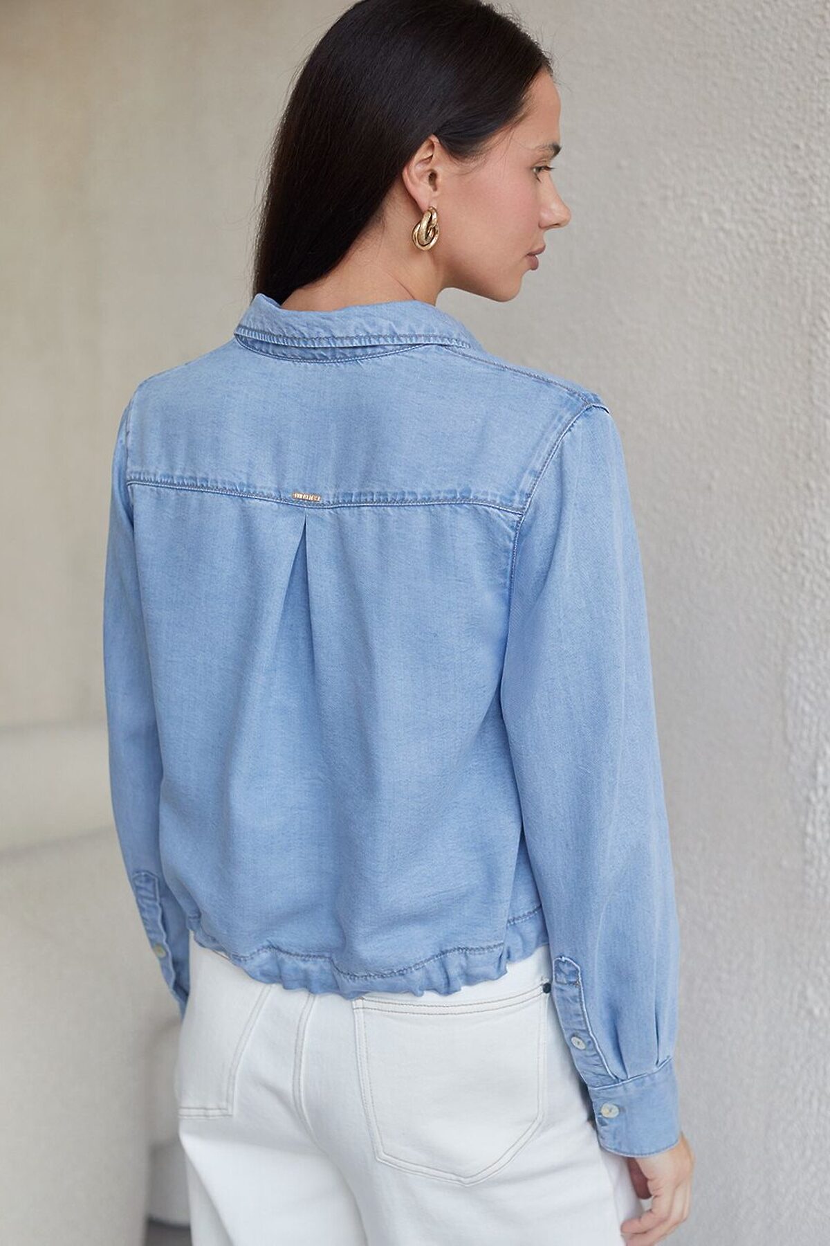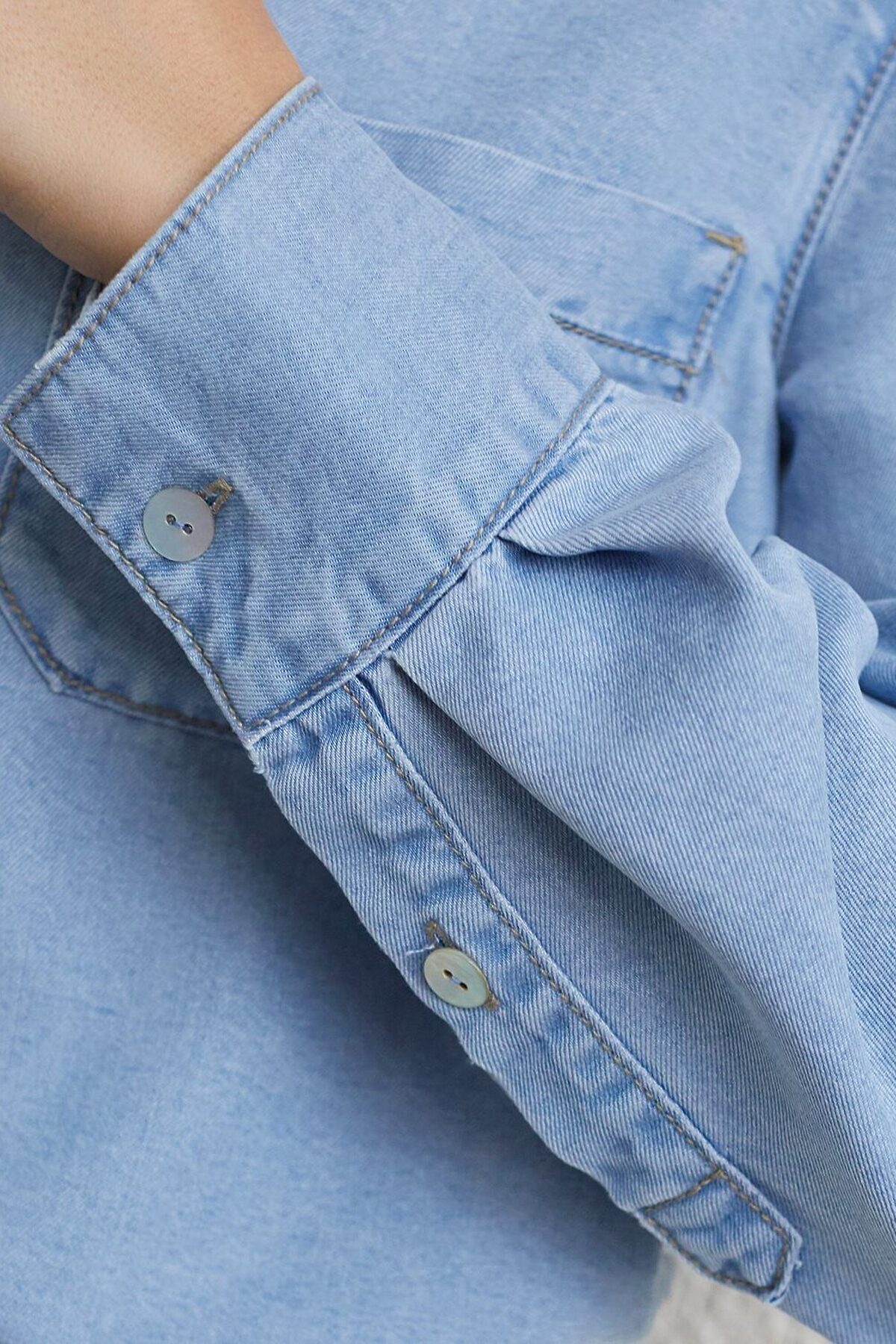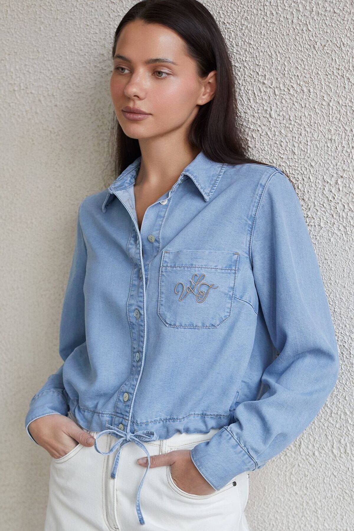 Укороченная стильная блузка светло-голубого цвета с кулиской по низу выполнена из мягкого джинсового лиоцелла плотностью 7,8 OZ, который отлично держит форму и обеспечивает комфортную посадку на любую фигуру. Кулиска сформирует красивый силуэт, позволяя легко регулировать длину по желанию и подчеркнет достоинства фигуры, не стесняя движений. Короткая джинсовая рубашка на пуговицах с отложным воротником придаст образу стильный и современный вид. Практичная деталь — карман на груди с аккуратной вышивкой в виде логотипа бренда - украшает изделие. Ткань сочетает прочность и мягкость лиоцелла с вискозой, что делает её невероятно комфортной, дышащей, устойчивой к сминанию и идеально подходящей для чувствительной кожи. Благодаря нежным тактильным ощущениям, будто шелк, от которого ощущается приятная прохлада, рубашка отлично подходит для создания легких летних образов или стильных ансамблей на каждый день засчет своей универсальности. Длинный рукав гарантирует свободу движений и удобство на весь день. Джинсовую блузку можно сочетать в стиле кэжуал, а также создавать монохромные образы или добавлять яркие акценты с помощью аксессуаров. Эта джинсовая рубашка на пуговицах станет базовым элементом гардероба для тех, кто ценит сочетание моды и удобства. Рекомендуем сочетать с артикулами: D54.257, D56.127, D54.239