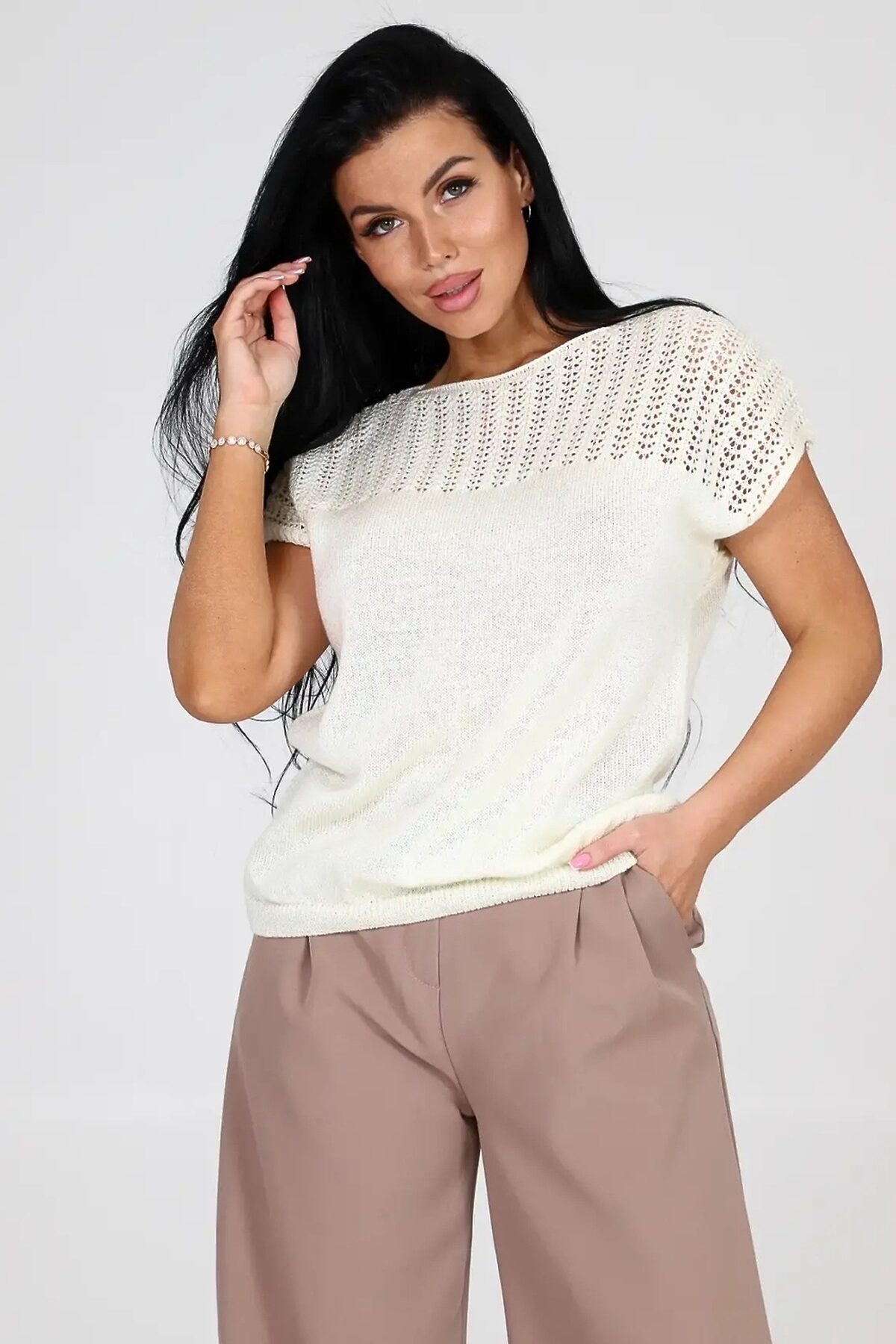 Невероятно мягкий и легкий материал, создаст стильный нарядный и модный образ и станет неотъемлемой частью вашего гардероба, благодаря свободному крою скрывает все лишнее. Наша вязанная футболка женская оверсайз - это идеальный выбор для тех, кто ценит комфорт, стиль и моду. Футболка женская oversize ажурная имеет длинную посадку, что делает ее универсальной для различных типов фигуры. Она также подходит для беременных женщин, благодаря своей приталенной посадке и возможности растягиваться. Уникальный узор и оверсайз силуэт делает эту футболку модной и актуальной. Вы можете носить ее как в повседневной жизни или дома, так и на специальных мероприятиях или в офис под пиджак. Она идеально сочетается с джинсами, юбками или шортами, также с деловым стилем и подойдет полным женщинам больших размеров, создавая модный образ. Вязаная ажурная текстура добавляет особый шарм и интригу этой футболке зимой, осенью ,весной и летом. Она привлекает внимание и позволяет создавать разнообразные образы. Будьте стильными и уверенными в себе с нашей вязанной ажурной oversize футболкой. Она подчеркнет вашу индивидуальность и добавит неповторимости в ваш образ на прогулке или в ресторане на празднике.