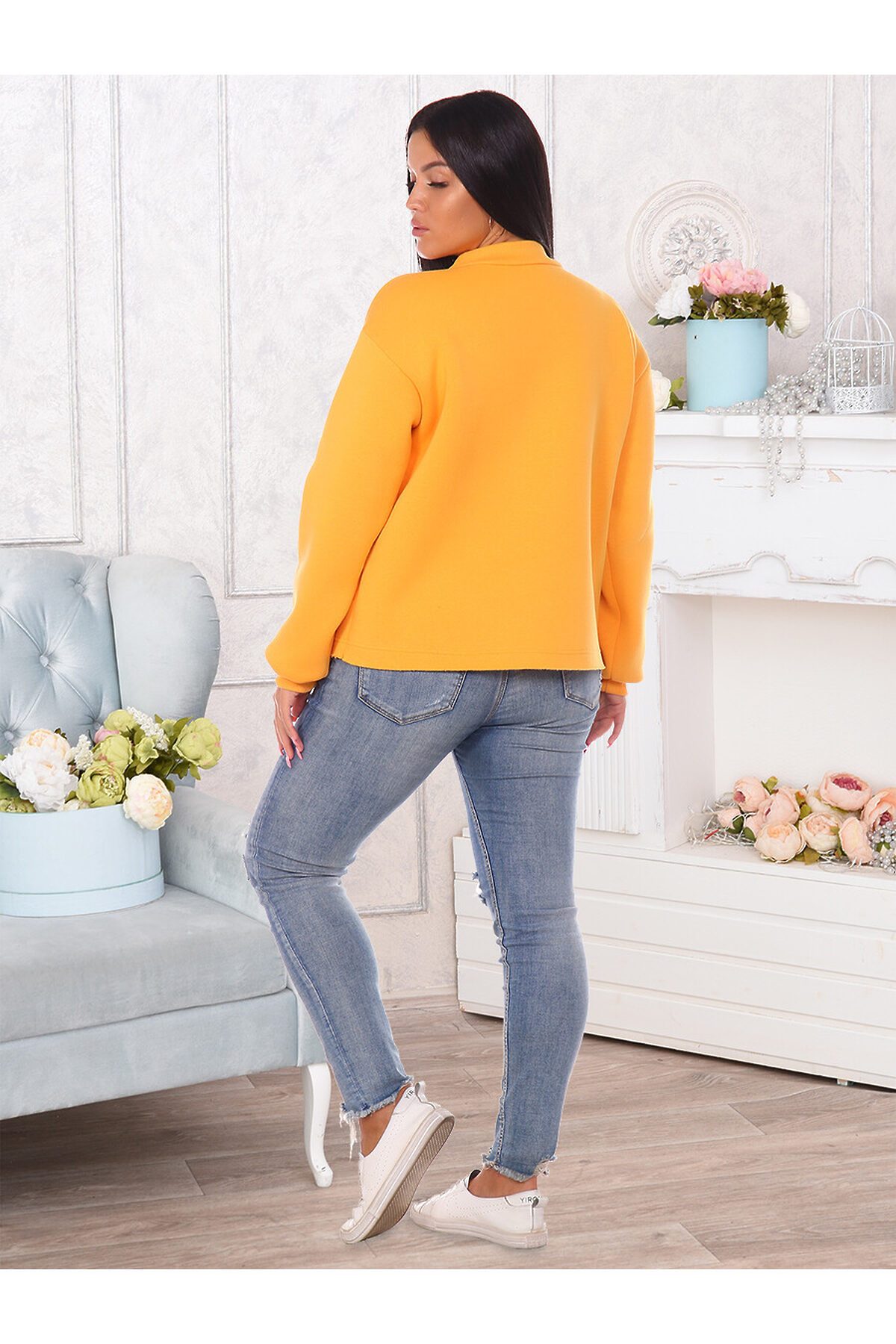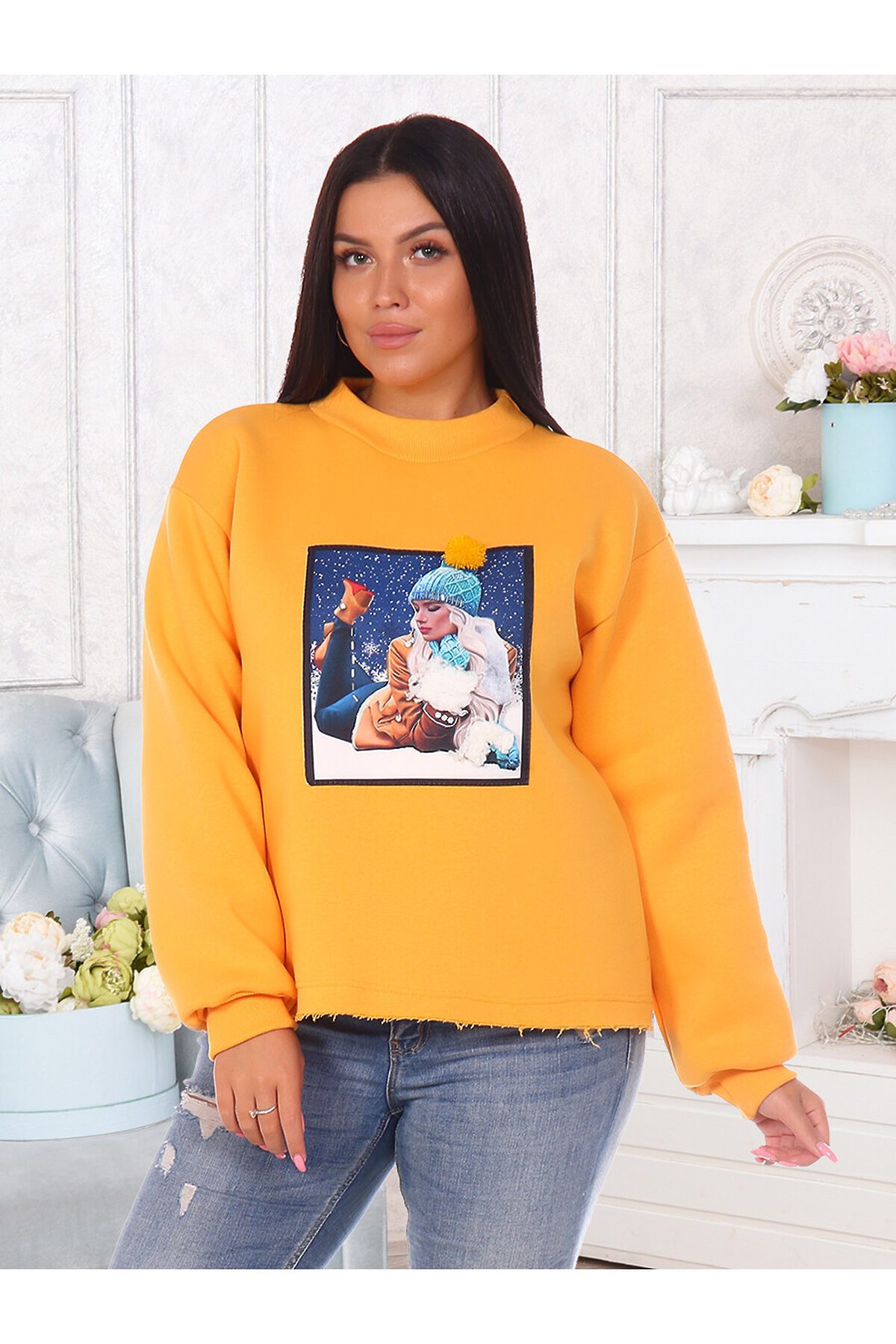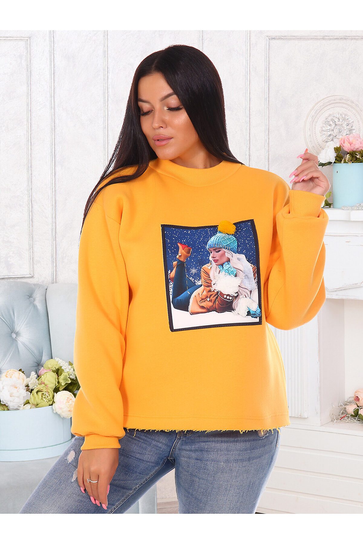 Толстовка женская утепленная с оригинальной нашивкой в технике 3D. Манжеты и горловина выполнены из кашкорсе, нижний срез толстовки оставлен открытым.