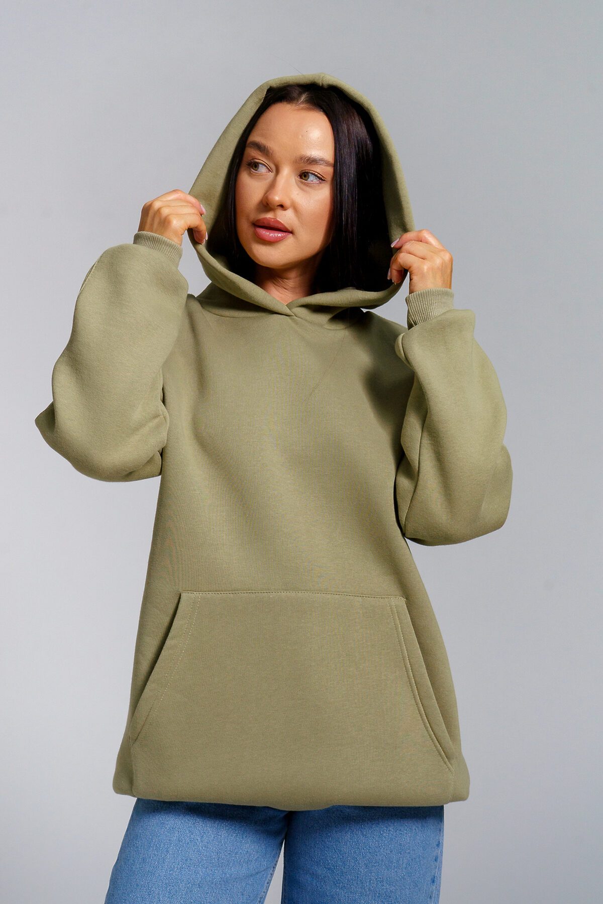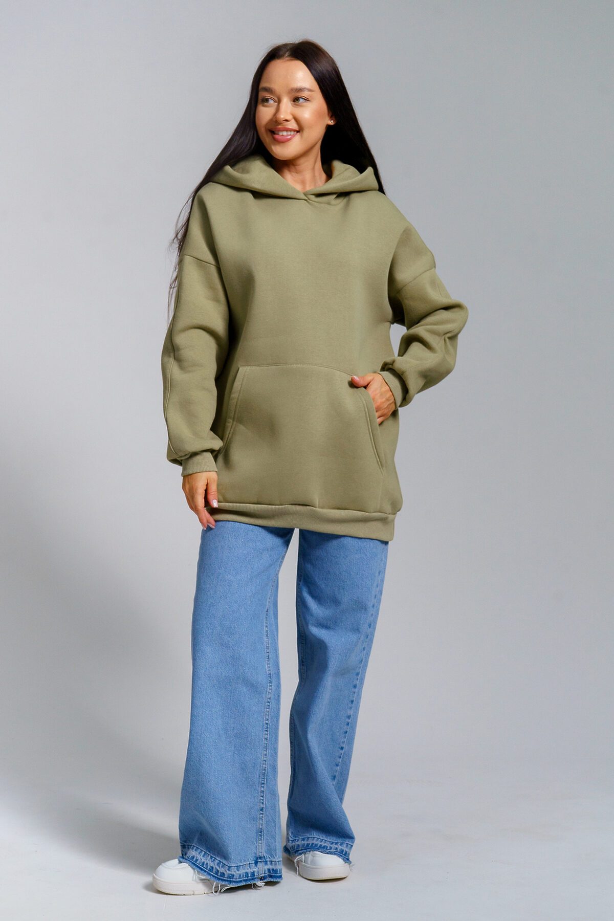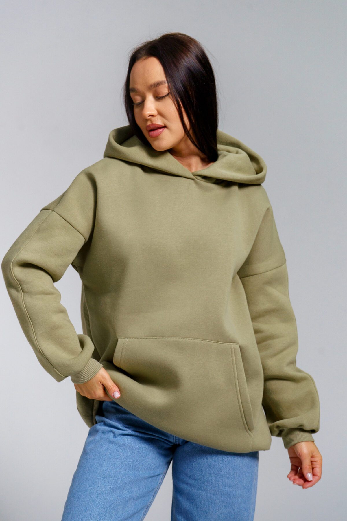 Толстовка из футера с начесом объемного покроя. Двойной капюшон, карман-кенгуру. Срезы обработаны кашкорсе в цвет основной ткани.