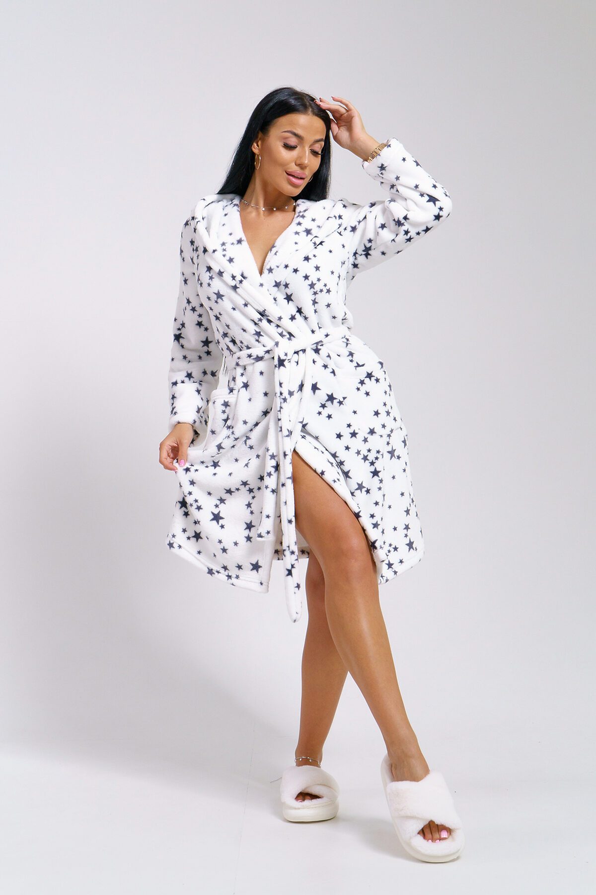 Запашной халат с капюшоном и длинными рукавами. В нижней части изделия два накладных кармана. В комплекте пояс.