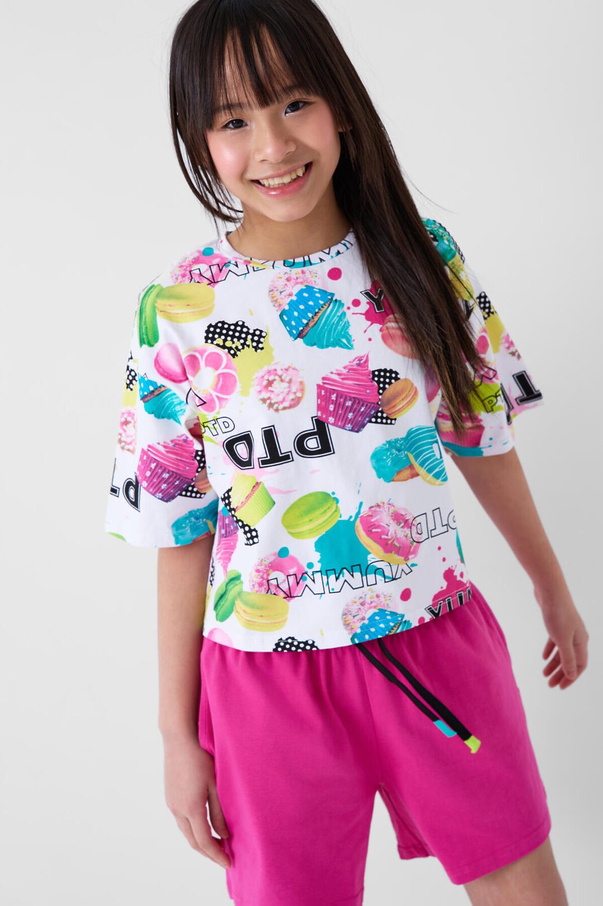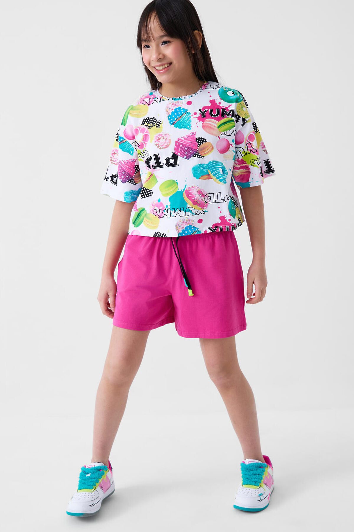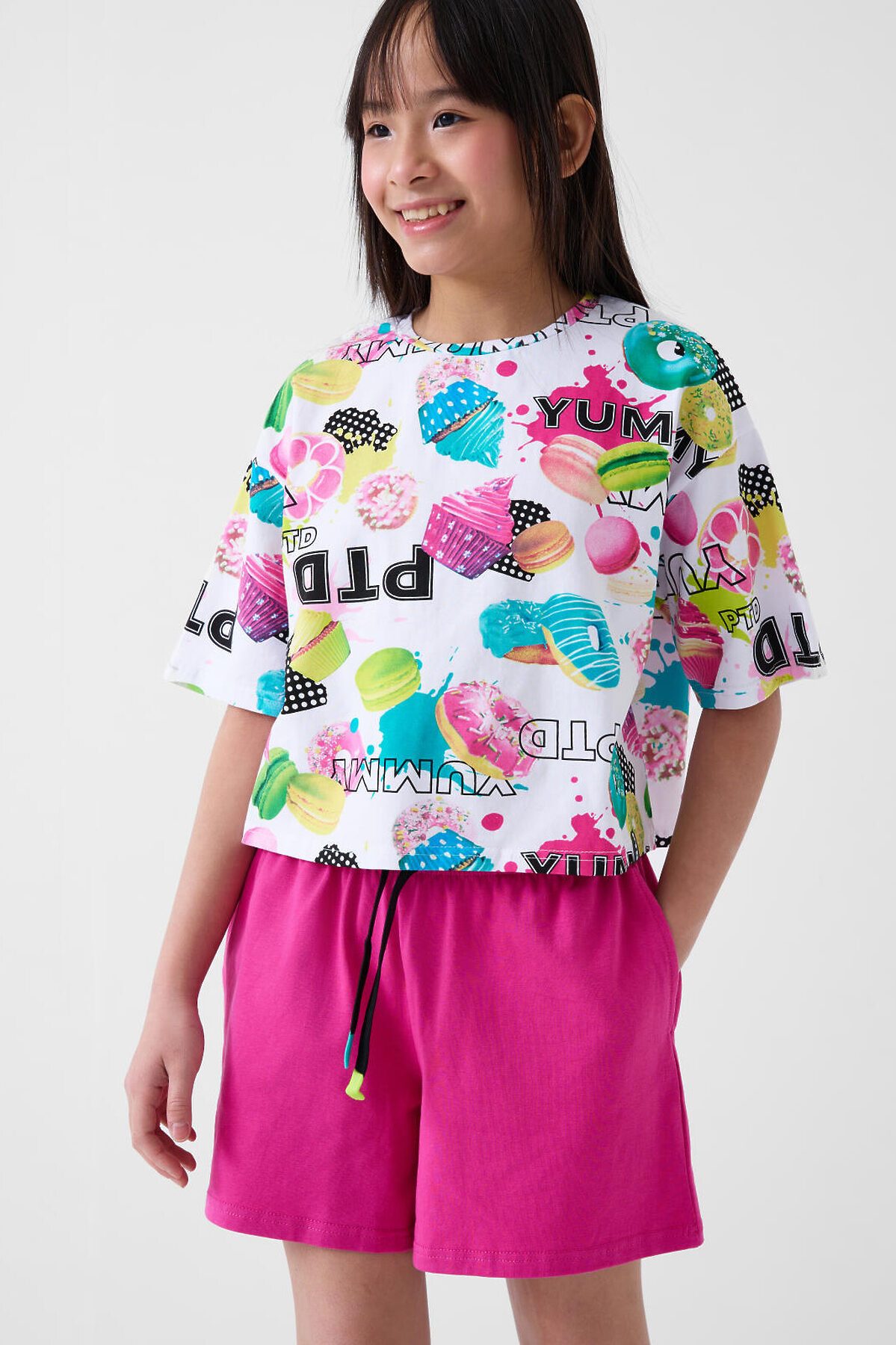 Стильный костюм для девочки подростка. Состоит из футболки с коротким рукавом и шорт. Выполнен из хлопкового трикотажа. Укороченная футболка оверсайз с красочным принтом. Шорты свободные, короткие, хорошо сидят на талии благодаря эластичному поясу и регулирующему шнурку. Удобные боковые карманы.