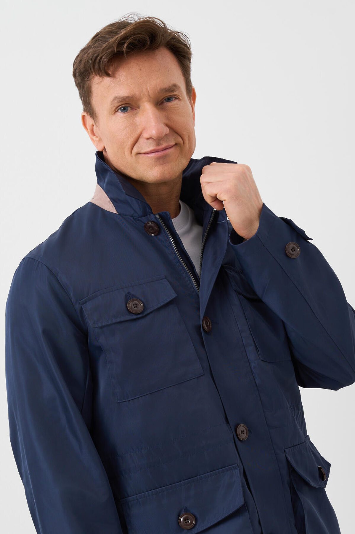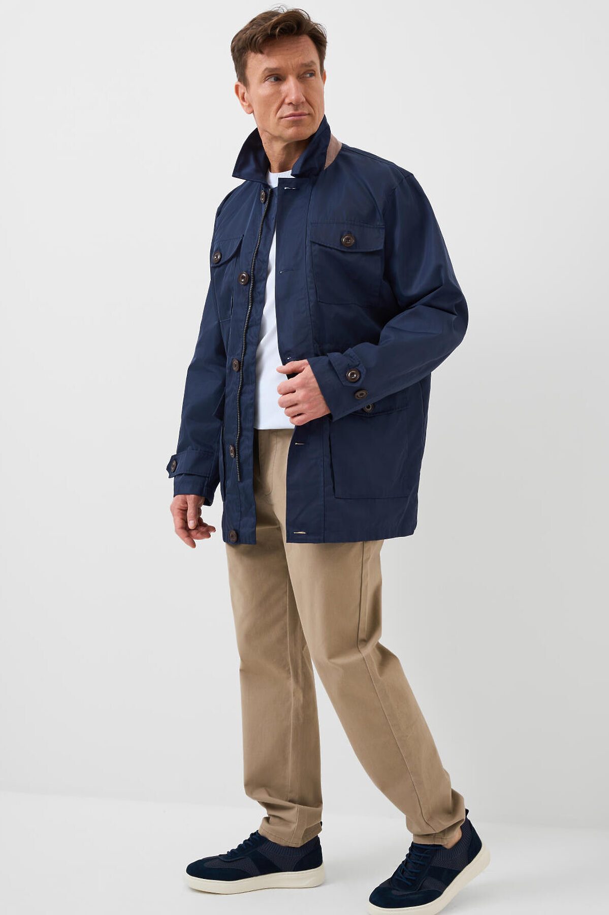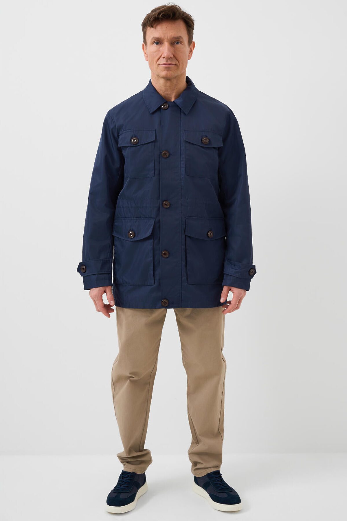 Мужская ветровка с классическим отложным воротником. Температурный режим от +20С до +10С. Ткань с ветрозащитным и водоотталкивающим покрытием. Внутри гладкая подкладка. Спереди расположены четыре накладных кармана на пуговицах. Центральная застёжка — молния с двумя бегунками, скрытая под ветрозащитной планкой на пуговицах. По талии вшит регулируемый шнур, чтобы подогнать изделие по фигуре. Рукава длинные, с манжетами на пуговицах. Внутри — два внутренних кармана на молнии.
